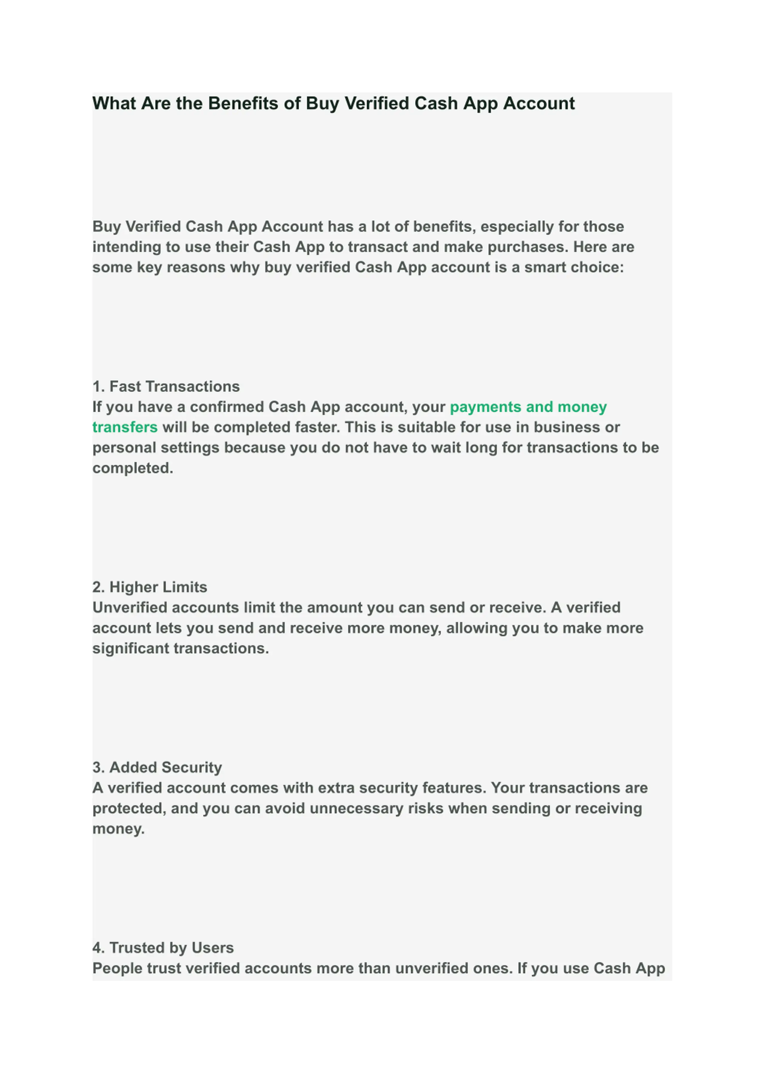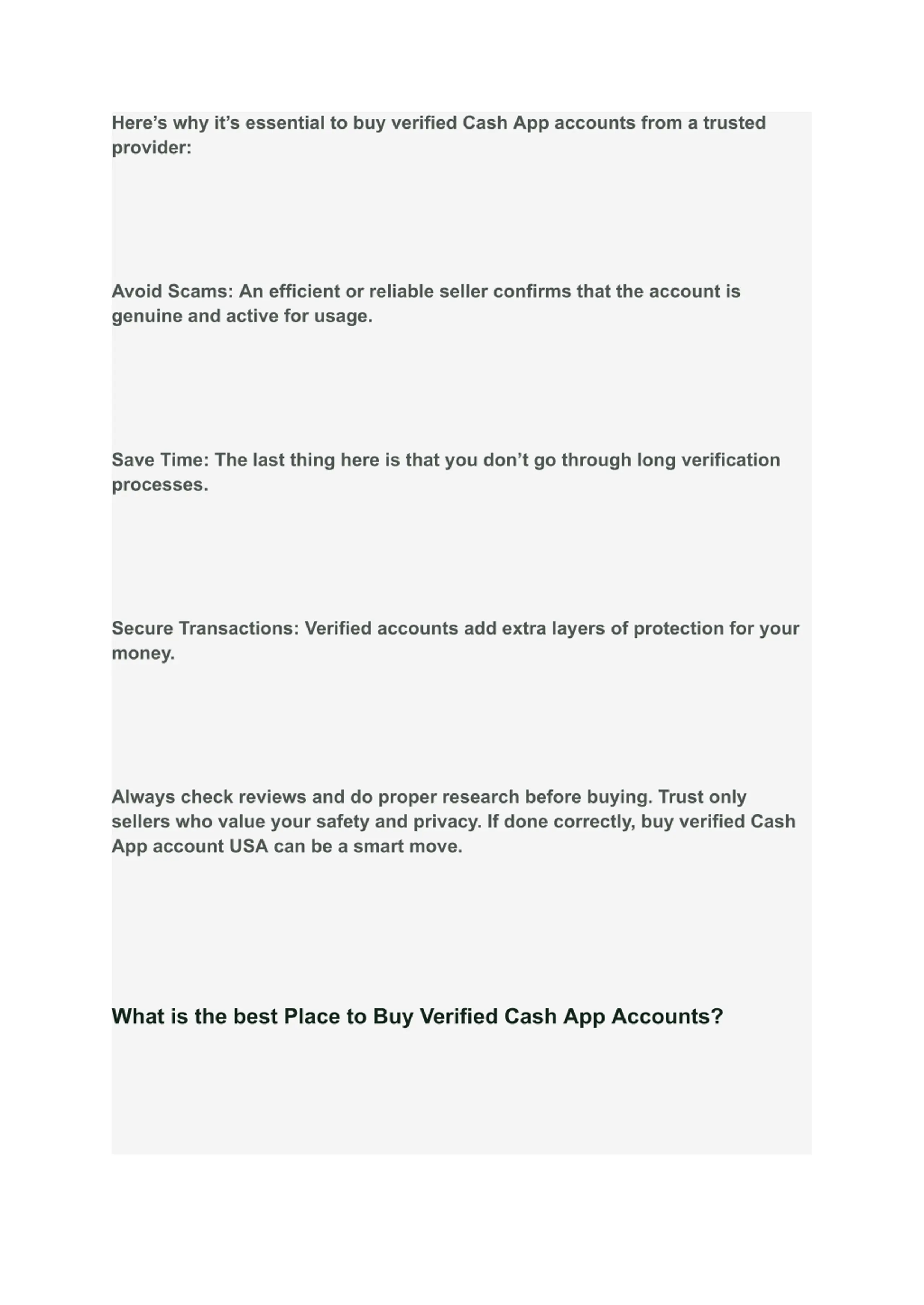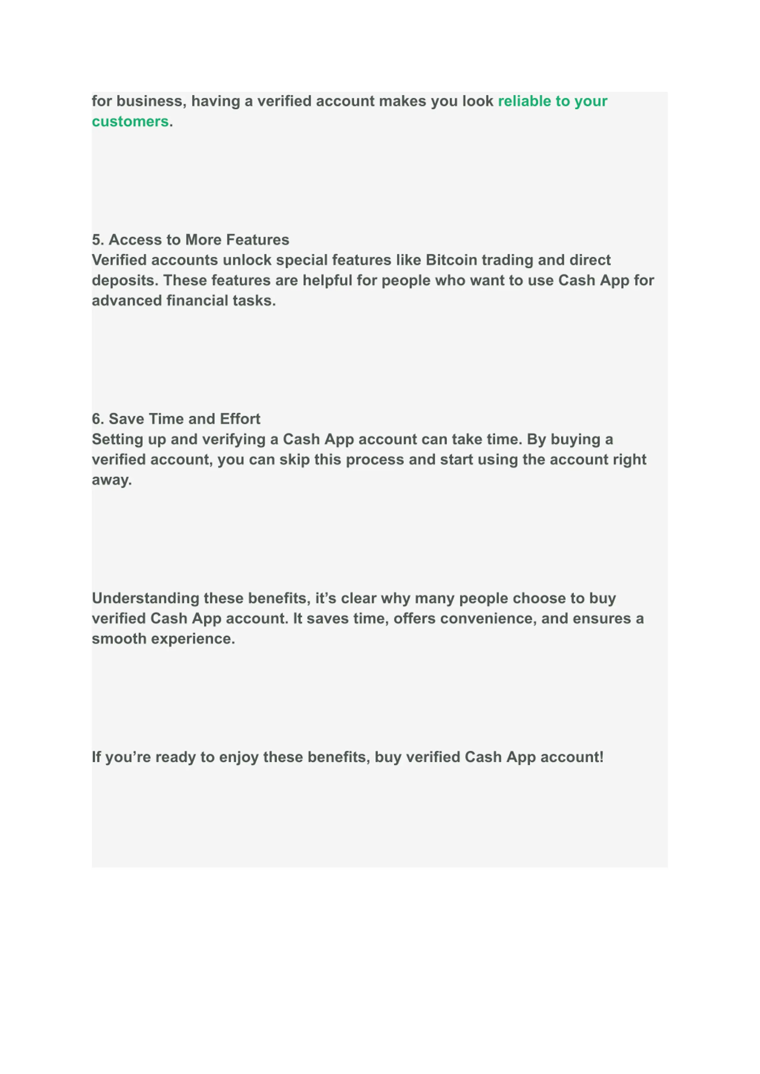 for business, having a verified account makes you look reliable to your customers. 5. Access to More Features Verified accounts unlock special features like Bitcoin trading and direct deposits. These features are helpful for people who want to use Cash App for advanced financial tasks. 6. Save Time and Effort Setting up and verifying a Cash App account can take time. By buying a verified account, you can skip this process and start using the account right away. Understanding these benefits, it s clear why many people choose to buy verified Cash App account. It saves time, offers convenience, and ensures a smooth experience. If you re ready to enjoy these benefits, buy verified Cash App account!
