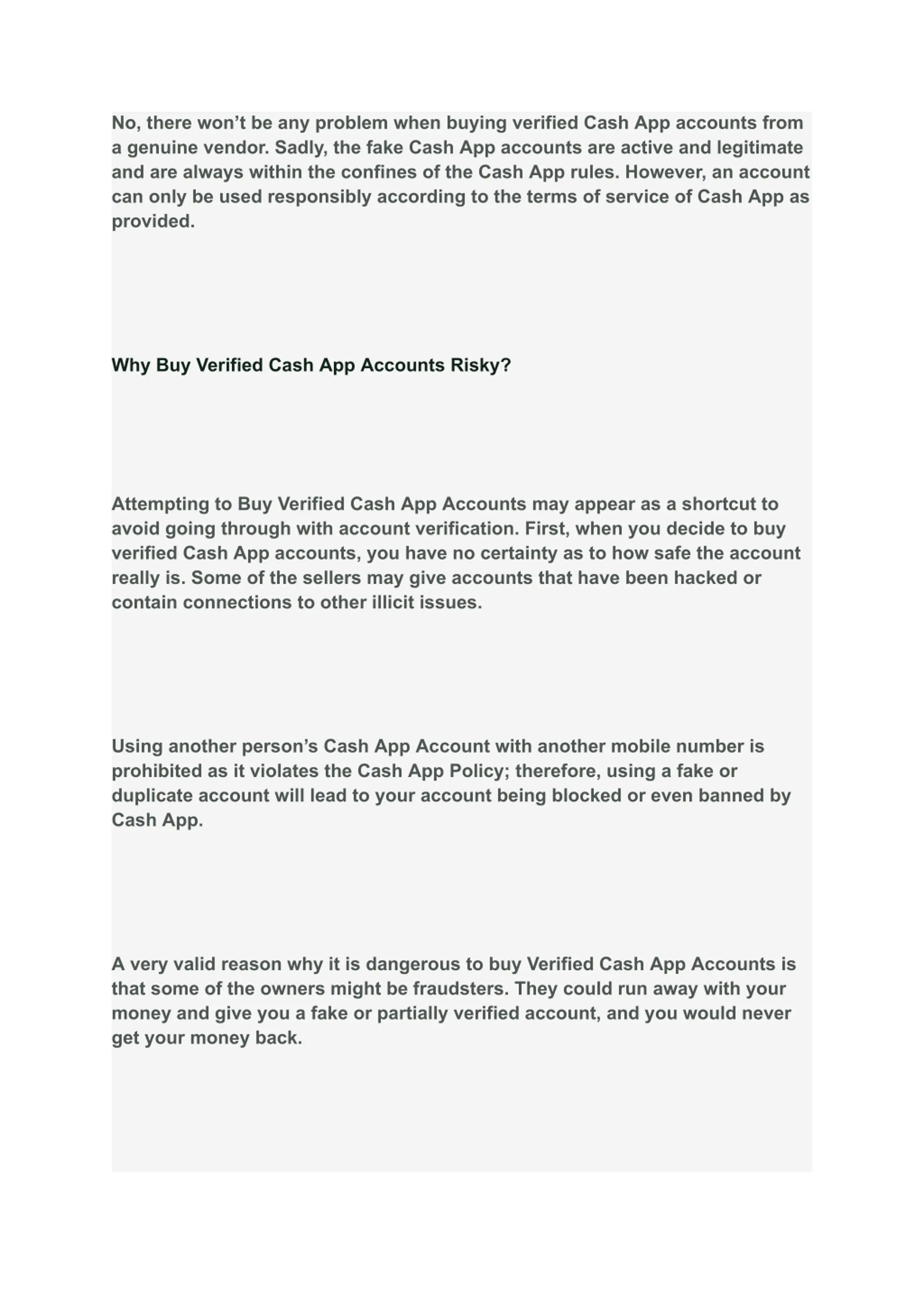 No, there wont be any problem when buying verified Cash App accounts from a genuine vendor. Sadly, the fake Cash App accounts are active and legitimate and are always within the confines of the Cash App rules. However, an account can only be used responsibly according to the terms of service of Cash App as provided. Why Buy Verified Cash App Accounts Risky? Attempting to Buy Verified Cash App Accounts may appear as a shortcut to avoid going through with account verification. First, when you decide to buy verified Cash App accounts, you have no certainty as to how safe the account really is. Some of the sellers may give accounts that have been hacked or contain connections to other illicit issues. Using another person s Cash App Account with another mobile number is prohibited as it violates the Cash App Policy; therefore, using a fake or duplicate account will lead to your account being blocked or even banned by Cash App. A very valid reason why it is dangerous to buy Verified Cash App Accounts is that some of the owners might be fraudsters. They could run away with your money and give you a fake or partially verified account, and you would never get your money back.