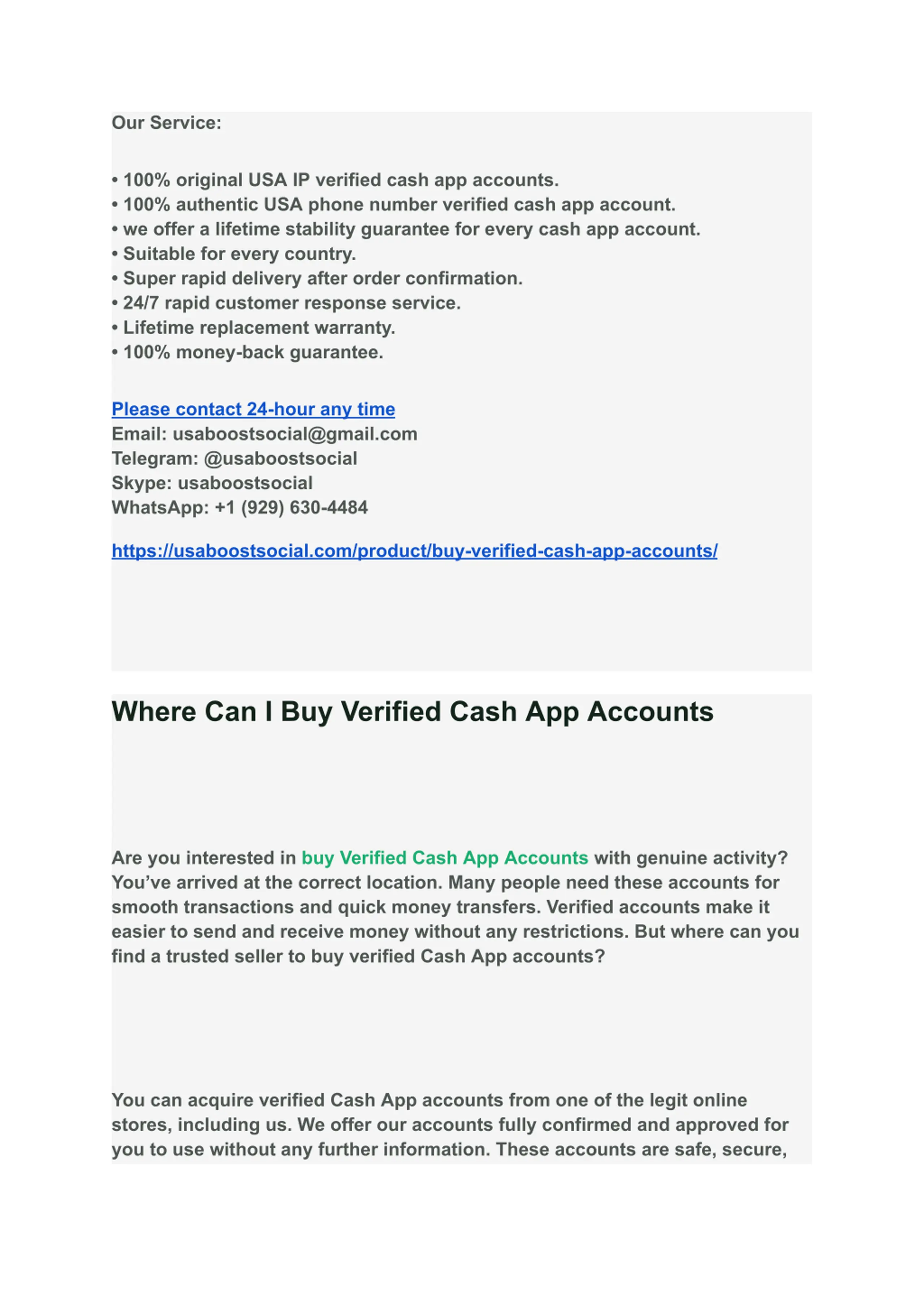 Our Service: 100% original USA IP verified cash app accounts. 100% authentic USA phone number verified cash app account. we offer a lifetime stability guarantee for every cash app account. Suitable for every country. Super rapid delivery after order confirmation. 24/7 rapid customer response service. Lifetime replacement warranty. 100% money-back guarantee. Please contact 24-hour any time Email: usaboostsocial@gmail.com Telegram: @usaboostsocial Skype: usaboostsocial WhatsApp: +1 (929) 630-4484 https://usaboostsocial.com/product/buy-verified-cash-app-accounts/ Where Can I Buy Verified Cash App Accounts Are you interested in buy Verified Cash App Accounts with genuine activity? You ve arrived at the correct location. Many people need these accounts for smooth transactions and quick money transfers. Verified accounts make it easier to send and receive money without any restrictions. But where can you find a trusted seller to buy verified Cash App accounts? You can acquire verified Cash App accounts from one of the legit online stores, including us. We offer our accounts fully confirmed and approved for you to use without any further information. These accounts are safe, secure,