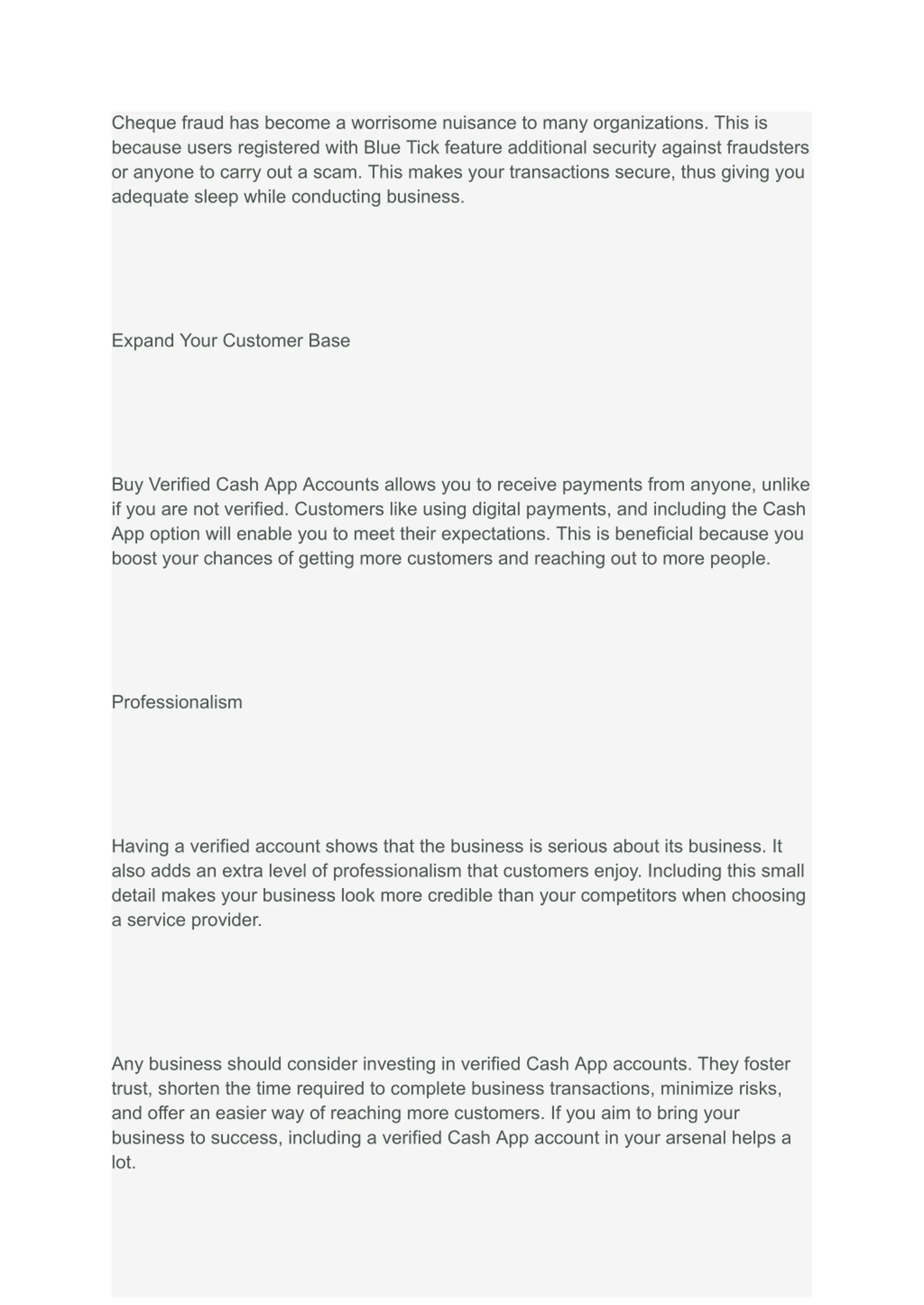 13. Cheque fraud has become a worrisome nuisance to many organizations. This is because users registered with Blue Tick feature additional security against fraudsters or anyone to carry out a scam. This makes your transactions secure, thus giving you adequate sleep while conducting business. Expand Your Customer Base Buy Verified Cash App Accounts allows you to receive payments from anyone, unlike if you are not verified. Customers like using digital payments, and including the Cash App option will enable you to meet their expectations. This is beneficial because you boost your chances of getting more customers and reaching out to more people. Professionalism Having a verified account shows that the business is serious about its business. It also adds an extra level of professionalism that customers enjoy. Including this small detail makes your business look more credible than your competitors when choosing a service provider. Any business should consider investing in verified Cash App accounts. They foster trust, shorten the time required to complete business transactions, minimize risks, and offer an easier way of reaching more customers. If you aim to bring your business to success, including a verified Cash App account in your arsenal helps a lot.