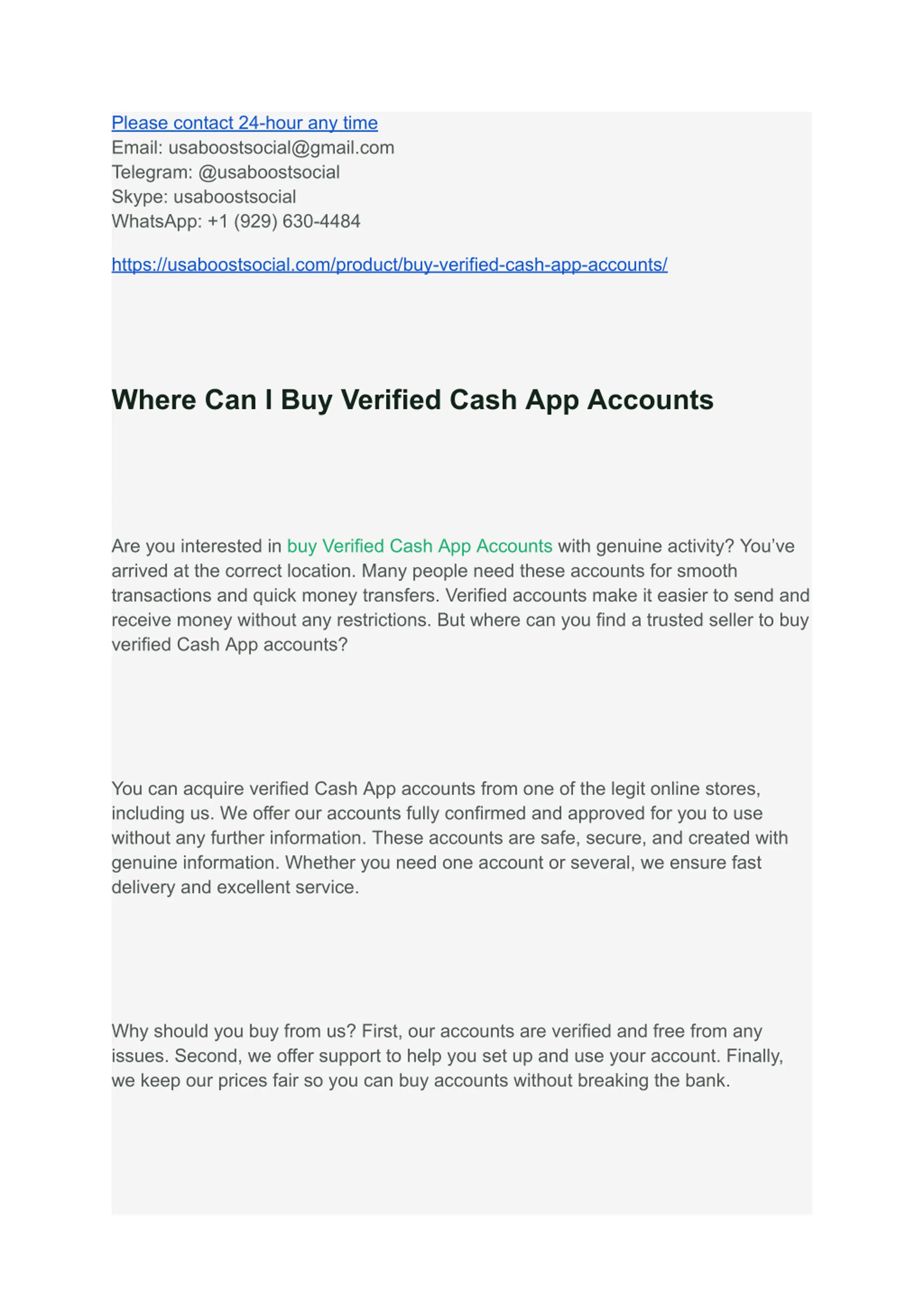 2. Please contact 24-hour any time Email: usaboostsocial@gmail.com Telegram: @usaboostsocial Skype: usaboostsocial WhatsApp: +1 (929) 630-4484 https://usaboostsocial.com/product/buy-verified-cash-app-accounts/ Where Can I Buy Verified Cash App Accounts Are you interested in buy Verified Cash App Accounts with genuine activity? You ve arrived at the correct location. Many people need these accounts for smooth transactions and quick money transfers. Verified accounts make it easier to send and receive money without any restrictions. But where can you find a trusted seller to buy verified Cash App accounts? You can acquire verified Cash App accounts from one of the legit online stores, including us. We offer our accounts fully confirmed and approved for you to use without any further information. These accounts are safe, secure, and created with genuine information. Whether you need one account or several, we ensure fast delivery and excellent service. Why should you buy from us? First, our accounts are verified and free from any issues. Second, we offer support to help you set up and use your account. Finally, we keep our prices fair so you can buy accounts without breaking the bank.