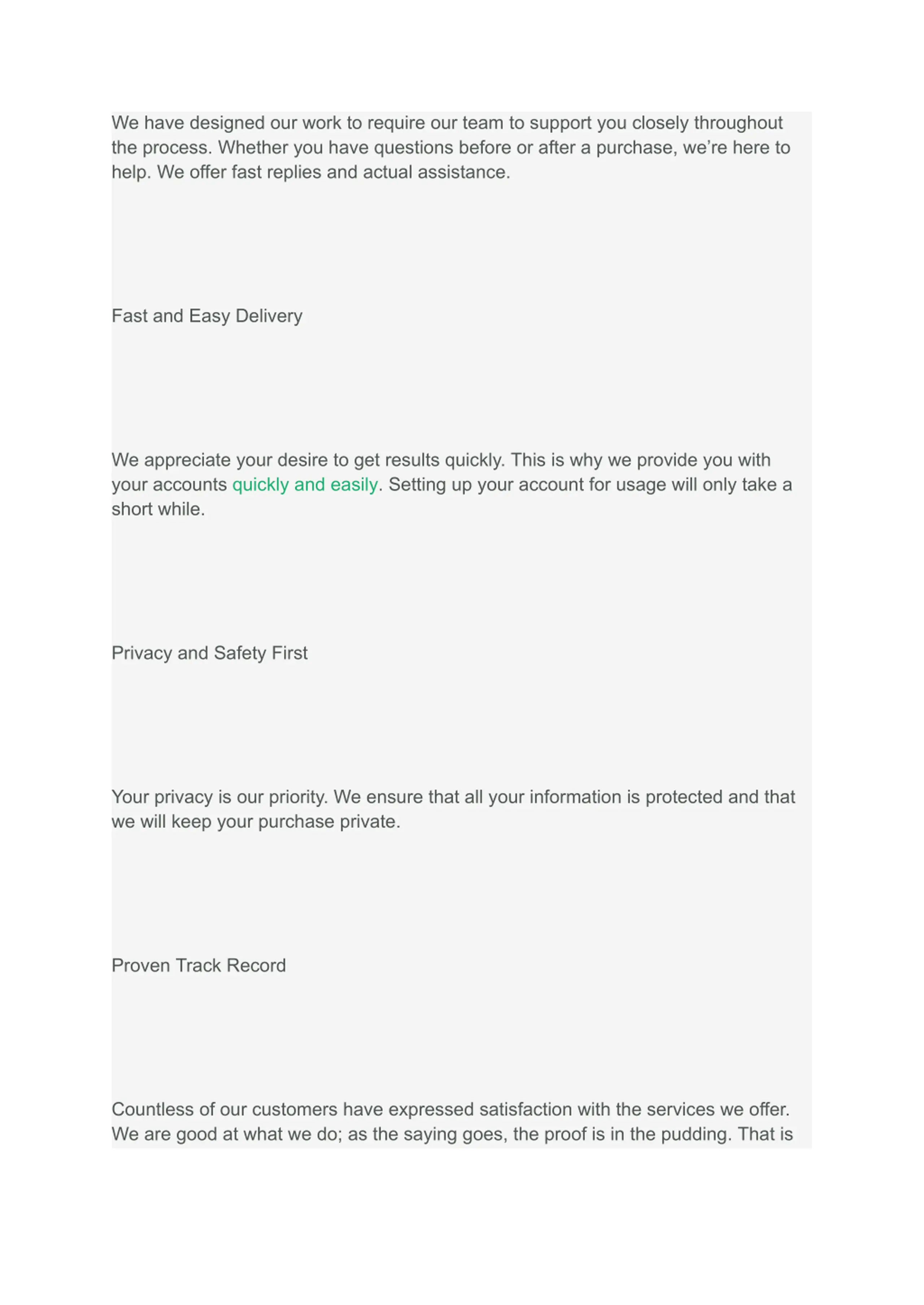 9. We have designed our work to require our team to support you closely throughout the process. Whether you have questions before or after a purchase, we re here to help. We offer fast replies and actual assistance. Fast and Easy Delivery We appreciate your desire to get results quickly. This is why we provide you with your accounts quickly and easily. Setting up your account for usage will only take a short while. Privacy and Safety First Your privacy is our priority. We ensure that all your information is protected and that we will keep your purchase private. Proven Track Record Countless of our customers have expressed satisfaction with the services we offer. We are good at what we do; as the saying goes, the proof is in the pudding. That is