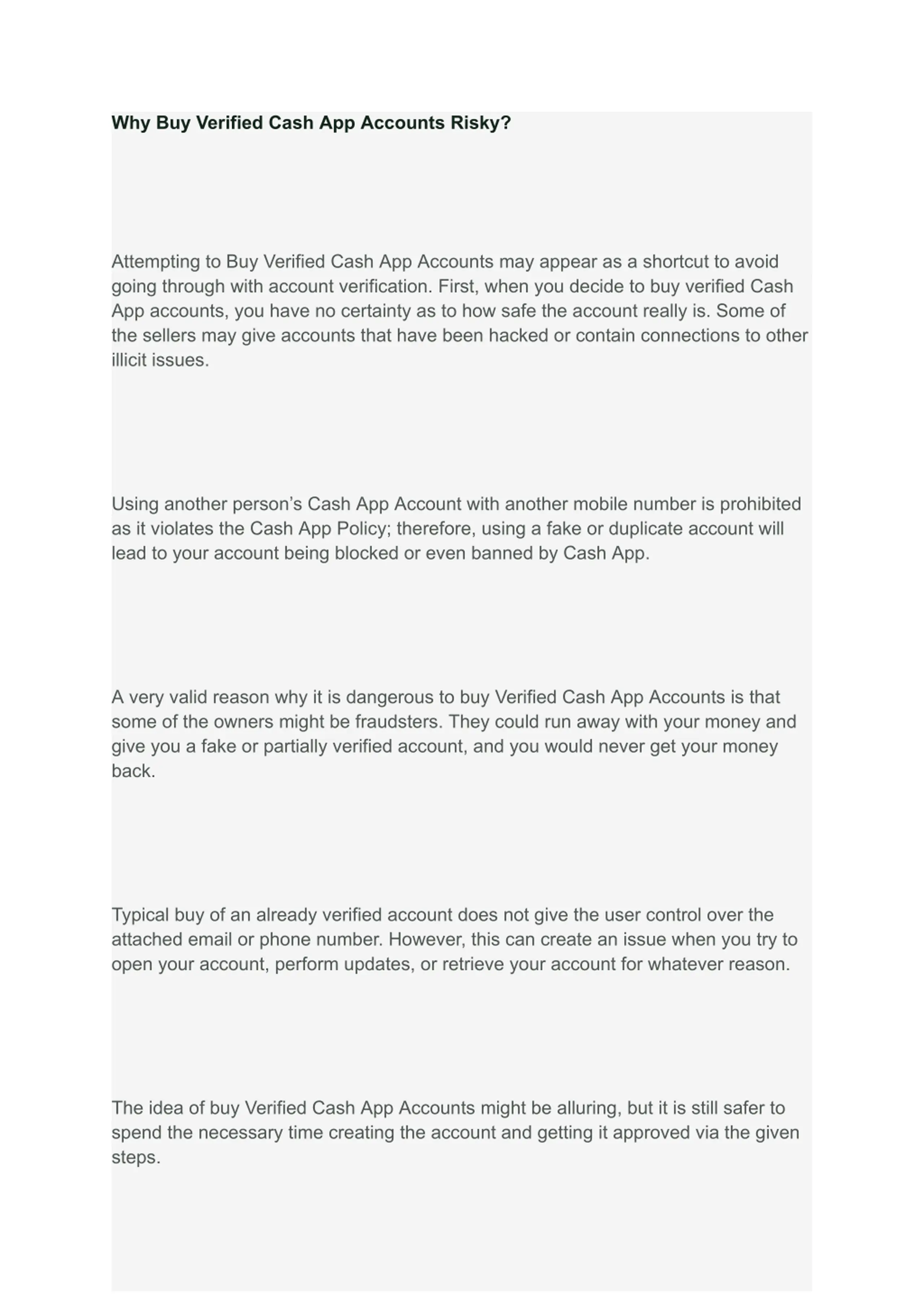 17. Why Buy Verified Cash App Accounts Risky? Attempting to Buy Verified Cash App Accounts may appear as a shortcut to avoid going through with account verification. First, when you decide to buy verified Cash App accounts, you have no certainty as to how safe the account really is. Some of the sellers may give accounts that have been hacked or contain connections to other illicit issues. Using another person s Cash App Account with another mobile number is prohibited as it violates the Cash App Policy; therefore, using a fake or duplicate account will lead to your account being blocked or even banned by Cash App. A very valid reason why it is dangerous to buy Verified Cash App Accounts is that some of the owners might be fraudsters. They could run away with your money and give you a fake or partially verified account, and you would never get your money back. Typical buy of an already verified account does not give the user control over the attached email or phone number. However, this can create an issue when you try to open your account, perform updates, or retrieve your account for whatever reason. The idea of buy Verified Cash App Accounts might be alluring, but it is still safer to spend the necessary time creating the account and getting it approved via the given steps.