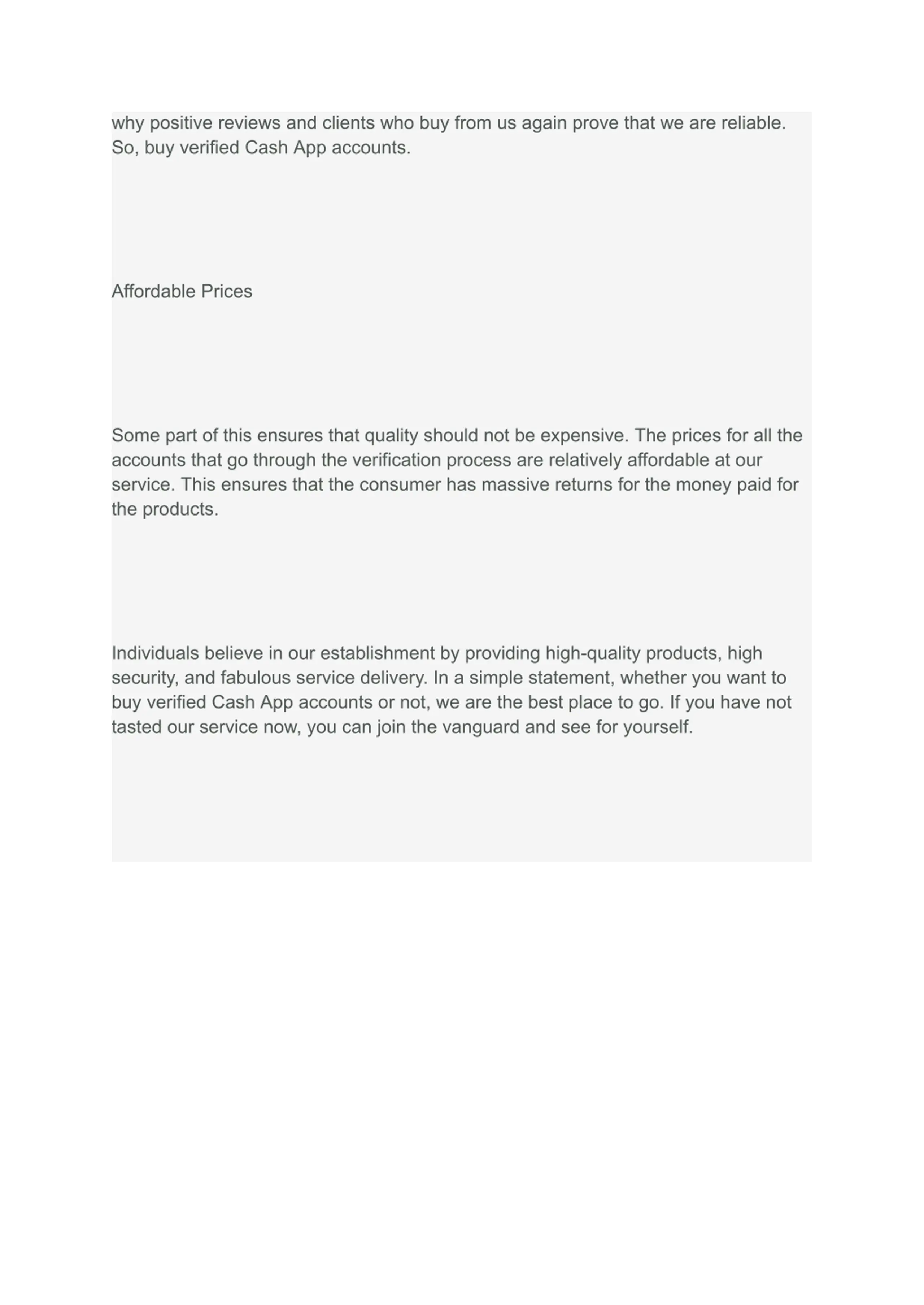10. why positive reviews and clients who buy from us again prove that we are reliable. So, buy verified Cash App accounts. Affordable Prices Some part of this ensures that quality should not be expensive. The prices for all the accounts that go through the verification process are relatively affordable at our service. This ensures that the consumer has massive returns for the money paid for the products. Individuals believe in our establishment by providing high-quality products, high security, and fabulous service delivery. In a simple statement, whether you want to buy verified Cash App accounts or not, we are the best place to go. If you have not tasted our service now, you can join the vanguard and see for yourself.