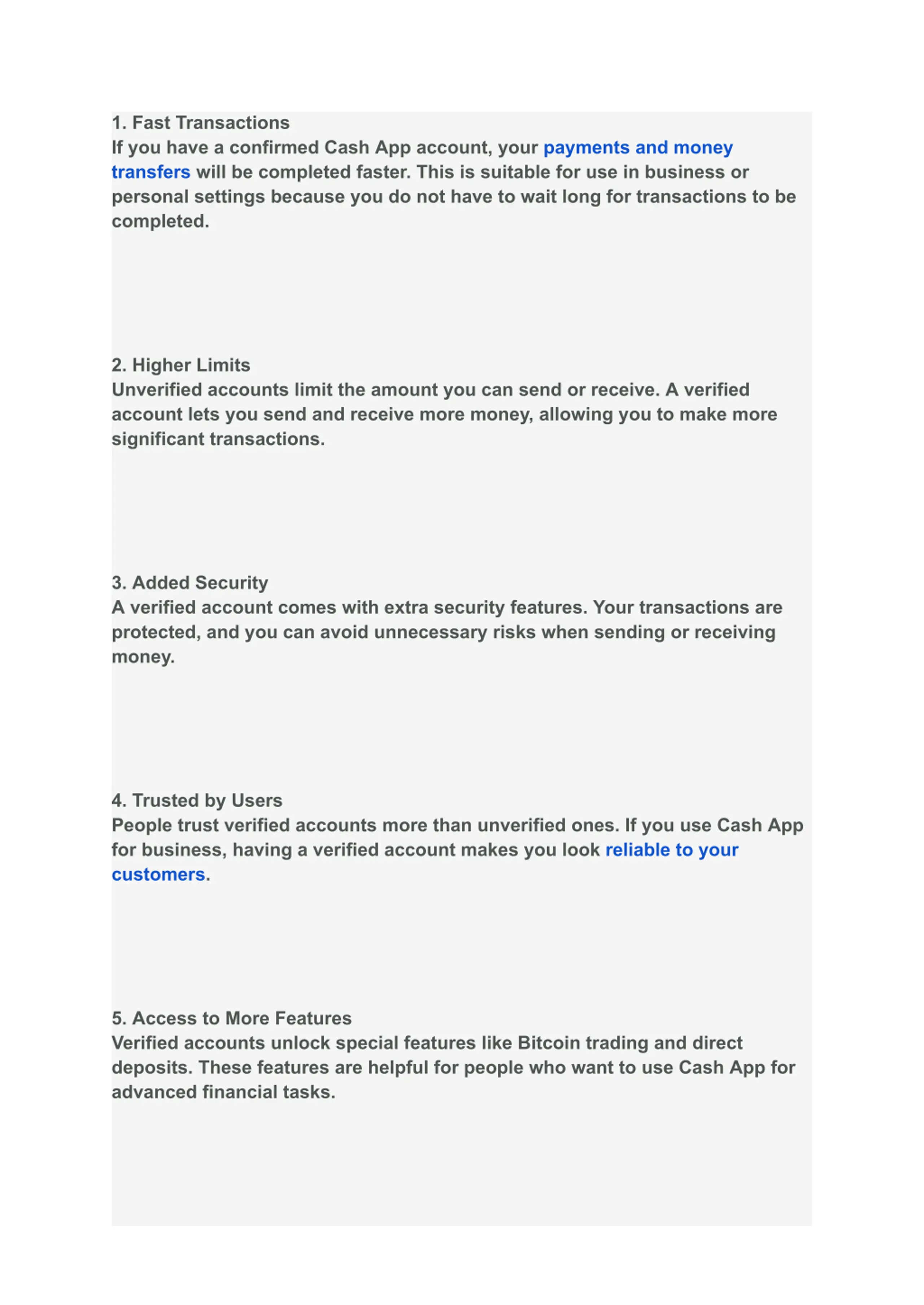 1. Fast Transactions If you have a confirmed Cash App account, your payments and money transfers will be completed faster. This is suitable for use in business or personal settings because you do not have to wait long for transactions to be completed. 2. Higher Limits Unverified accounts limit the amount you can send or receive. A verified account lets you send and receive more money, allowing you to make more significant transactions. 3. Added Security A verified account comes with extra security features. Your transactions are protected, and you can avoid unnecessary risks when sending or receiving money. 4. Trusted by Users People trust verified accounts more than unverified ones. If you use Cash App for business, having a verified account makes you look reliable to your customers. 5. Access to More Features Verified accounts unlock special features like Bitcoin trading and direct deposits. These features are helpful for people who want to use Cash App for advanced financial tasks.
