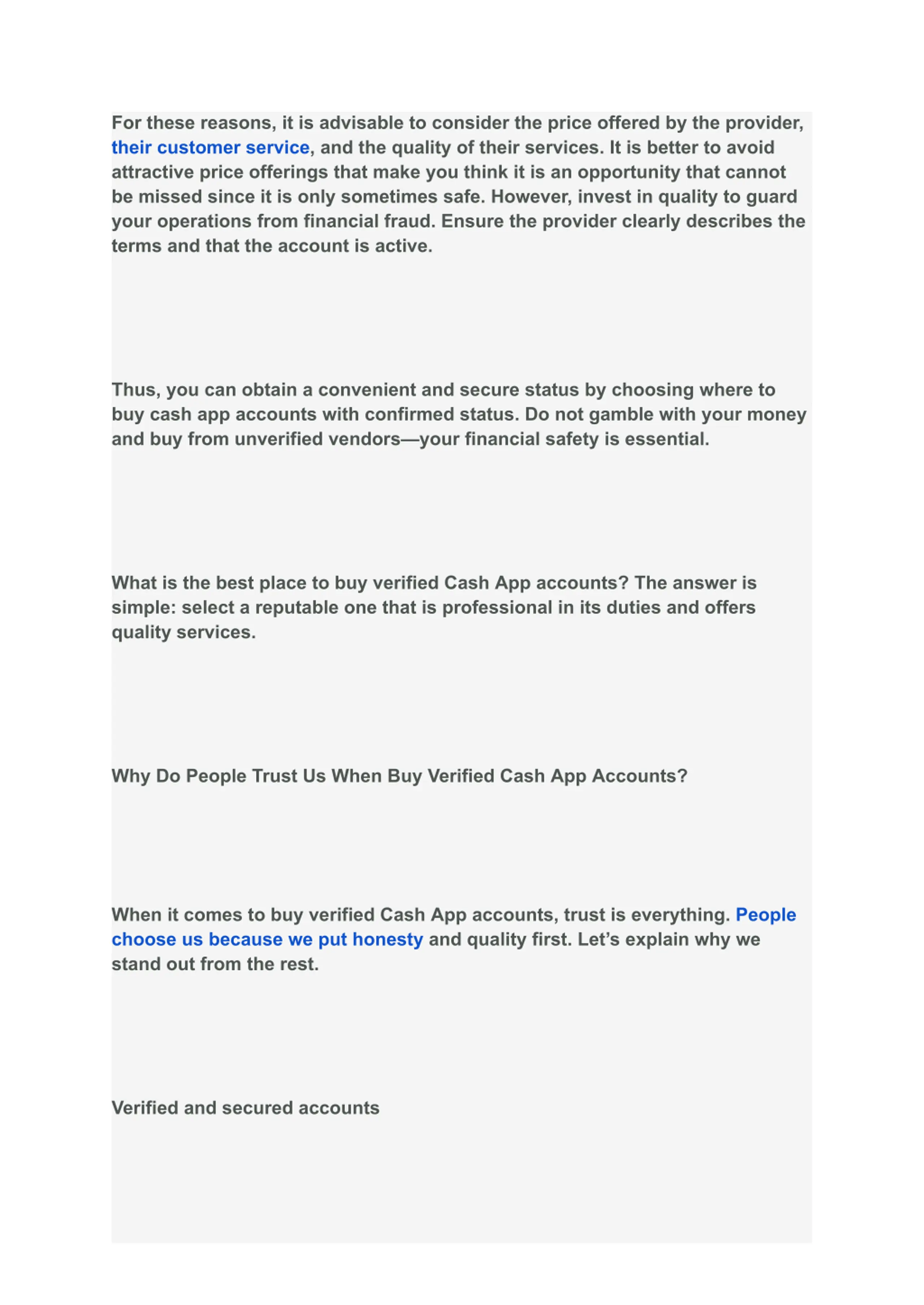 For these reasons, it is advisable to consider the price offered by the provider, their customer service, and the quality of their services. It is better to avoid attractive price offerings that make you think it is an opportunity that cannot be missed since it is only sometimes safe. However, invest in quality to guard your operations from financial fraud. Ensure the provider clearly describes the terms and that the account is active. Thus, you can obtain a convenient and secure status by choosing where to buy cash app accounts with confirmed status. Do not gamble with your money and buy from unverified vendors your financial safety is essential. What is the best place to buy verified Cash App accounts? The answer is simple: select a reputable one that is professional in its duties and offers quality services. Why Do People Trust Us When Buy Verified Cash App Accounts? When it comes to buy verified Cash App accounts, trust is everything. People choose us because we put honesty and quality first. Let s explain why we stand out from the rest. Verified and secured accounts