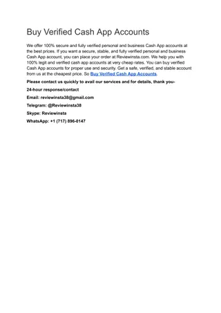 Buy Verified Cash App Accounts for sale 2024 https://reviewinsta.com/shop/buy-verified- cash-app-accounts/ Buying Verified Cash App Accounts Cash App has quickly become one of the most popular mobile payment platforms, allowing users to send and receive money instantly, make payments, and even invest. But as its popularity grows, some people look for shortcuts like purchasing verified Cash App accounts. This guide will explore what a verified Cash App account is, the risks involved in buying one, and why it may not be the best option for long-term success. 24 Hours Reply/Contact services and for details Email: reviewinsta38@gmail.com Telegram: @Reviewinsta38 Skype: Reviewinsta WhatsApp: +1 (717) 896-0147 What Is a Verified Cash App Account? A verified Cash App account is an account that has gone through Cash App s verification process, typically by providing personal identification information such as a social security number, full name, and a photo ID. Verification allows users to access certain advanced features of Cash App, including higher transaction limits and the ability to use Cash App s investing tools. Difference Between Verified and Unverified Cash App Accounts Unverified Account: Limited transaction limits, restricted features (such as lower sending and receiving limits). Verified Account: Higher transaction limits, access to Bitcoin and stock investing, and a greater sense of security for users. Why Would Someone Want to Buy a Verified Cash App Account?