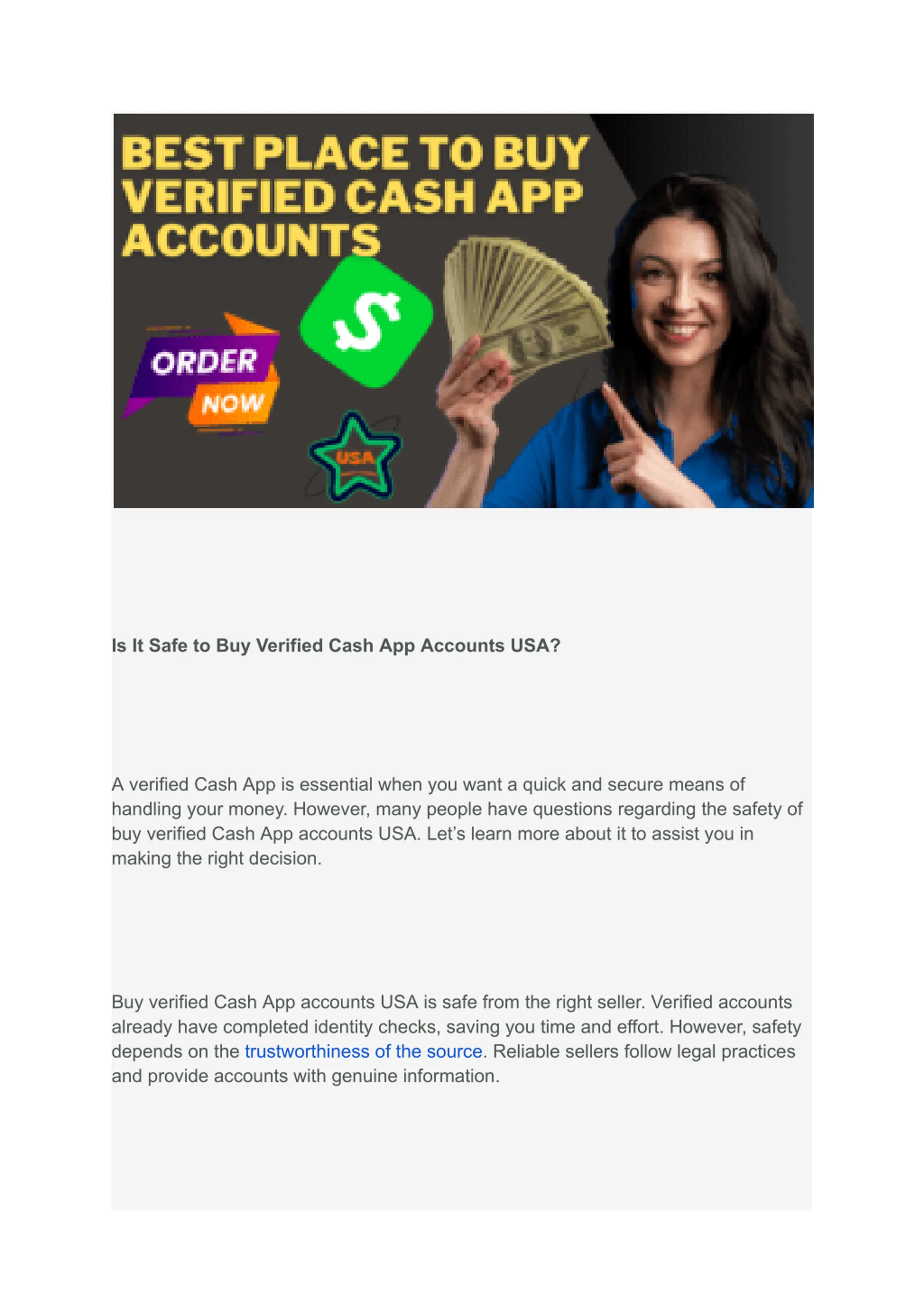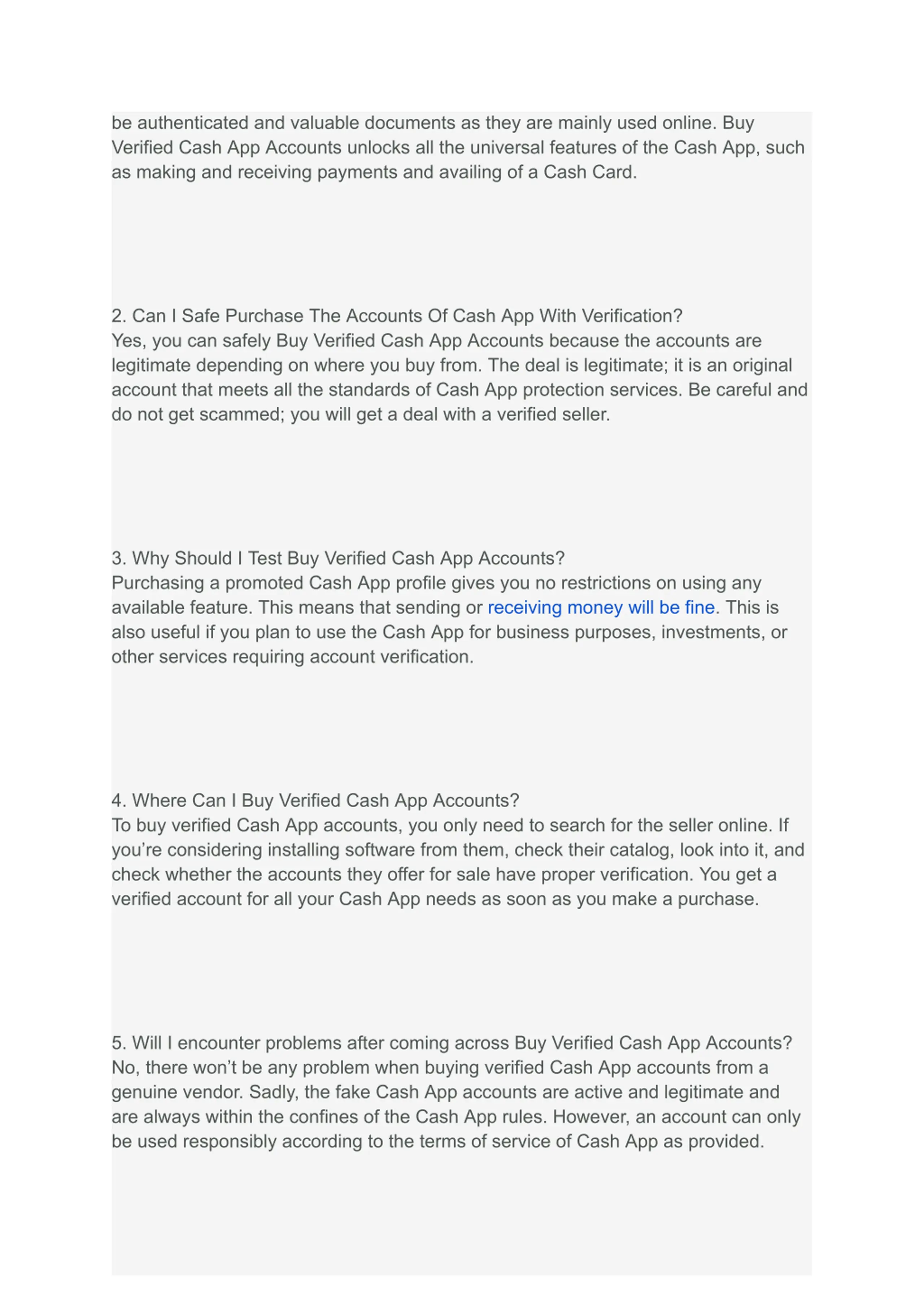 be authenticated and valuable documents as they are mainly used online. Buy Verified Cash App Accounts unlocks all the universal features of the Cash App, such as making and receiving payments and availing of a Cash Card. 2. Can I Safe Purchase The Accounts Of Cash App With Verification? Yes, you can safely Buy Verified Cash App Accounts because the accounts are legitimate depending on where you buy from. The deal is legitimate; it is an original account that meets all the standards of Cash App protection services. Be careful and do not get scammed; you will get a deal with a verified seller. 3. Why Should I Test Buy Verified Cash App Accounts? Purchasing a promoted Cash App profile gives you no restrictions on using any available feature. This means that sending or receiving money will be fine. This is also useful if you plan to use the Cash App for business purposes, investments, or other services requiring account verification. 4. Where Can I Buy Verified Cash App Accounts? To buy verified Cash App accounts, you only need to search for the seller online. If you re considering installing software from them, check their catalog, look into it, and check whether the accounts they offer for sale have proper verification. You get a verified account for all your Cash App needs as soon as you make a purchase. 5. Will I encounter problems after coming across Buy Verified Cash App Accounts? No, there won t be any problem when buying verified Cash App accounts from a genuine vendor. Sadly, the fake Cash App accounts are active and legitimate and are always within the confines of the Cash App rules. However, an account can only be used responsibly according to the terms of service of Cash App as provided.