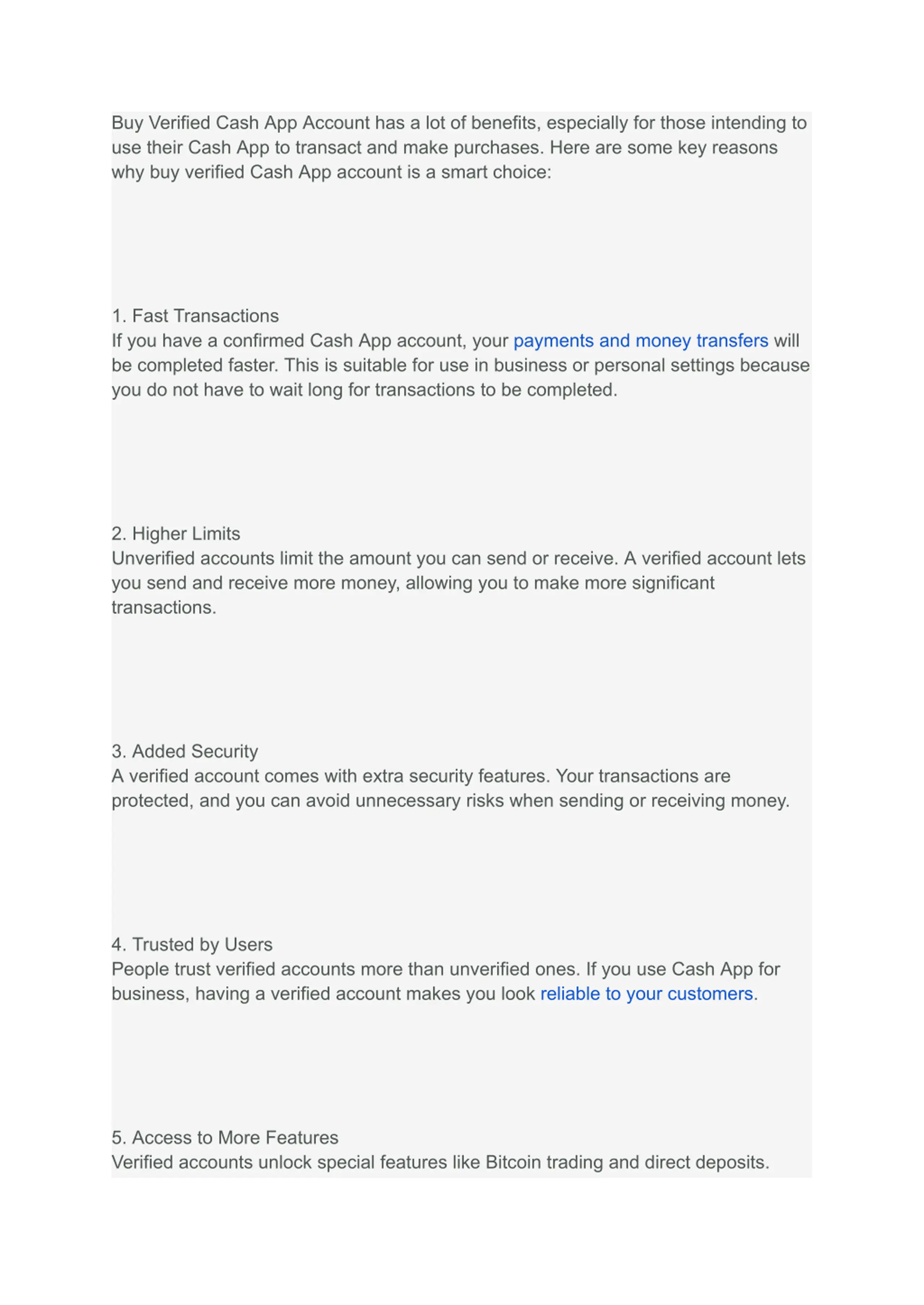 Buy Verified Cash App Account has a lot of benefits, especially for those intending to use their Cash App to transact and make purchases. Here are some key reasons why buy verified Cash App account is a smart choice: 1. Fast Transactions If you have a confirmed Cash App account, your payments and money transfers will be completed faster. This is suitable for use in business or personal settings because you do not have to wait long for transactions to be completed. 2. Higher Limits Unverified accounts limit the amount you can send or receive. A verified account lets you send and receive more money, allowing you to make more significant transactions. 3. Added Security A verified account comes with extra security features. Your transactions are protected, and you can avoid unnecessary risks when sending or receiving money. 4. Trusted by Users People trust verified accounts more than unverified ones. If you use Cash App for business, having a verified account makes you look reliable to your customers. 5. Access to More Features Verified accounts unlock special features like Bitcoin trading and direct deposits.