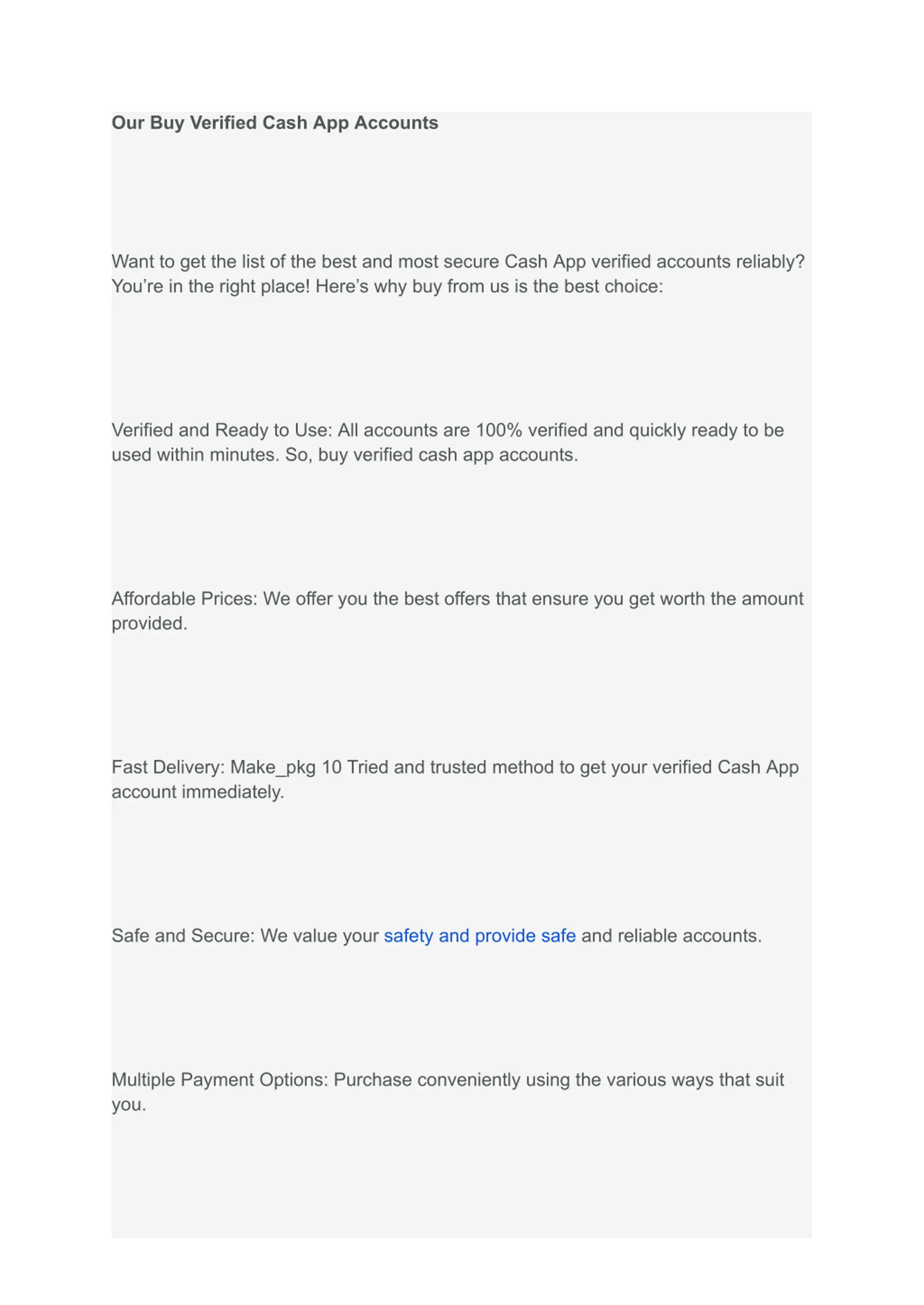 Our Buy Verified Cash App Accounts Want to get the list of the best and most secure Cash App verified accounts reliably? You re in the right place! Here s why buy from us is the best choice: Verified and Ready to Use: All accounts are 100% verified and quickly ready to be used within minutes. So, buy verified cash app accounts. Affordable Prices: We offer you the best offers that ensure you get worth the amount provided. Fast Delivery: Make_pkg 10 Tried and trusted method to get your verified Cash App account immediately. Safe and Secure: We value your safety and provide safe and reliable accounts. Multiple Payment Options: Purchase conveniently using the various ways that suit you.