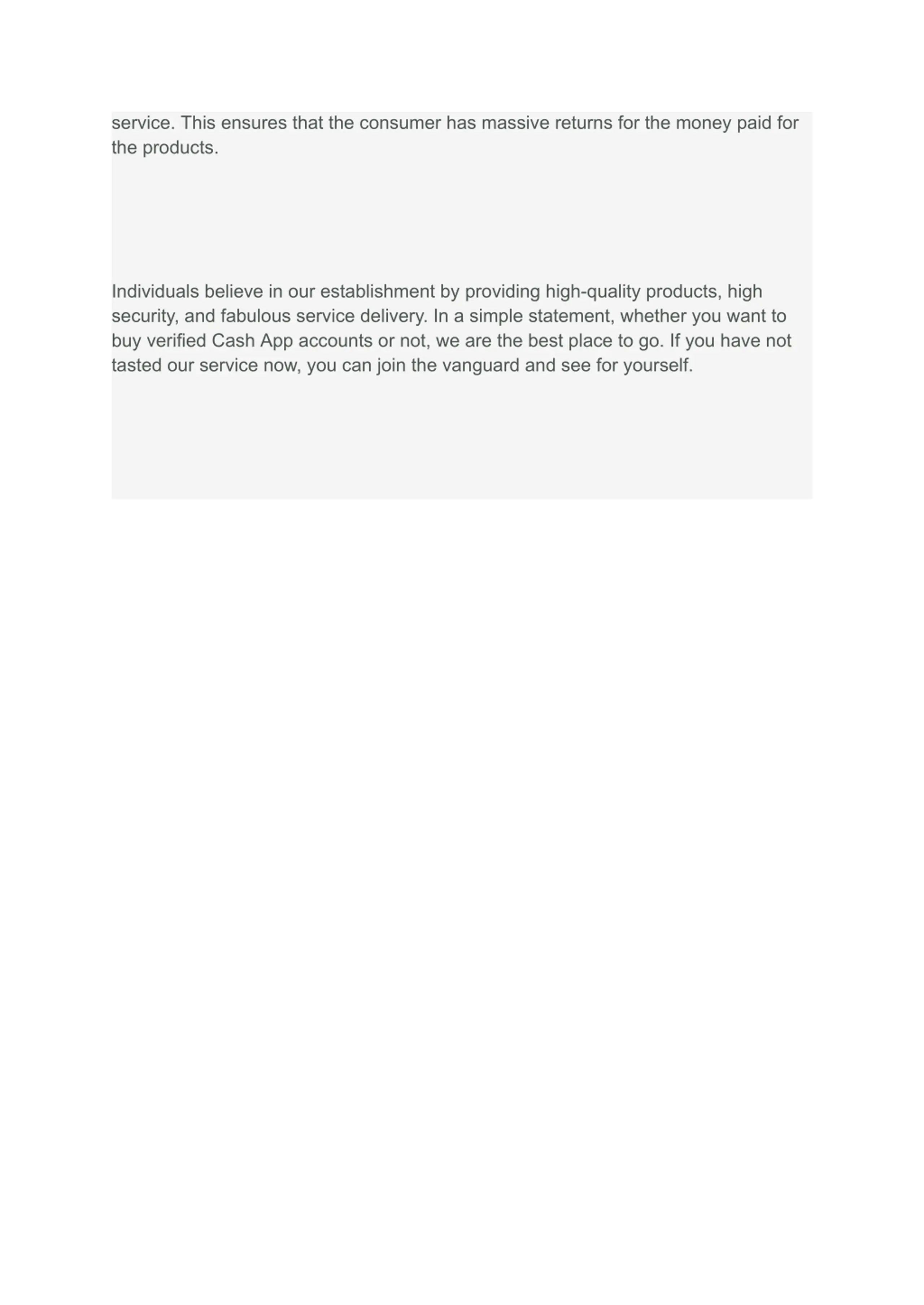 service. This ensures that the consumer has massive returns for the money paid for the products. Individuals believe in our establishment by providing high-quality products, high security, and fabulous service delivery. In a simple statement, whether you want to buy verified Cash App accounts or not, we are the best place to go. If you have not tasted our service now, you can join the vanguard and see for yourself.