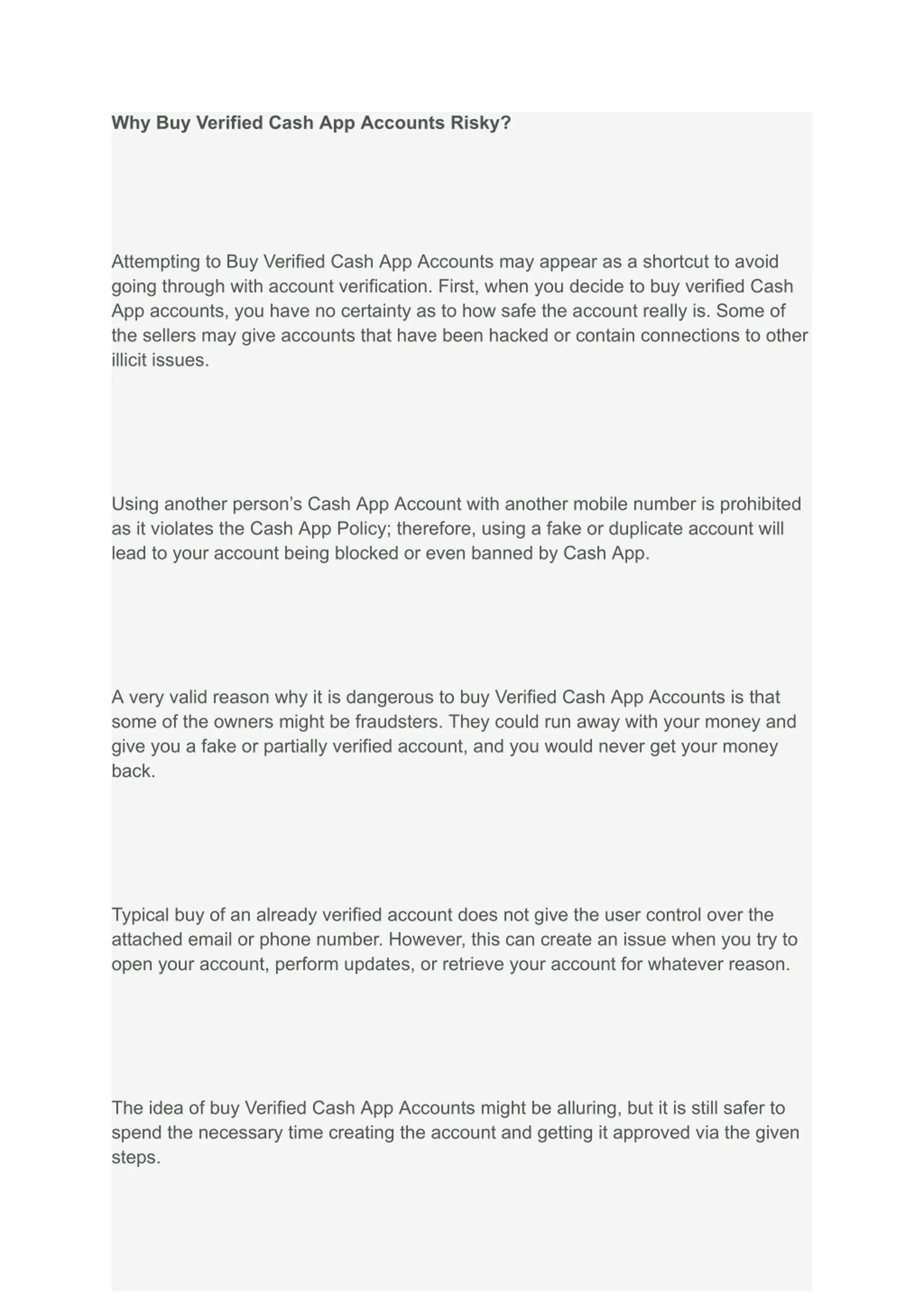 Why Buy Verified Cash App Accounts Risky? Attempting to Buy Verified Cash App Accounts may appear as a shortcut to avoid going through with account verification. First, when you decide to buy verified Cash App accounts, you have no certainty as to how safe the account really is. Some of the sellers may give accounts that have been hacked or contain connections to other illicit issues. Using another person s Cash App Account with another mobile number is prohibited as it violates the Cash App Policy; therefore, using a fake or duplicate account will lead to your account being blocked or even banned by Cash App. A very valid reason why it is dangerous to buy Verified Cash App Accounts is that some of the owners might be fraudsters. They could run away with your money and give you a fake or partially verified account, and you would never get your money back. Typical buy of an already verified account does not give the user control over the attached email or phone number. However, this can create an issue when you try to open your account, perform updates, or retrieve your account for whatever reason. The idea of buy Verified Cash App Accounts might be alluring, but it is still safer to spend the necessary time creating the account and getting it approved via the given steps.