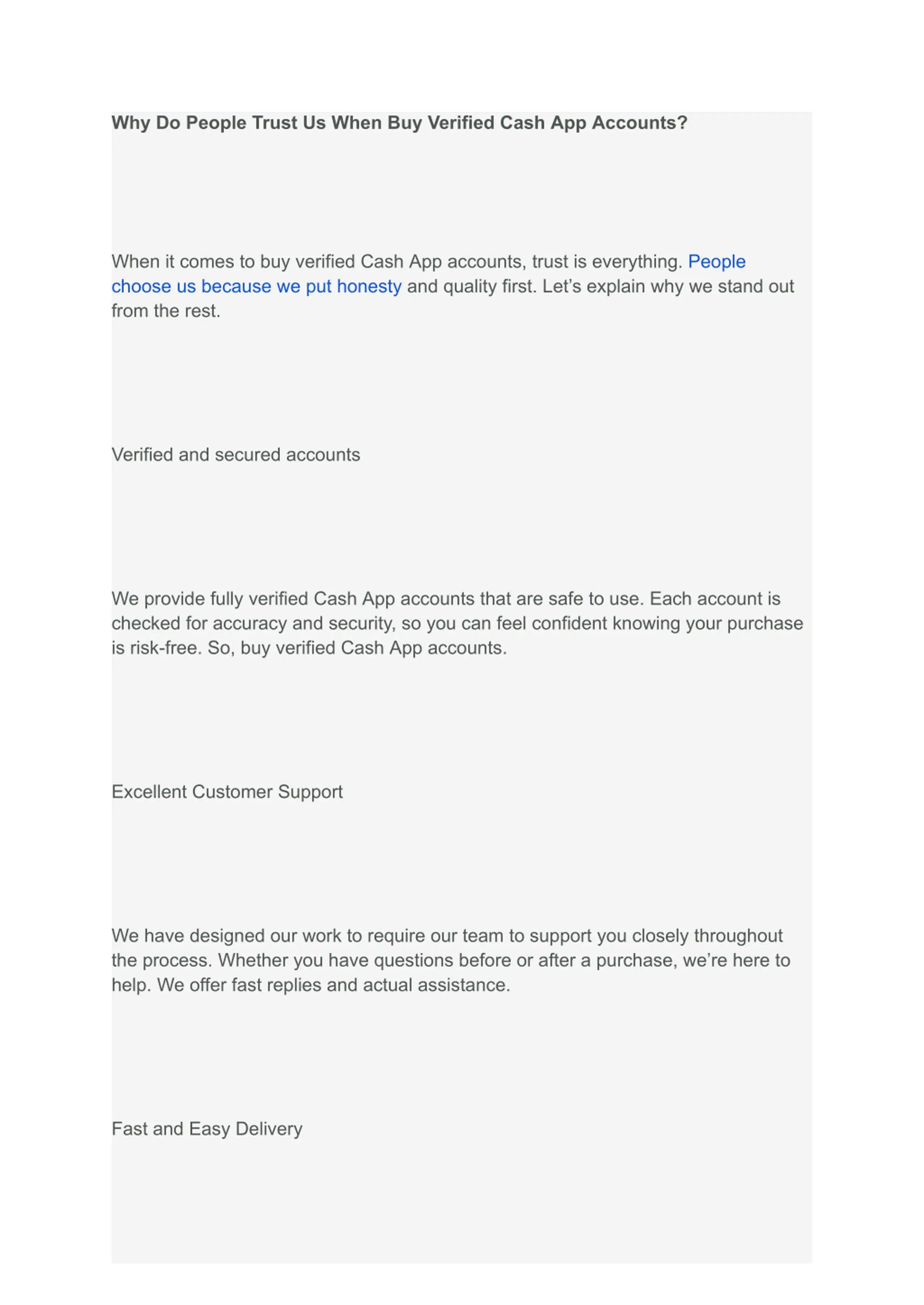 Why Do People Trust Us When Buy Verified Cash App Accounts? When it comes to buy verified Cash App accounts, trust is everything. People choose us because we put honesty and quality first. Let s explain why we stand out from the rest. Verified and secured accounts We provide fully verified Cash App accounts that are safe to use. Each account is checked for accuracy and security, so you can feel confident knowing your purchase is risk-free. So, buy verified Cash App accounts. Excellent Customer Support We have designed our work to require our team to support you closely throughout the process. Whether you have questions before or after a purchase, we re here to help. We offer fast replies and actual assistance. Fast and Easy Delivery