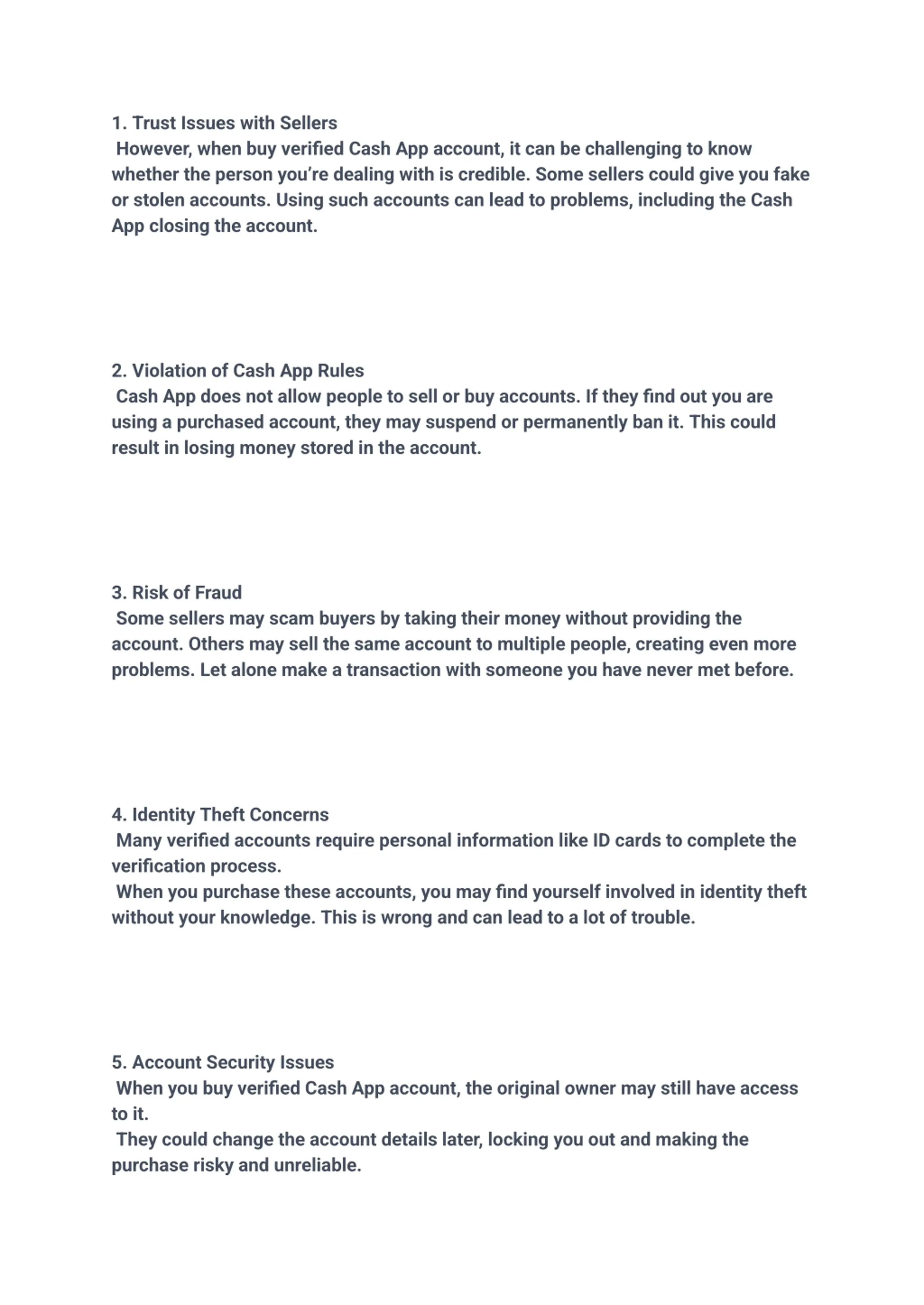 14. 1. Trust Issues with Sellers However, when buy verified Cash App account, it can be challenging to know whether the person you re dealing with is credible. Some sellers could give you fake or stolen accounts. Using such accounts can lead to problems, including the Cash App closing the account. 2. Violation of Cash App Rules Cash App does not allow people to sell or buy accounts. If they find out you are using a purchased account, they may suspend or permanently ban it. This could result in losing money stored in the account. 3. Risk of Fraud Some sellers may scam buyers by taking their money without providing the account. Others may sell the same account to multiple people, creating even more problems. Let alone make a transaction with someone you have never met before. 4. Identity Theft Concerns Many verified accounts require personal information like ID cards to complete the verification process. When you purchase these accounts, you may find yourself involved in identity theft without your knowledge. This is wrong and can lead to a lot of trouble. 5. Account Security Issues When you buy verified Cash App account, the original owner may still have access to it. They could change the account details later, locking you out and making the purchase risky and unreliable.