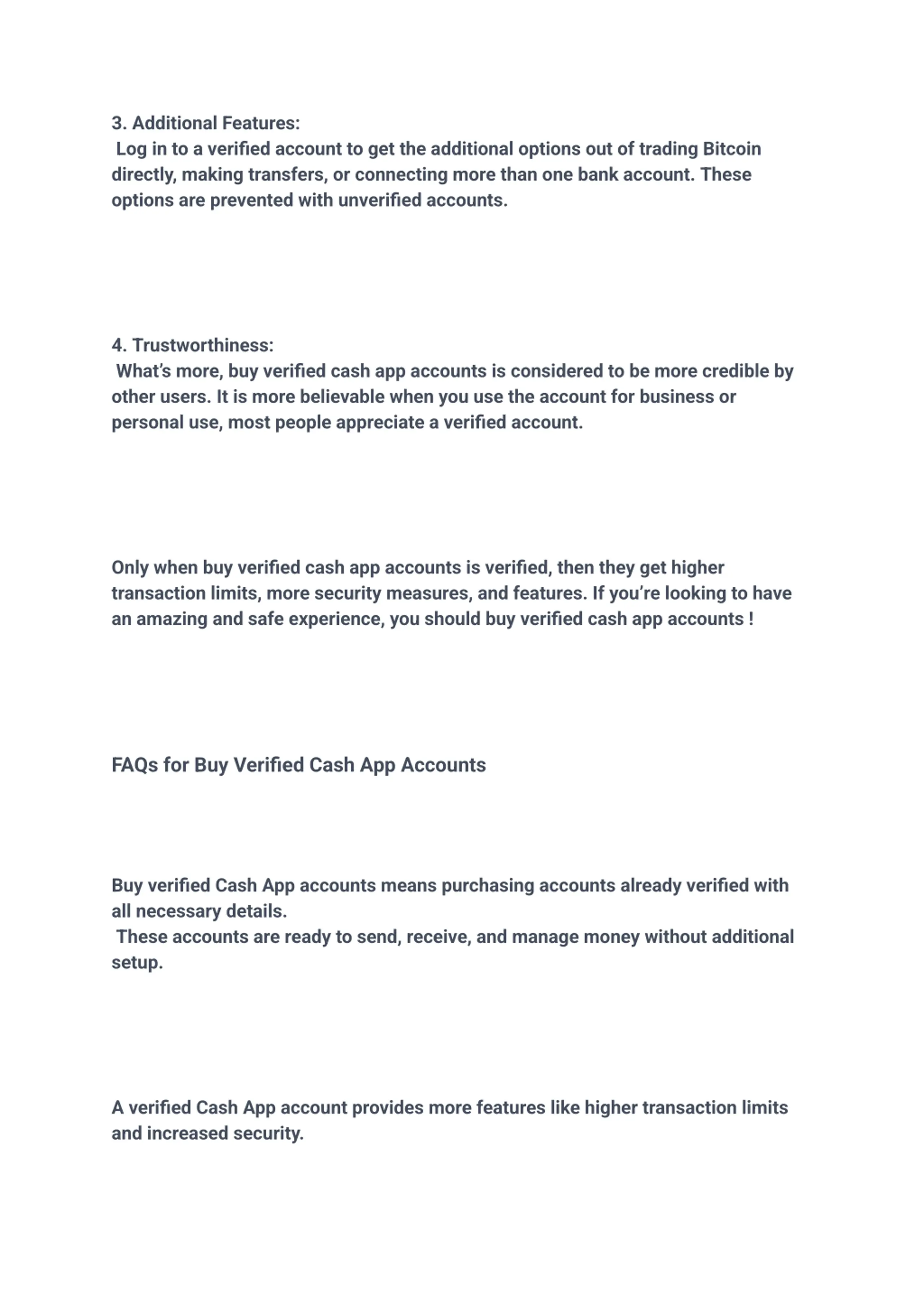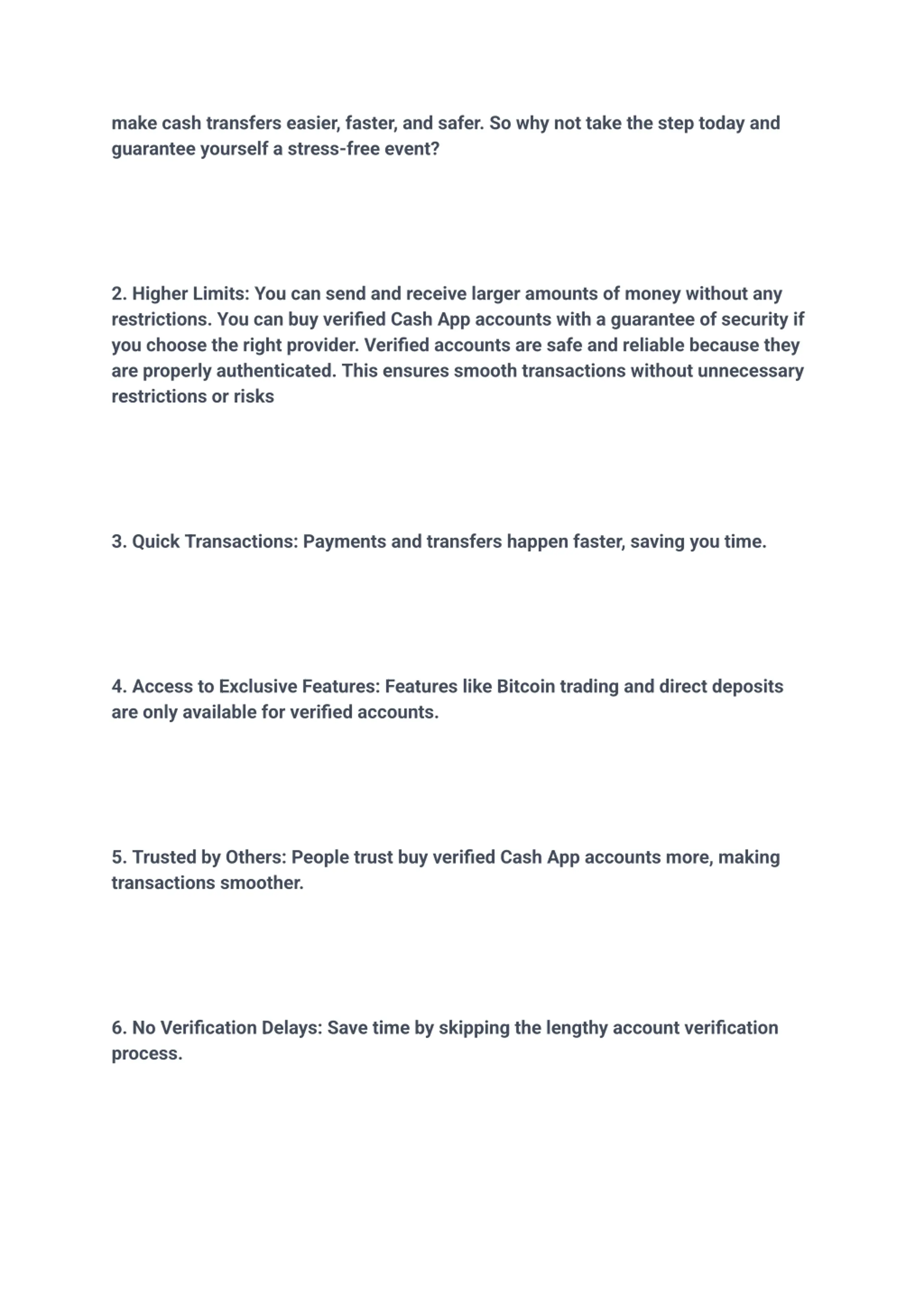 8. make cash transfers easier, faster, and safer. So why not take the step today and guarantee yourself a stress-free event? 2. Higher Limits: You can send and receive larger amounts of money without any restrictions. You can buy verified Cash App accounts with a guarantee of security if you choose the right provider. Verified accounts are safe and reliable because they are properly authenticated. This ensures smooth transactions without unnecessary restrictions or risks 3. Quick Transactions: Payments and transfers happen faster, saving you time. 4. Access to Exclusive Features: Features like Bitcoin trading and direct deposits are only available for verified accounts. 5. Trusted by Others: People trust buy verified Cash App accounts more, making transactions smoother. 6. No Verification Delays: Save time by skipping the lengthy account verification process.
