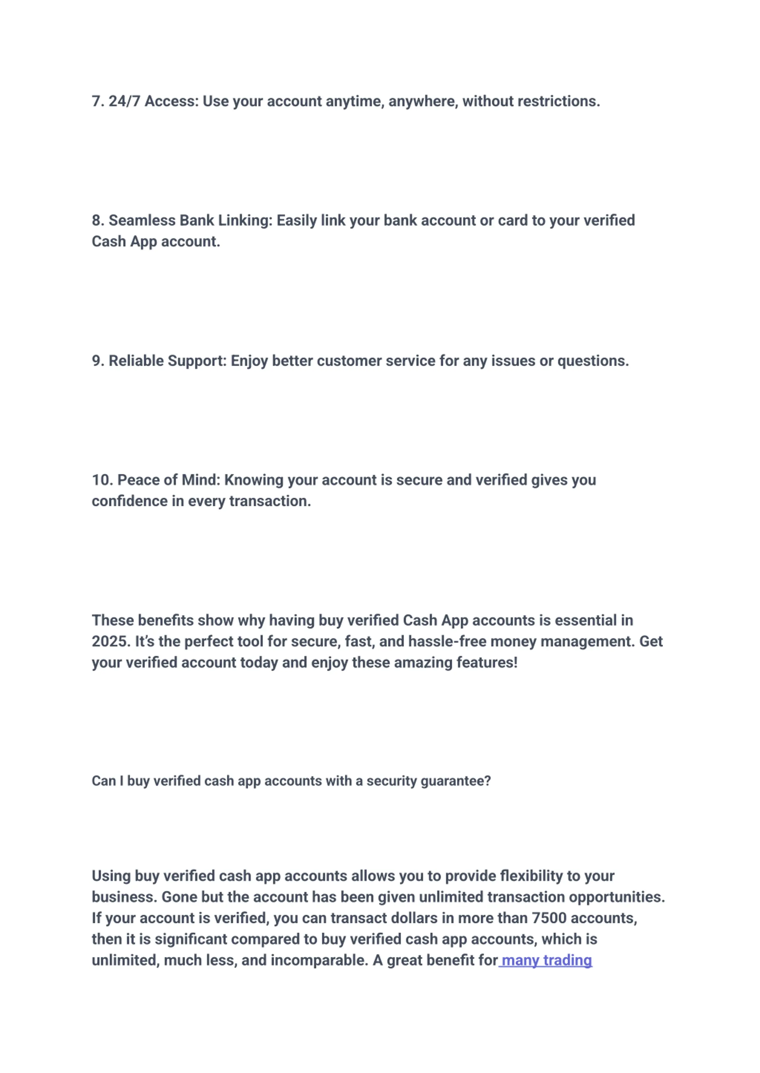 9. 7. 24/7 Access: Use your account anytime, anywhere, without restrictions. 8. Seamless Bank Linking: Easily link your bank account or card to your verified Cash App account. 9. Reliable Support: Enjoy better customer service for any issues or questions. 10. Peace of Mind: Knowing your account is secure and verified gives you confidence in every transaction. These benefits show why having buy verified Cash App accounts is essential in 2025. It s the perfect tool for secure, fast, and hassle-free money management. Get your verified account today and enjoy these amazing features! Can I buy verified cash app accounts with a security guarantee? Using buy verified cash app accounts allows you to provide flexibility to your business. Gone but the account has been given unlimited transaction opportunities. If your account is verified, you can transact dollars in more than 7500 accounts, then it is significant compared to buy verified cash app accounts, which is unlimited, much less, and incomparable. A great benefit for many trading