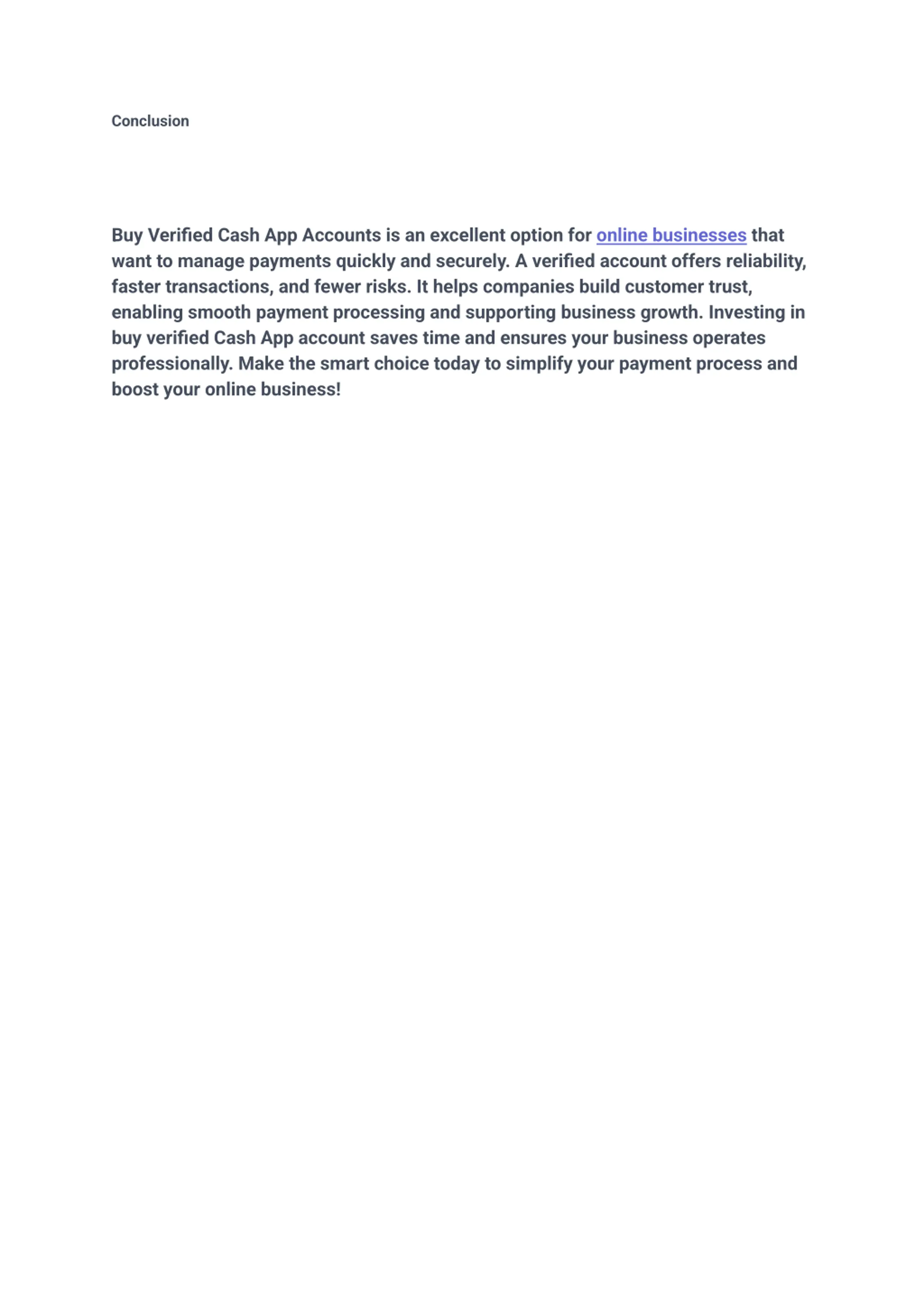 15. Conclusion Buy Verified Cash App Accounts is an excellent option for online businesses that want to manage payments quickly and securely. A verified account offers reliability, faster transactions, and fewer risks. It helps companies build customer trust, enabling smooth payment processing and supporting business growth. Investing in buy verified Cash App account saves time and ensures your business operates professionally. Make the smart choice today to simplify your payment process and boost your online business!
