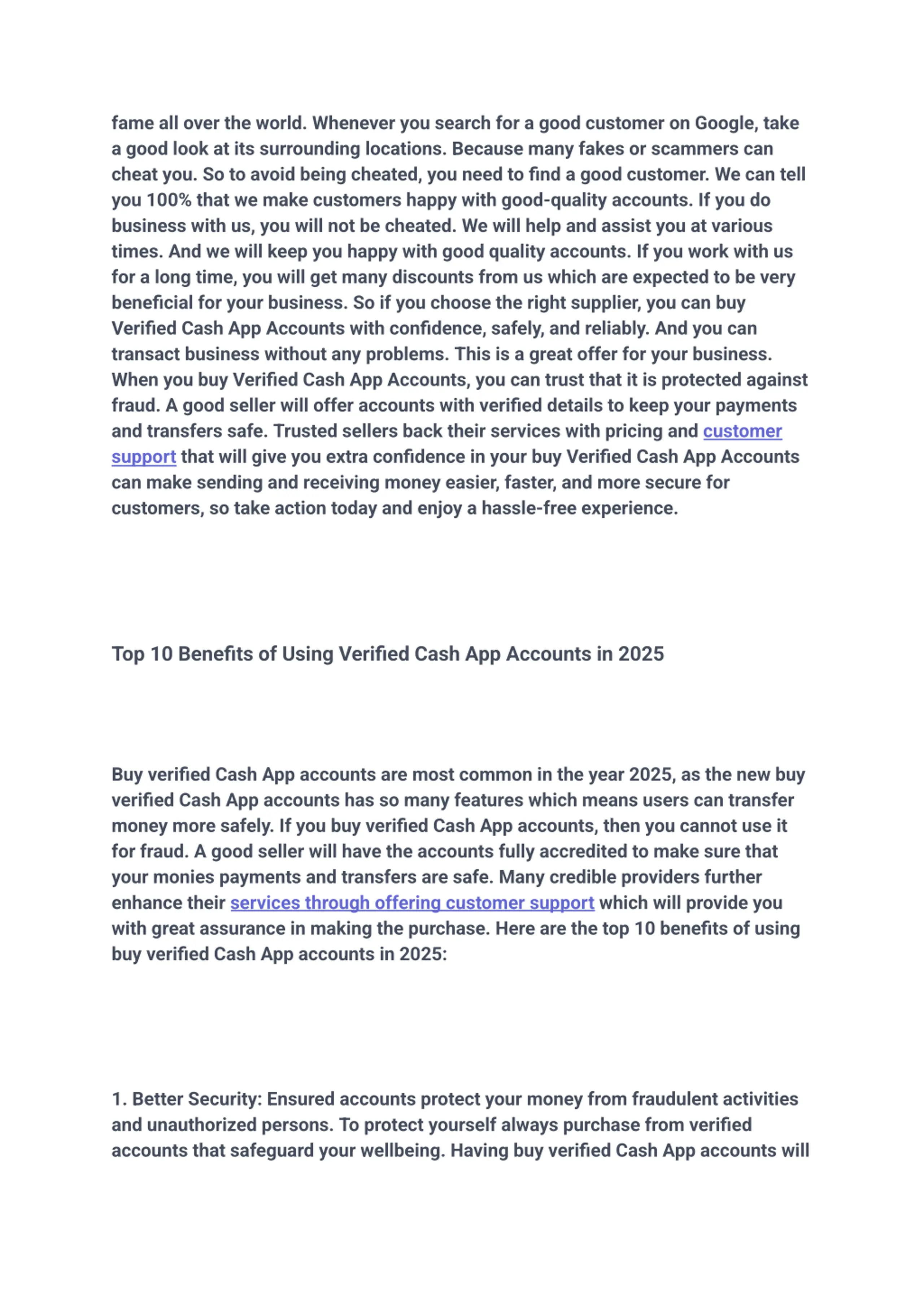 7. fame all over the world. Whenever you search for a good customer on Google, take a good look at its surrounding locations. Because many fakes or scammers can cheat you. So to avoid being cheated, you need to find a good customer. We can tell you 100% that we make customers happy with good-quality accounts. If you do business with us, you will not be cheated. We will help and assist you at various times. And we will keep you happy with good quality accounts. If you work with us for a long time, you will get many discounts from us which are expected to be very beneficial for your business. So if you choose the right supplier, you can buy Verified Cash App Accounts with confidence, safely, and reliably. And you can transact business without any problems. This is a great offer for your business. When you buy Verified Cash App Accounts, you can trust that it is protected against fraud. A good seller will offer accounts with verified details to keep your payments and transfers safe. Trusted sellers back their services with pricing and customer support that will give you extra confidence in your buy Verified Cash App Accounts can make sending and receiving money easier, faster, and more secure for customers, so take action today and enjoy a hassle-free experience. Top 10 Benefits of Using Verified Cash App Accounts in 2025 Buy verified Cash App accounts are most common in the year 2025, as the new buy verified Cash App accounts has so many features which means users can transfer money more safely. If you buy verified Cash App accounts, then you cannot use it for fraud. A good seller will have the accounts fully accredited to make sure that your monies payments and transfers are safe. Many credible providers further enhance their services through offering customer support which will provide you with great assurance in making the purchase. Here are the top 10 benefits of using buy verified Cash App accounts in 2025: 1. Better Security: Ensured accounts protect your money from fraudulent activities and unauthorized persons. To protect yourself always purchase from verified accounts that safeguard your wellbeing. Having buy verified Cash App accounts will