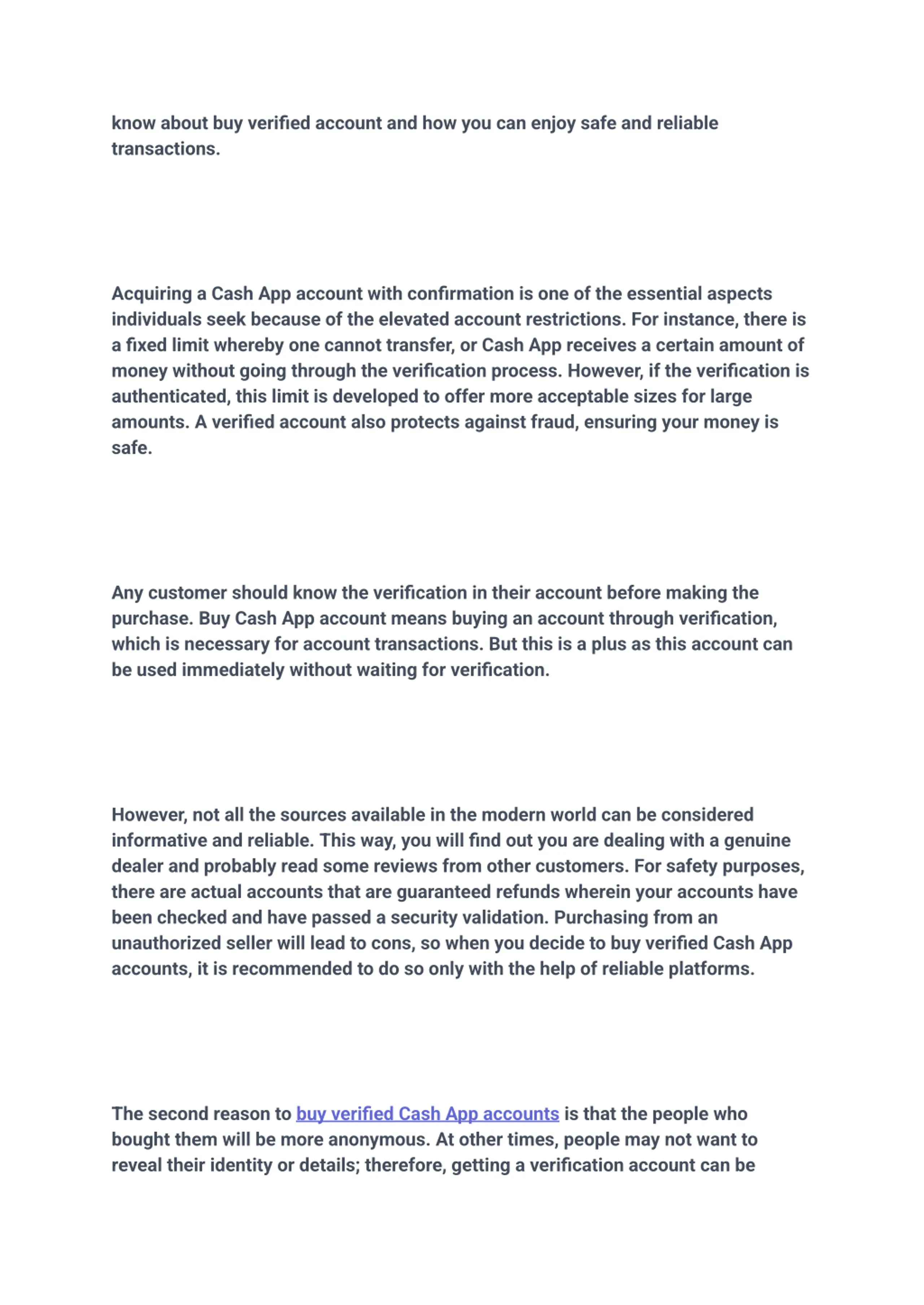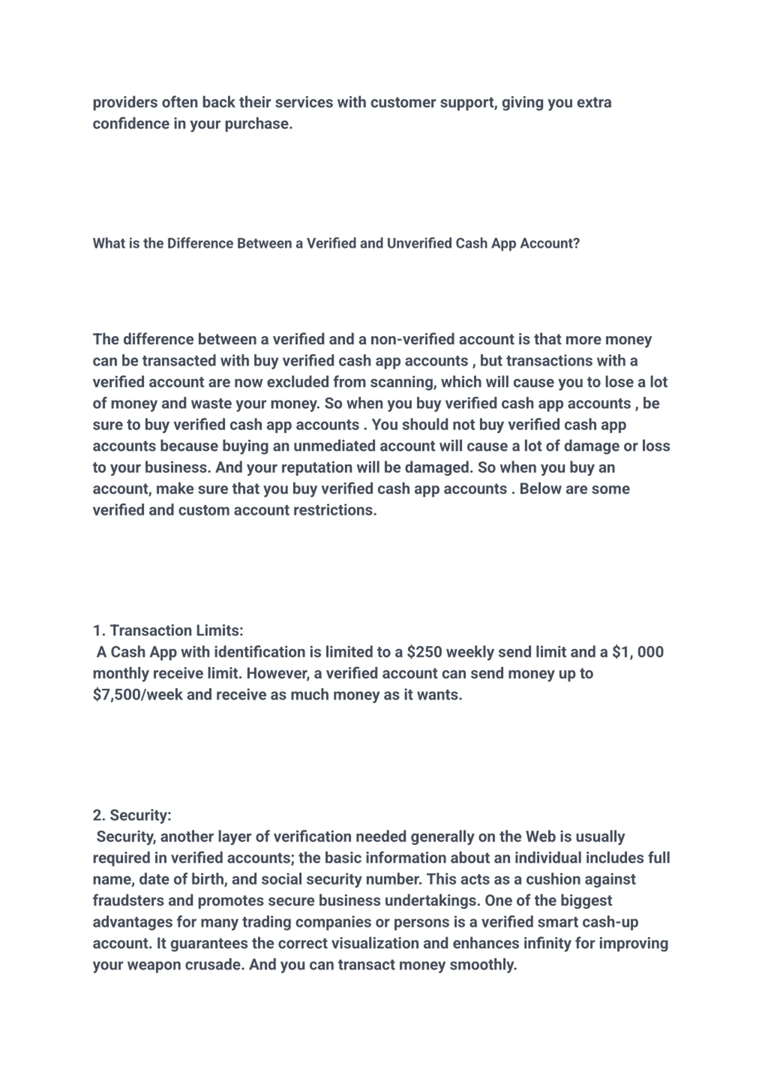 11. providers often back their services with customer support, giving you extra confidence in your purchase. What is the Difference Between a Verified and Unverified Cash App Account? The difference between a verified and a non-verified account is that more money can be transacted with buy verified cash app accounts , but transactions with a verified account are now excluded from scanning, which will cause you to lose a lot of money and waste your money. So when you buy verified cash app accounts , be sure to buy verified cash app accounts . You should not buy verified cash app accounts because buying an unmediated account will cause a lot of damage or loss to your business. And your reputation will be damaged. So when you buy an account, make sure that you buy verified cash app accounts . Below are some verified and custom account restrictions. 1. Transaction Limits: A Cash App with identification is limited to a $250 weekly send limit and a $1, 000 monthly receive limit. However, a verified account can send money up to $7,500/week and receive as much money as it wants. 2. Security: Security, another layer of verification needed generally on the Web is usually required in verified accounts; the basic information about an individual includes full name, date of birth, and social security number. This acts as a cushion against fraudsters and promotes secure business undertakings. One of the biggest advantages for many trading companies or persons is a verified smart cash-up account. It guarantees the correct visualization and enhances infinity for improving your weapon crusade. And you can transact money smoothly.