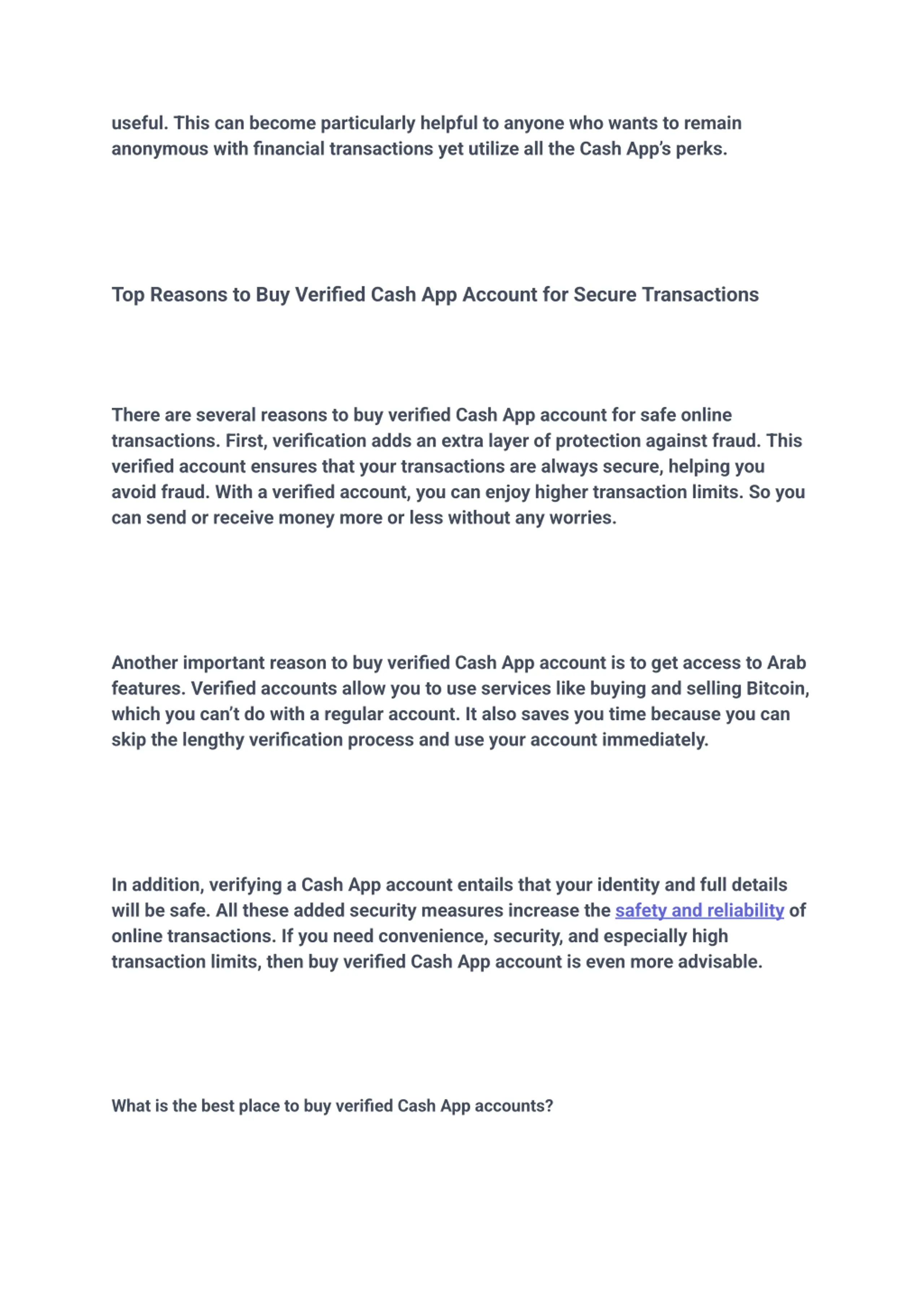 4. useful. This can become particularly helpful to anyone who wants to remain anonymous with financial transactions yet utilize all the Cash App s perks. Top Reasons to Buy Verified Cash App Account for Secure Transactions There are several reasons to buy verified Cash App account for safe online transactions. First, verification adds an extra layer of protection against fraud. This verified account ensures that your transactions are always secure, helping you avoid fraud. With a verified account, you can enjoy higher transaction limits. So you can send or receive money more or less without any worries. Another important reason to buy verified Cash App account is to get access to Arab features. Verified accounts allow you to use services like buying and selling Bitcoin, which you can t do with a regular account. It also saves you time because you can skip the lengthy verification process and use your account immediately. In addition, verifying a Cash App account entails that your identity and full details will be safe. All these added security measures increase the safety and reliability of online transactions. If you need convenience, security, and especially high transaction limits, then buy verified Cash App account is even more advisable. What is the best place to buy verified Cash App accounts?