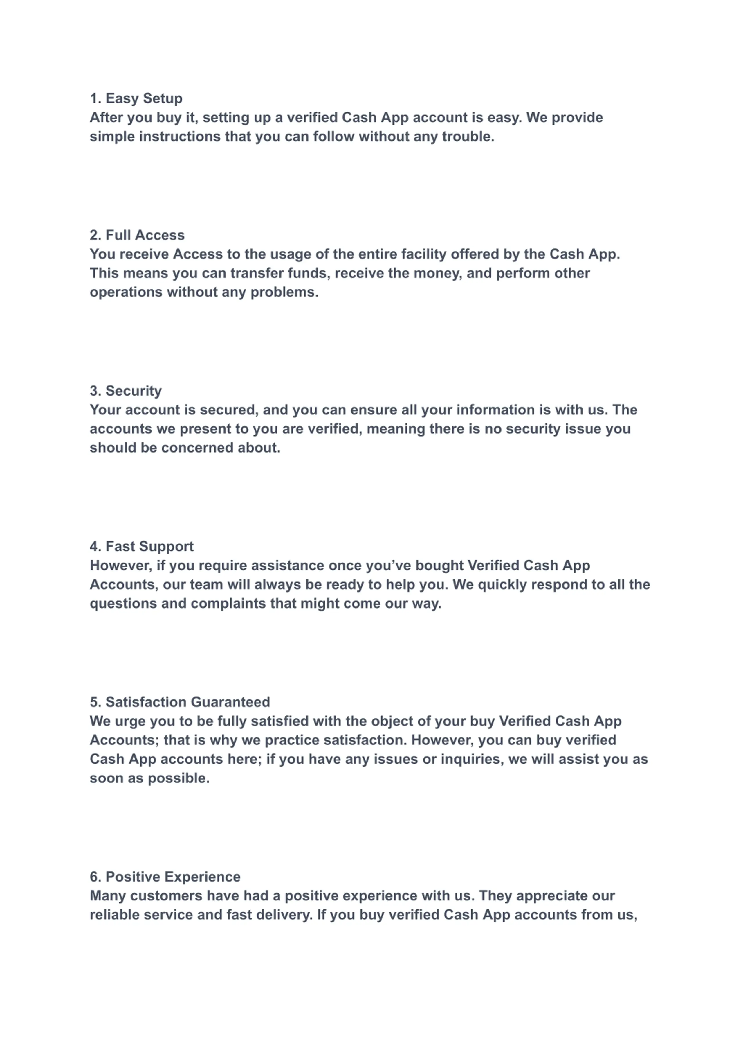 43. 1. Easy Setup After you buy it, setting up a verified Cash App account is easy. We provide simple instructions that you can follow without any trouble. 2. Full Access You receive Access to the usage of the entire facility offered by the Cash App. This means you can transfer funds, receive the money, and perform other operations without any problems. 3. Security Your account is secured, and you can ensure all your information is with us. The accounts we present to you are verified, meaning there is no security issue you should be concerned about. 4. Fast Support However, if you require assistance once you ve bought Verified Cash App Accounts, our team will always be ready to help you. We quickly respond to all the questions and complaints that might come our way. 5. Satisfaction Guaranteed We urge you to be fully satisfied with the object of your buy Verified Cash App Accounts; that is why we practice satisfaction. However, you can buy verified Cash App accounts here; if you have any issues or inquiries, we will assist you as soon as possible. 6. Positive Experience Many customers have had a positive experience with us. They appreciate our reliable service and fast delivery. If you buy verified Cash App accounts from us,