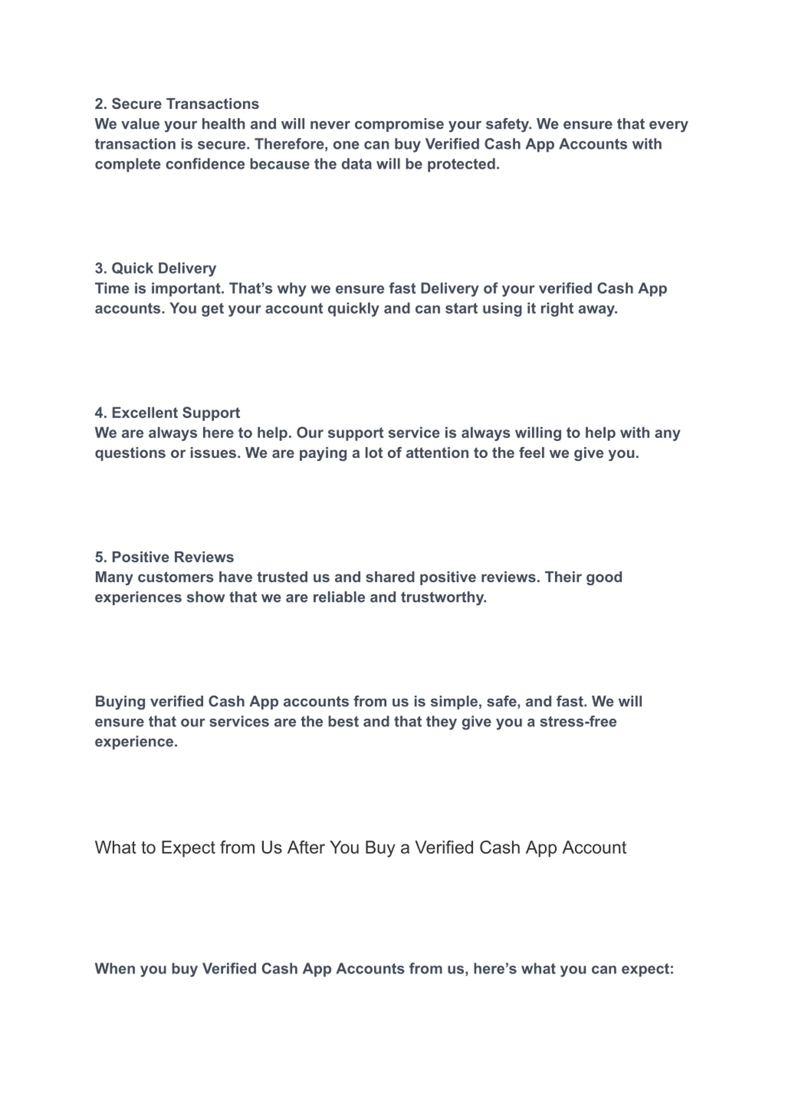 42. 2. Secure Transactions We value your health and will never compromise your safety. We ensure that every transaction is secure. Therefore, one can buy Verified Cash App Accounts with complete confidence because the data will be protected. 3. Quick Delivery Time is important. That s why we ensure fast Delivery of your verified Cash App accounts. You get your account quickly and can start using it right away. 4. Excellent Support We are always here to help. Our support service is always willing to help with any questions or issues. We are paying a lot of attention to the feel we give you. 5. Positive Reviews Many customers have trusted us and shared positive reviews. Their good experiences show that we are reliable and trustworthy. Buying verified Cash App accounts from us is simple, safe, and fast. We will ensure that our services are the best and that they give you a stress-free experience. What to Expect from Us After You Buy a Verified Cash App Account When you buy Verified Cash App Accounts from us, here s what you can expect: