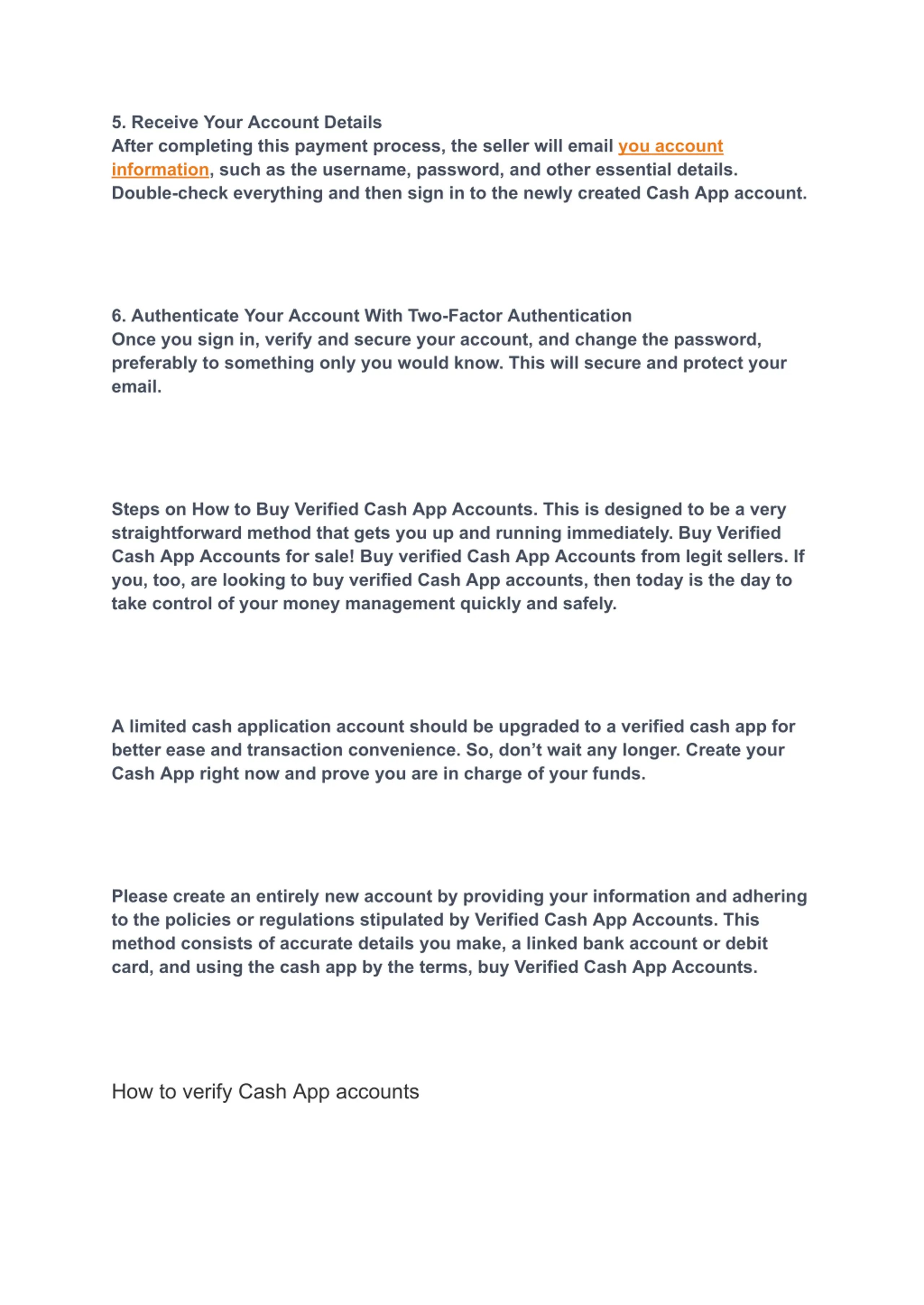 16. 5. Receive Your Account Details After completing this payment process, the seller will email you account information, such as the username, password, and other essential details. Double-check everything and then sign in to the newly created Cash App account. 6. Authenticate Your Account With Two-Factor Authentication Once you sign in, verify and secure your account, and change the password, preferably to something only you would know. This will secure and protect your email. Steps on How to Buy Verified Cash App Accounts. This is designed to be a very straightforward method that gets you up and running immediately. Buy Verified Cash App Accounts for sale! Buy verified Cash App Accounts from legit sellers. If you, too, are looking to buy verified Cash App accounts, then today is the day to take control of your money management quickly and safely. A limited cash application account should be upgraded to a verified cash app for better ease and transaction convenience. So, don t wait any longer. Create your Cash App right now and prove you are in charge of your funds. Please create an entirely new account by providing your information and adhering to the policies or regulations stipulated by Verified Cash App Accounts. This method consists of accurate details you make, a linked bank account or debit card, and using the cash app by the terms, buy Verified Cash App Accounts. How to verify Cash App accounts
