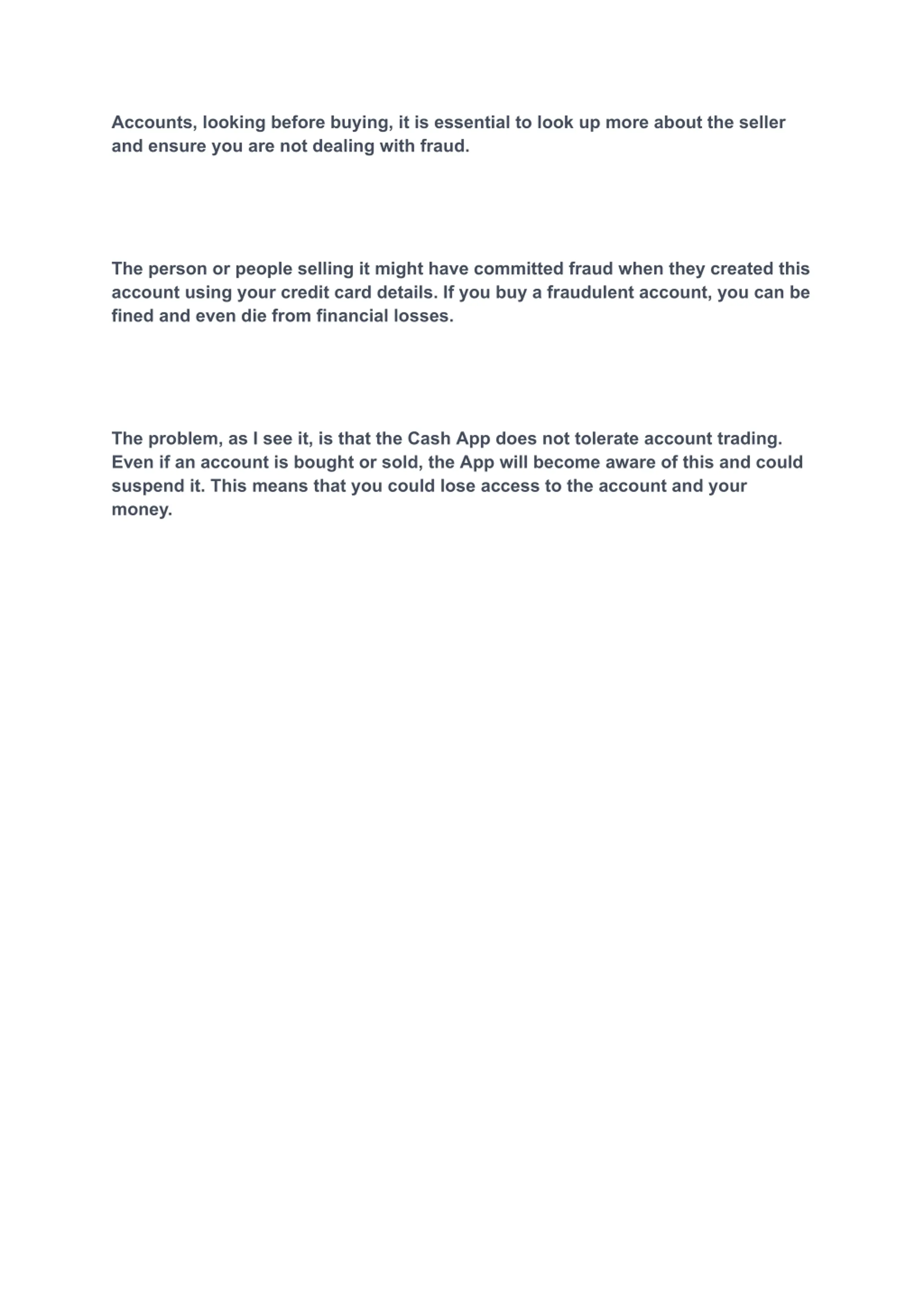 28. Accounts, looking before buying, it is essential to look up more about the seller and ensure you are not dealing with fraud. The person or people selling it might have committed fraud when they created this account using your credit card details. If you buy a fraudulent account, you can be fined and even die from financial losses. The problem, as I see it, is that the Cash App does not tolerate account trading. Even if an account is bought or sold, the App will become aware of this and could suspend it. This means that you could lose access to the account and your money.