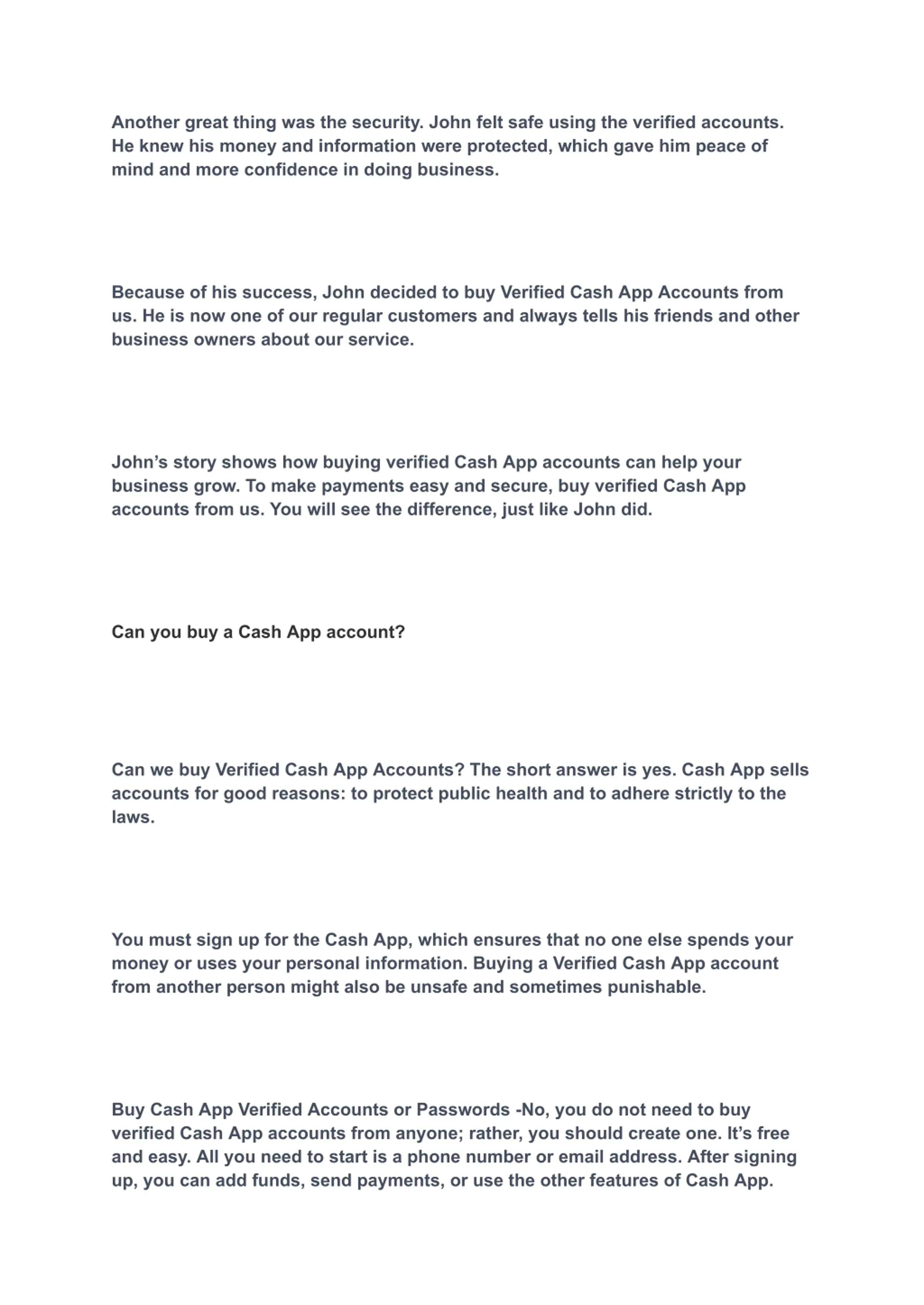 46. When you choose us to buy Verified Cash App Accounts, you choose a reliable, fast, and affordable service. Our goal is to ensure your satisfaction with your purchase. Try us and experience the difference for yourself. Our Previous Client s Success Story After Buying Verified Cash App Accounts When you buy verified Cash App accounts from us, you want to know they will make a positive difference. Here is a success story from one of our happy clients. John runs a small online business. He wants to make payments and receive money quickly, but faces many problems with other payment methods. John decided to buy verified Cash App accounts from our service. After he bought the accounts, things changed for the better. John could now send and receive money quickly and without any trouble. His customers were happy because the payments were smooth and fast, which helped John attract more customers and grow his business. John also saves a lot of time. He no longer has to worry about payments and can focus on improving his business. A verified Cash App account makes everything easier for him.