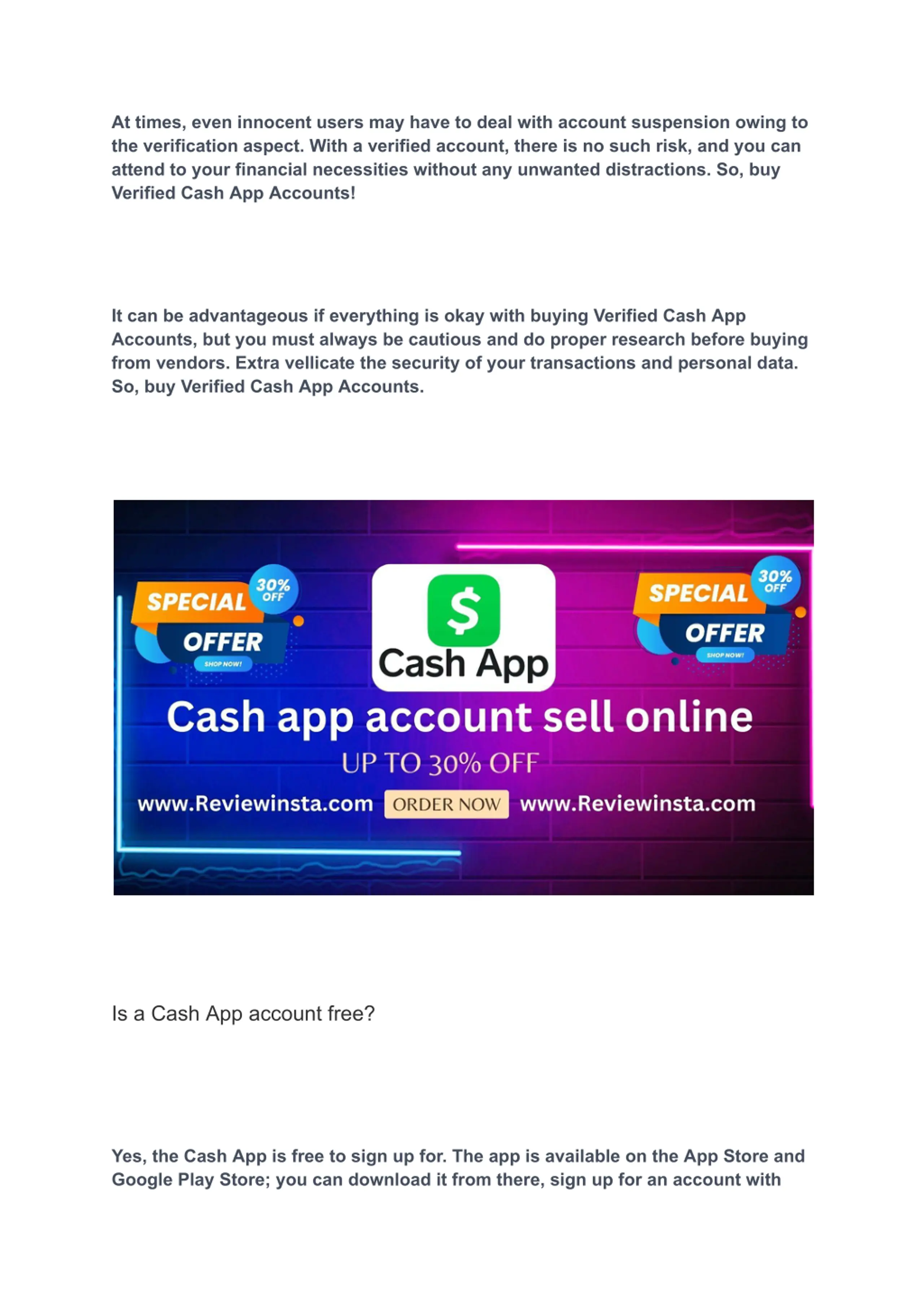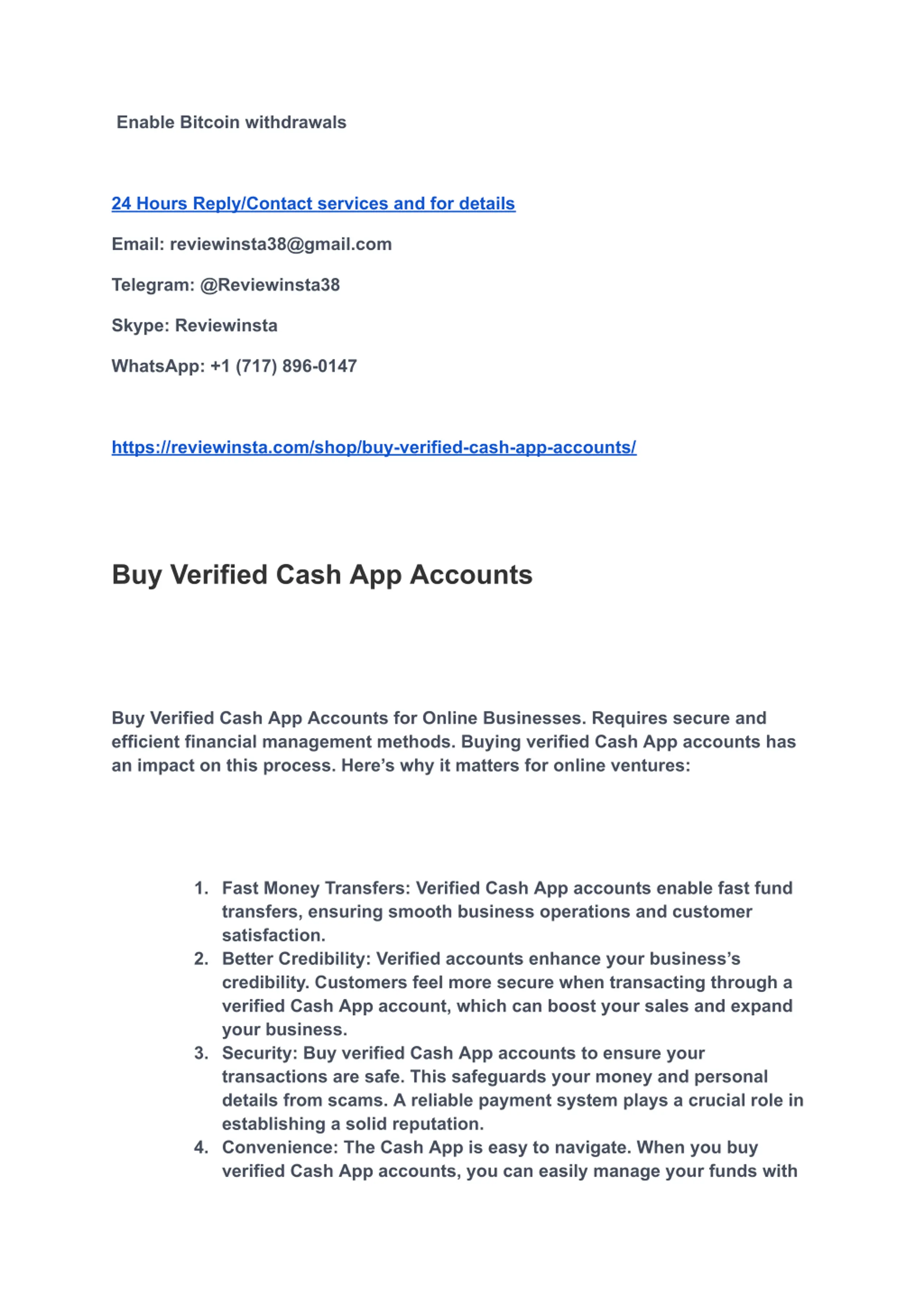 2. Enable Bitcoin withdrawals 24 Hours Reply/Contact services and for details Email: reviewinsta38@gmail.com Telegram: @Reviewinsta38 Skype: Reviewinsta WhatsApp: +1 (717) 896-0147 https://reviewinsta.com/shop/buy-verified-cash-app-accounts/ Buy Verified Cash App Accounts Buy Verified Cash App Accounts for Online Businesses. Requires secure and efficient financial management methods. Buying verified Cash App accounts has an impact on this process. Here s why it matters for online ventures: 1. Fast Money Transfers: Verified Cash App accounts enable fast fund transfers, ensuring smooth business operations and customer satisfaction. 2. Better Credibility: Verified accounts enhance your business s credibility. Customers feel more secure when transacting through a verified Cash App account, which can boost your sales and expand your business. 3. Security: Buy verified Cash App accounts to ensure your transactions are safe. This safeguards your money and personal details from scams. A reliable payment system plays a crucial role in establishing a solid reputation. 4. Convenience: The Cash App is easy to navigate. When you buy verified Cash App accounts, you can easily manage your funds with