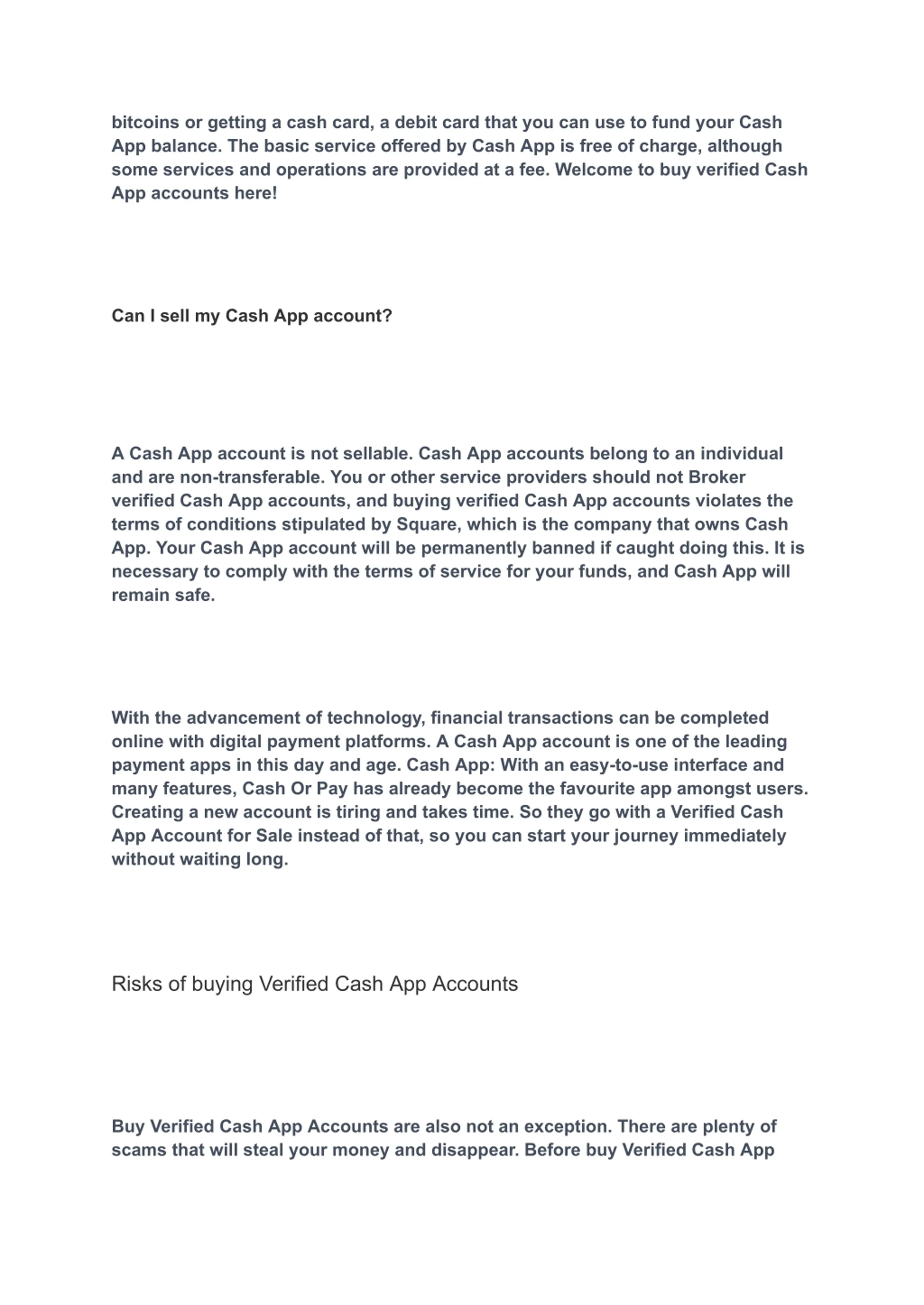 27. bitcoins or getting a cash card, a debit card that you can use to fund your Cash App balance. The basic service offered by Cash App is free of charge, although some services and operations are provided at a fee. Welcome to buy verified Cash App accounts here! Can I sell my Cash App account? A Cash App account is not sellable. Cash App accounts belong to an individual and are non-transferable. You or other service providers should not Broker verified Cash App accounts, and buying verified Cash App accounts violates the terms of conditions stipulated by Square, which is the company that owns Cash App. Your Cash App account will be permanently banned if caught doing this. It is necessary to comply with the terms of service for your funds, and Cash App will remain safe. With the advancement of technology, financial transactions can be completed online with digital payment platforms. A Cash App account is one of the leading payment apps in this day and age. Cash App: With an easy-to-use interface and many features, Cash Or Pay has already become the favourite app amongst users. Creating a new account is tiring and takes time. So they go with a Verified Cash App Account for Sale instead of that, so you can start your journey immediately without waiting long. Risks of buying Verified Cash App Accounts Buy Verified Cash App Accounts are also not an exception. There are plenty of scams that will steal your money and disappear. Before buy Verified Cash App