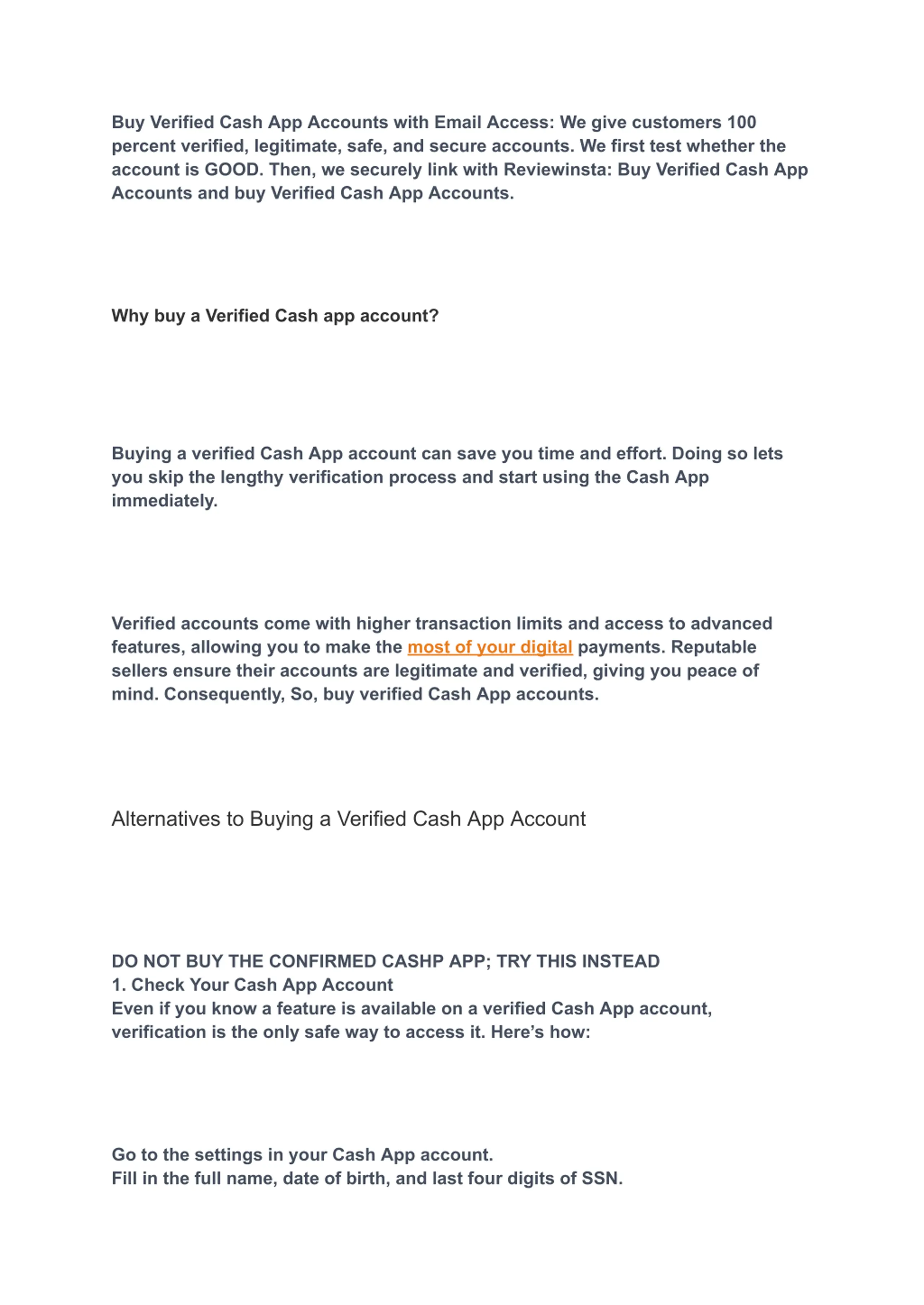 20. Buy Verified Cash App Accounts with Email Access: We give customers 100 percent verified, legitimate, safe, and secure accounts. We first test whether the account is GOOD. Then, we securely link with Reviewinsta: Buy Verified Cash App Accounts and buy Verified Cash App Accounts. Why buy a Verified Cash app account? Buying a verified Cash App account can save you time and effort. Doing so lets you skip the lengthy verification process and start using the Cash App immediately. Verified accounts come with higher transaction limits and access to advanced features, allowing you to make the most of your digital payments. Reputable sellers ensure their accounts are legitimate and verified, giving you peace of mind. Consequently, So, buy verified Cash App accounts. Alternatives to Buying a Verified Cash App Account DO NOT BUY THE CONFIRMED CASHP APP; TRY THIS INSTEAD 1. Check Your Cash App Account Even if you know a feature is available on a verified Cash App account, verification is the only safe way to access it. Here s how: Go to the settings in your Cash App account. Fill in the full name, date of birth, and last four digits of SSN.