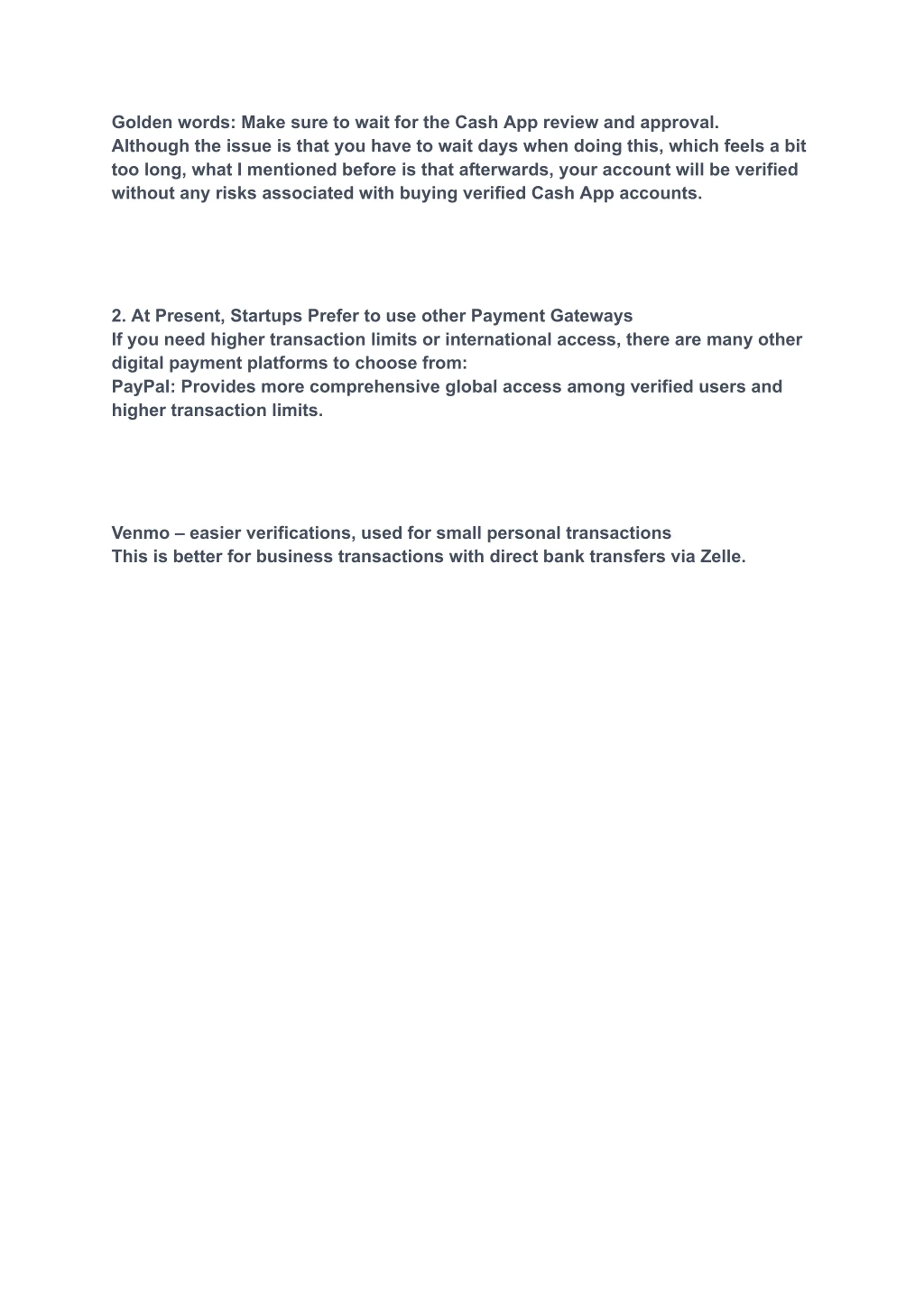 21. Golden words: Make sure to wait for the Cash App review and approval. Although the issue is that you have to wait days when doing this, which feels a bit too long, what I mentioned before is that afterwards, your account will be verified without any risks associated with buying verified Cash App accounts. 2. At Present, Startups Prefer to use other Payment Gateways If you need higher transaction limits or international access, there are many other digital payment platforms to choose from: PayPal: Provides more comprehensive global access among verified users and higher transaction limits. Venmo easier verifications, used for small personal transactions This is better for business transactions with direct bank transfers via Zelle.