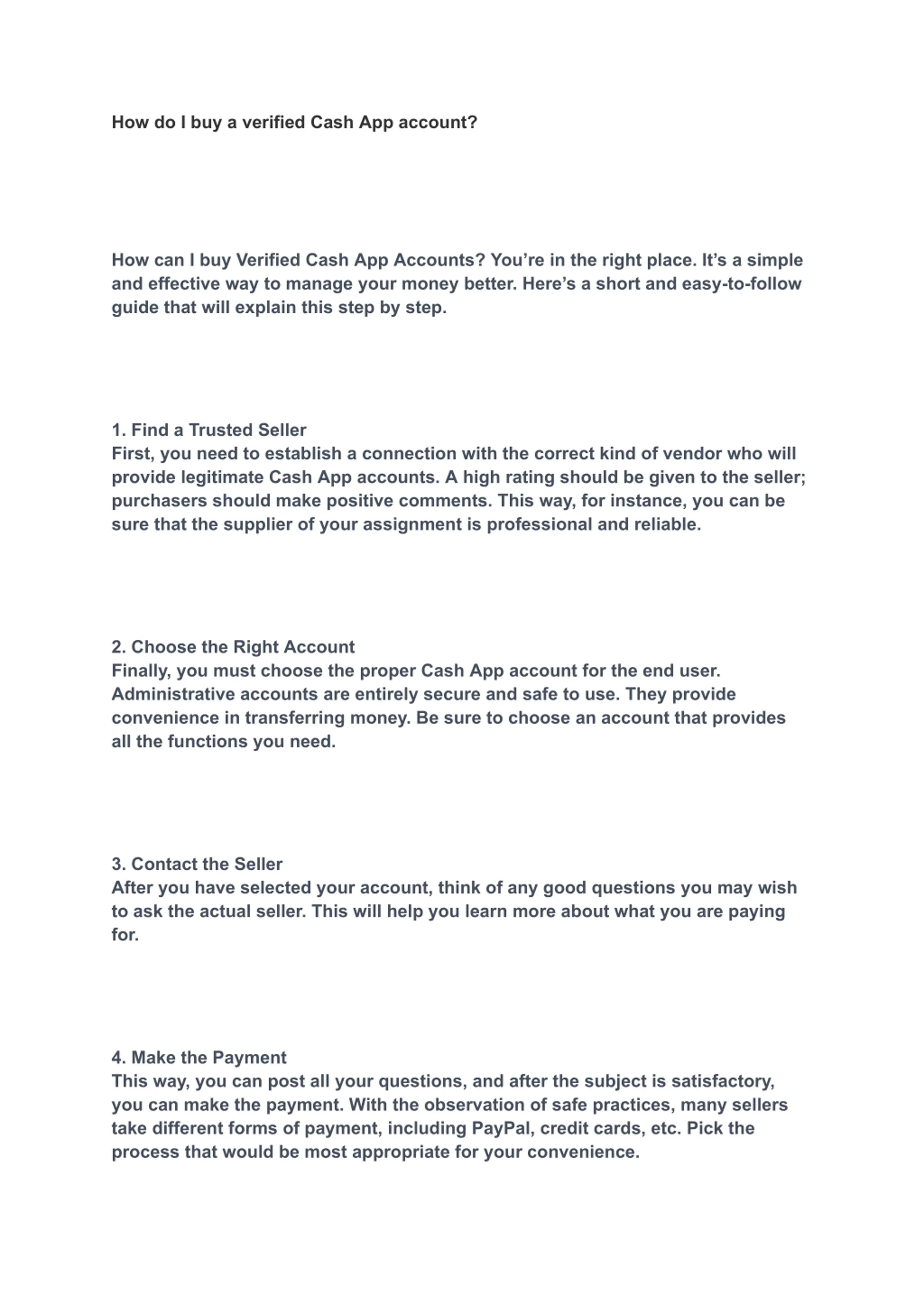 15. How do I buy a verified Cash App account? How can I buy Verified Cash App Accounts? You re in the right place. It s a simple and effective way to manage your money better. Here s a short and easy-to-follow guide that will explain this step by step. 1. Find a Trusted Seller First, you need to establish a connection with the correct kind of vendor who will provide legitimate Cash App accounts. A high rating should be given to the seller; purchasers should make positive comments. This way, for instance, you can be sure that the supplier of your assignment is professional and reliable. 2. Choose the Right Account Finally, you must choose the proper Cash App account for the end user. Administrative accounts are entirely secure and safe to use. They provide convenience in transferring money. Be sure to choose an account that provides all the functions you need. 3. Contact the Seller After you have selected your account, think of any good questions you may wish to ask the actual seller. This will help you learn more about what you are paying for. 4. Make the Payment This way, you can post all your questions, and after the subject is satisfactory, you can make the payment. With the observation of safe practices, many sellers take different forms of payment, including PayPal, credit cards, etc. Pick the process that would be most appropriate for your convenience.