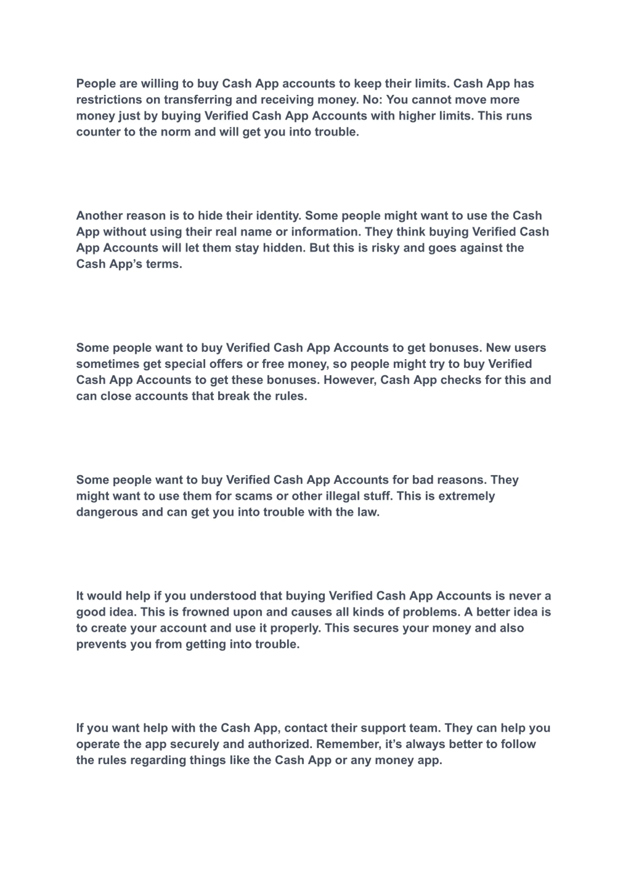 50. People are willing to buy Cash App accounts to keep their limits. Cash App has restrictions on transferring and receiving money. No: You cannot move more money just by buying Verified Cash App Accounts with higher limits. This runs counter to the norm and will get you into trouble. Another reason is to hide their identity. Some people might want to use the Cash App without using their real name or information. They think buying Verified Cash App Accounts will let them stay hidden. But this is risky and goes against the Cash App s terms. Some people want to buy Verified Cash App Accounts to get bonuses. New users sometimes get special offers or free money, so people might try to buy Verified Cash App Accounts to get these bonuses. However, Cash App checks for this and can close accounts that break the rules. Some people want to buy Verified Cash App Accounts for bad reasons. They might want to use them for scams or other illegal stuff. This is extremely dangerous and can get you into trouble with the law. It would help if you understood that buying Verified Cash App Accounts is never a good idea. This is frowned upon and causes all kinds of problems. A better idea is to create your account and use it properly. This secures your money and also prevents you from getting into trouble. If you want help with the Cash App, contact their support team. They can help you operate the app securely and authorized. Remember, it s always better to follow the rules regarding things like the Cash App or any money app.