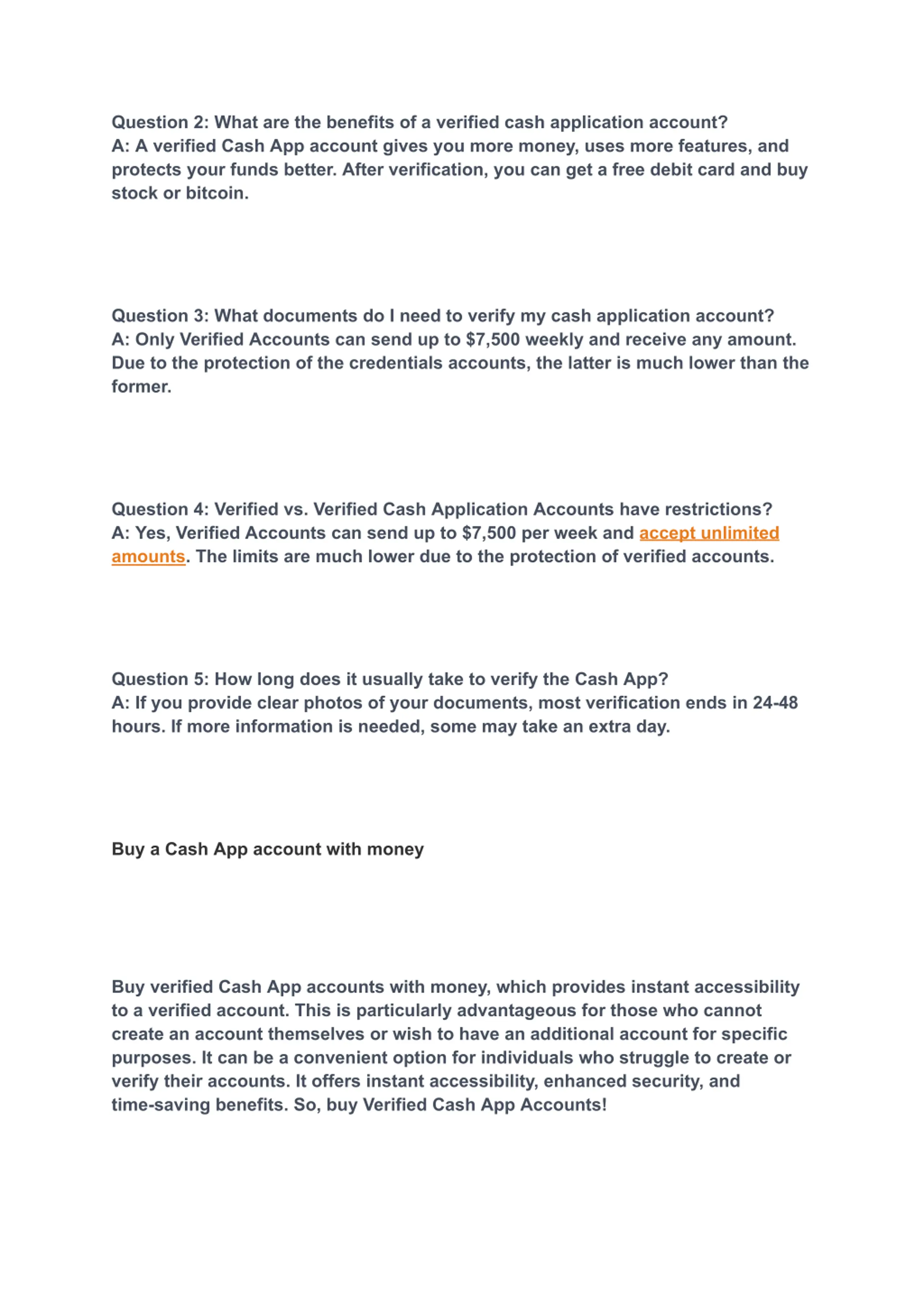37. Question 2: What are the benefits of a verified cash application account? A: A verified Cash App account gives you more money, uses more features, and protects your funds better. After verification, you can get a free debit card and buy stock or bitcoin. Question 3: What documents do I need to verify my cash application account? A: Only Verified Accounts can send up to $7,500 weekly and receive any amount. Due to the protection of the credentials accounts, the latter is much lower than the former. Question 4: Verified vs. Verified Cash Application Accounts have restrictions? A: Yes, Verified Accounts can send up to $7,500 per week and accept unlimited amounts. The limits are much lower due to the protection of verified accounts. Question 5: How long does it usually take to verify the Cash App? A: If you provide clear photos of your documents, most verification ends in 24-48 hours. If more information is needed, some may take an extra day. Buy a Cash App account with money Buy verified Cash App accounts with money, which provides instant accessibility to a verified account. This is particularly advantageous for those who cannot create an account themselves or wish to have an additional account for specific purposes. It can be a convenient option for individuals who struggle to create or verify their accounts. It offers instant accessibility, enhanced security, and time-saving benefits. So, buy Verified Cash App Accounts!