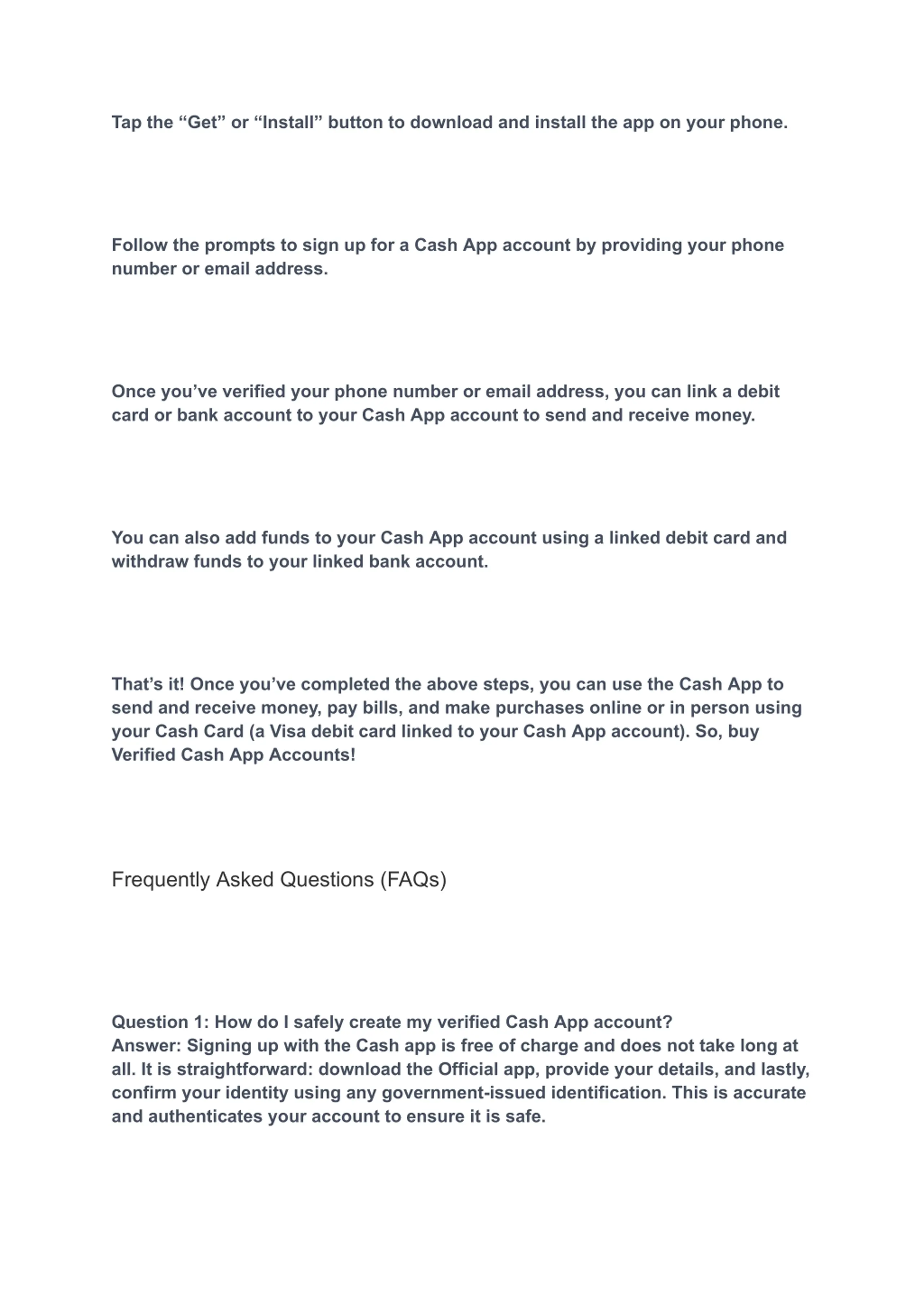 36. Tap the Get or Install button to download and install the app on your phone. Follow the prompts to sign up for a Cash App account by providing your phone number or email address. Once you ve verified your phone number or email address, you can link a debit card or bank account to your Cash App account to send and receive money. You can also add funds to your Cash App account using a linked debit card and withdraw funds to your linked bank account. That s it! Once you ve completed the above steps, you can use the Cash App to send and receive money, pay bills, and make purchases online or in person using your Cash Card (a Visa debit card linked to your Cash App account). So, buy Verified Cash App Accounts! Frequently Asked Questions (FAQs) Question 1: How do I safely create my verified Cash App account? Answer: Signing up with the Cash app is free of charge and does not take long at all. It is straightforward: download the Official app, provide your details, and lastly, confirm your identity using any government-issued identification. This is accurate and authenticates your account to ensure it is safe.