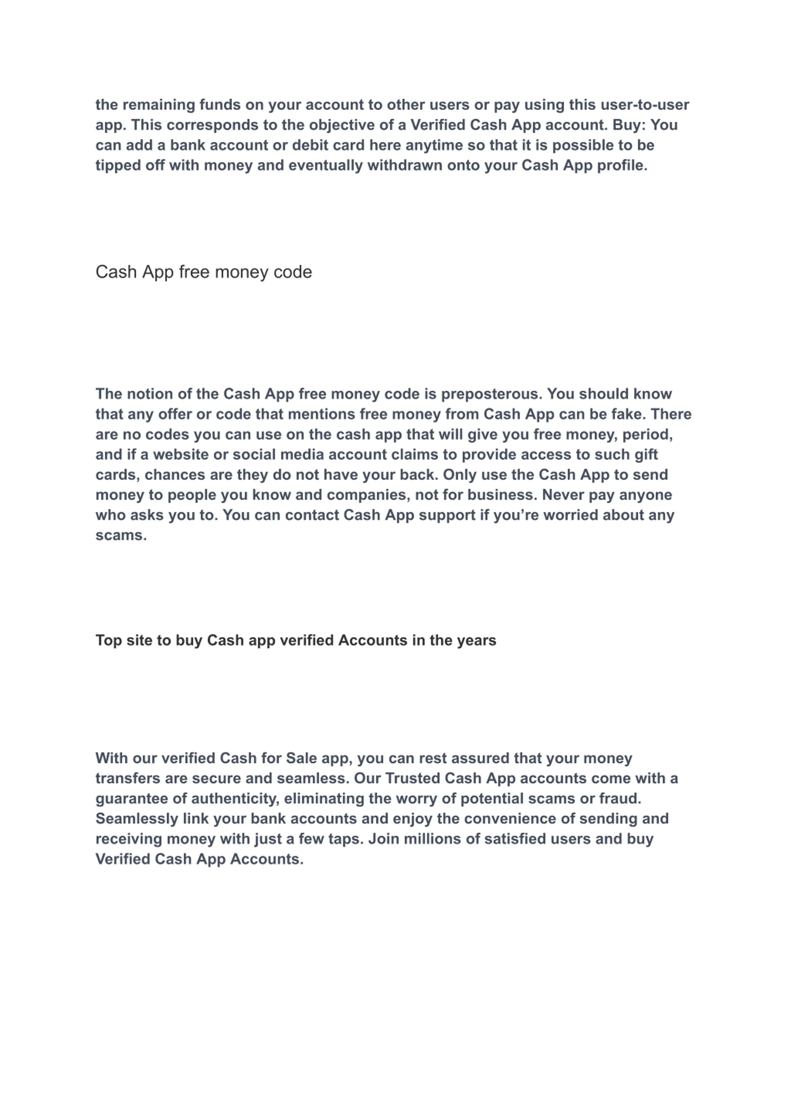 25. the remaining funds on your account to other users or pay using this user-to-user app. This corresponds to the objective of a Verified Cash App account. Buy: You can add a bank account or debit card here anytime so that it is possible to be tipped off with money and eventually withdrawn onto your Cash App profile. Cash App free money code The notion of the Cash App free money code is preposterous. You should know that any offer or code that mentions free money from Cash App can be fake. There are no codes you can use on the cash app that will give you free money, period, and if a website or social media account claims to provide access to such gift cards, chances are they do not have your back. Only use the Cash App to send money to people you know and companies, not for business. Never pay anyone who asks you to. You can contact Cash App support if you re worried about any scams. Top site to buy Cash app verified Accounts in the years With our verified Cash for Sale app, you can rest assured that your money transfers are secure and seamless. Our Trusted Cash App accounts come with a guarantee of authenticity, eliminating the worry of potential scams or fraud. Seamlessly link your bank accounts and enjoy the convenience of sending and receiving money with just a few taps. Join millions of satisfied users and buy Verified Cash App Accounts.