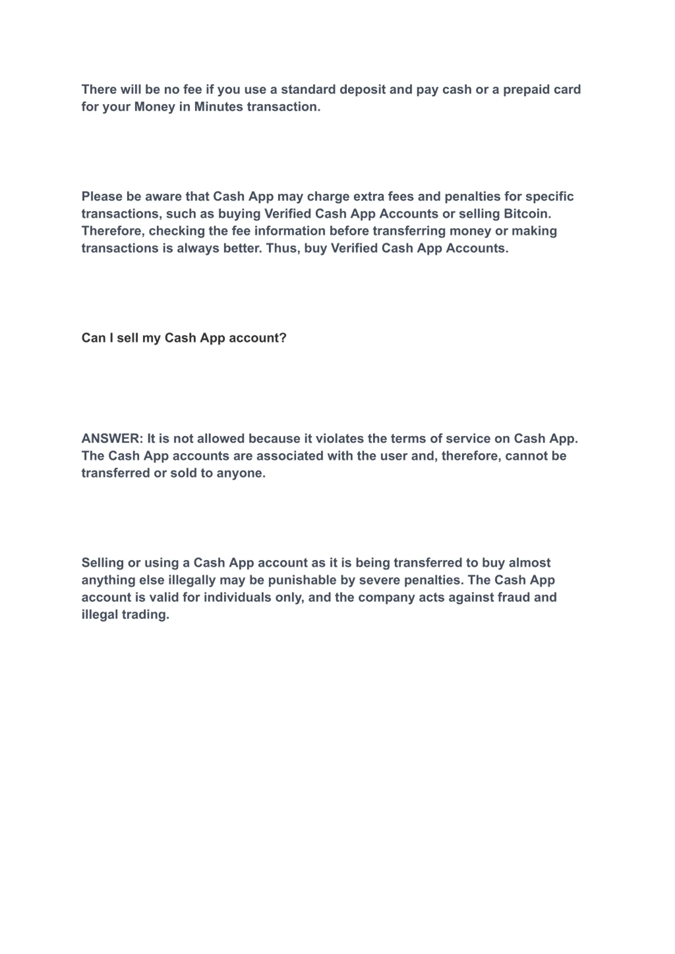 33. There will be no fee if you use a standard deposit and pay cash or a prepaid card for your Money in Minutes transaction. Please be aware that Cash App may charge extra fees and penalties for specific transactions, such as buying Verified Cash App Accounts or selling Bitcoin. Therefore, checking the fee information before transferring money or making transactions is always better. Thus, buy Verified Cash App Accounts. Can I sell my Cash App account? ANSWER: It is not allowed because it violates the terms of service on Cash App. The Cash App accounts are associated with the user and, therefore, cannot be transferred or sold to anyone. Selling or using a Cash App account as it is being transferred to buy almost anything else illegally may be punishable by severe penalties. The Cash App account is valid for individuals only, and the company acts against fraud and illegal trading.