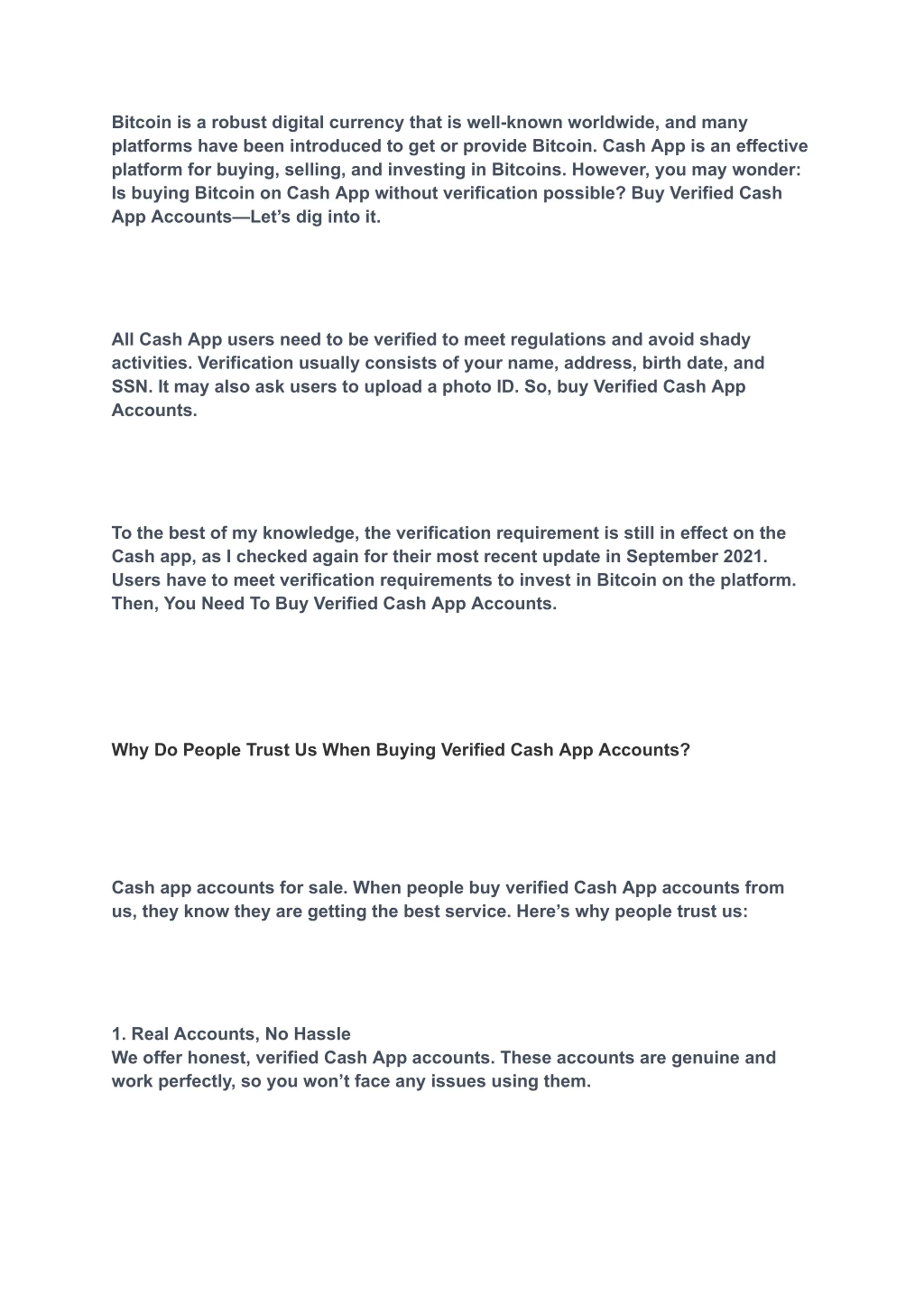 Bitcoin is a robust digital currency that is well-known worldwide, and many platforms have been introduced to get or provide Bitcoin. Cash App is an effective platform for buying, selling, and investing in Bitcoins. However, you may wonder: Is buying Bitcoin on Cash App without verification possible? Buy Verified Cash App Accounts Let s dig into it. All Cash App users need to be verified to meet regulations and avoid shady activities. Verification usually consists of your name, address, birth date, and SSN. It may also ask users to upload a photo ID. So, buy Verified Cash App Accounts. To the best of my knowledge, the verification requirement is still in effect on the Cash app, as I checked again for their most recent update in September 2021. Users have to meet verification requirements to invest in Bitcoin on the platform. Then, You Need To Buy Verified Cash App Accounts. Why Do People Trust Us When Buying Verified Cash App Accounts? Cash app accounts for sale. When people buy verified Cash App accounts from us, they know they are getting the best service. Here s why people trust us: 1. Real Accounts, No Hassle We offer honest, verified Cash App accounts. These accounts are genuine and work perfectly, so you won t face any issues using them.