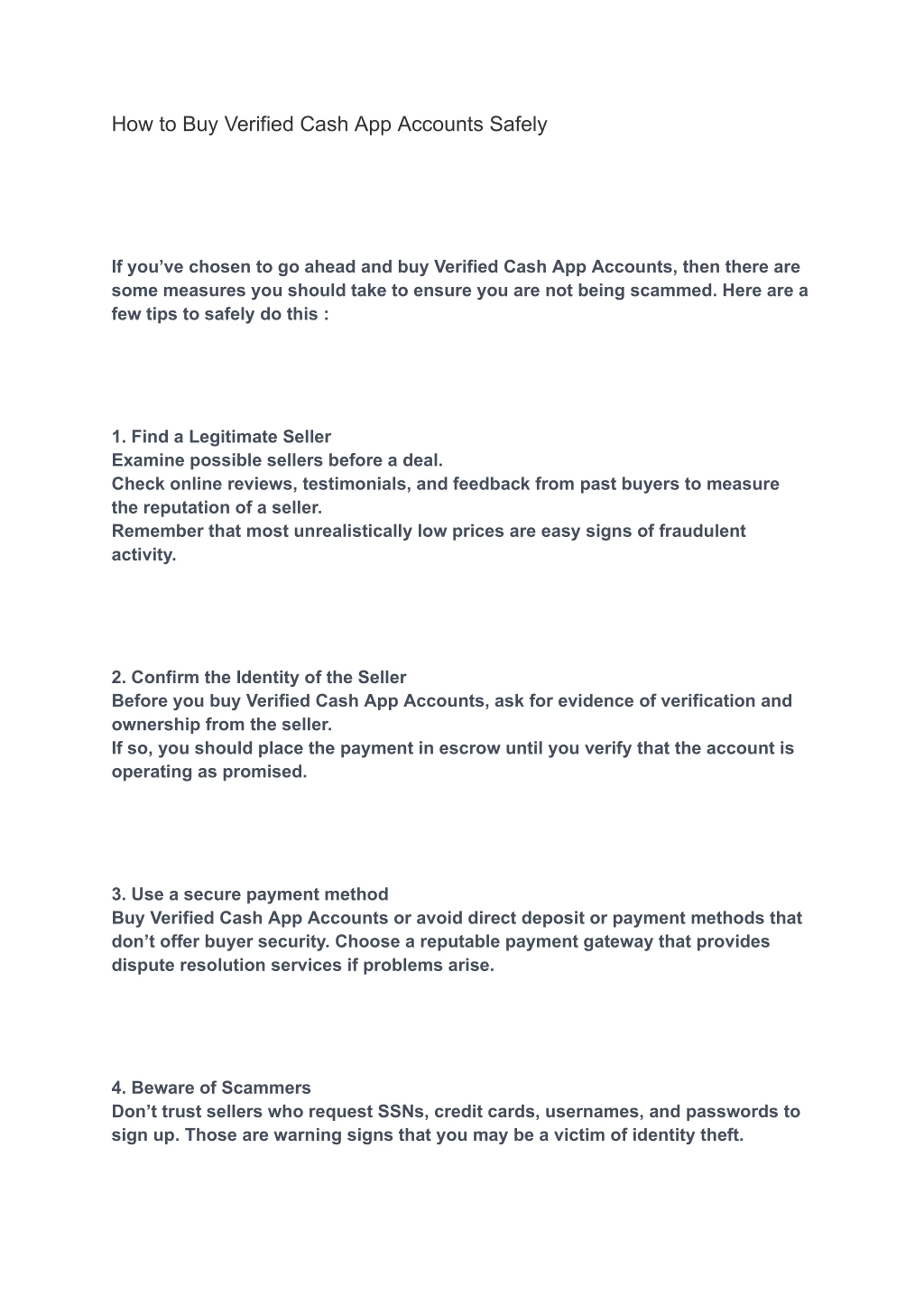 How to Buy Verified Cash App Accounts Safely If you ve chosen to go ahead and buy Verified Cash App Accounts, then there are some measures you should take to ensure you are not being scammed. Here are a few tips to safely do this : 1. Find a Legitimate Seller Examine possible sellers before a deal. Check online reviews, testimonials, and feedback from past buyers to measure the reputation of a seller. Remember that most unrealistically low prices are easy signs of fraudulent activity. 2. Confirm the Identity of the Seller Before you buy Verified Cash App Accounts, ask for evidence of verification and ownership from the seller. If so, you should place the payment in escrow until you verify that the account is operating as promised. 3. Use a secure payment method Buy Verified Cash App Accounts or avoid direct deposit or payment methods that don t offer buyer security. Choose a reputable payment gateway that provides dispute resolution services if problems arise. 4. Beware of Scammers Don t trust sellers who request SSNs, credit cards, usernames, and passwords to sign up. Those are warning signs that you may be a victim of identity theft.