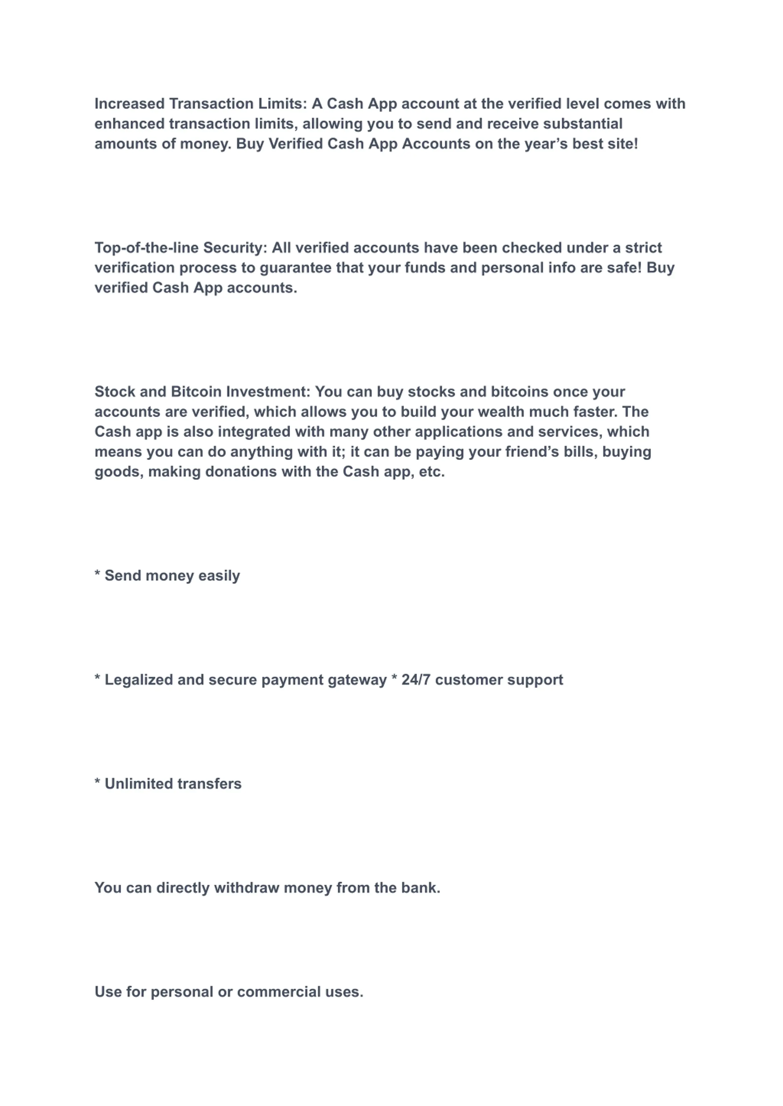 Increased Transaction Limits: A Cash App account at the verified level comes with enhanced transaction limits, allowing you to send and receive substantial amounts of money. Buy Verified Cash App Accounts on the year s best site! Top-of-the-line Security: All verified accounts have been checked under a strict verification process to guarantee that your funds and personal info are safe! Buy verified Cash App accounts. Stock and Bitcoin Investment: You can buy stocks and bitcoins once your accounts are verified, which allows you to build your wealth much faster. The Cash app is also integrated with many other applications and services, which means you can do anything with it; it can be paying your friend s bills, buying goods, making donations with the Cash app, etc. * Send money easily * Legalized and secure payment gateway * 24/7 customer support * Unlimited transfers You can directly withdraw money from the bank. Use for personal or commercial uses.