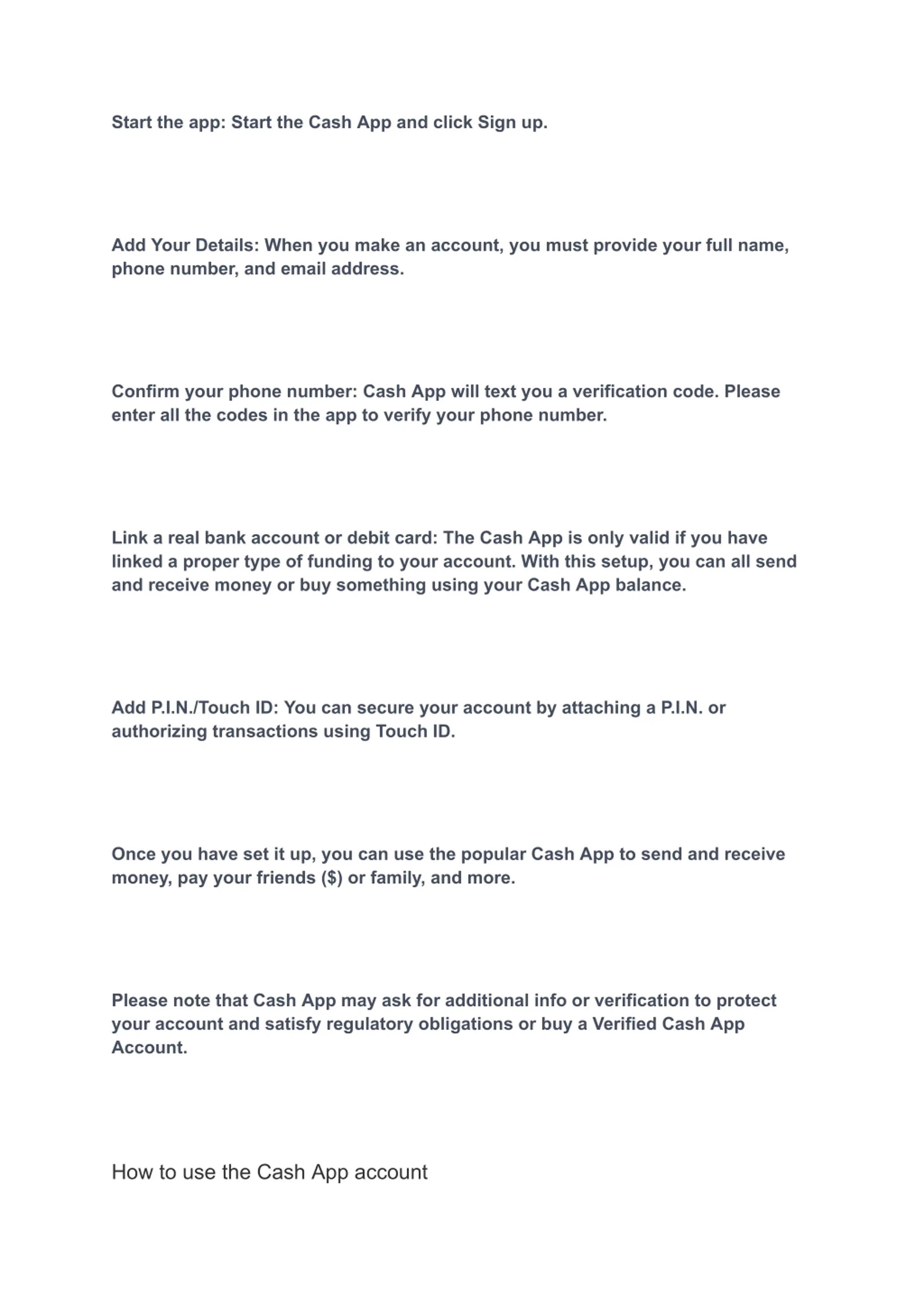 Start the app: Start the Cash App and click Sign up. Add Your Details: When you make an account, you must provide your full name, phone number, and email address. Confirm your phone number: Cash App will text you a verification code. Please enter all the codes in the app to verify your phone number. Link a real bank account or debit card: The Cash App is only valid if you have linked a proper type of funding to your account. With this setup, you can all send and receive money or buy something using your Cash App balance. Add P.I.N./Touch ID: You can secure your account by attaching a P.I.N. or authorizing transactions using Touch ID. Once you have set it up, you can use the popular Cash App to send and receive money, pay your friends ($) or family, and more. Please note that Cash App may ask for additional info or verification to protect your account and satisfy regulatory obligations or buy a Verified Cash App Account. How to use the Cash App account