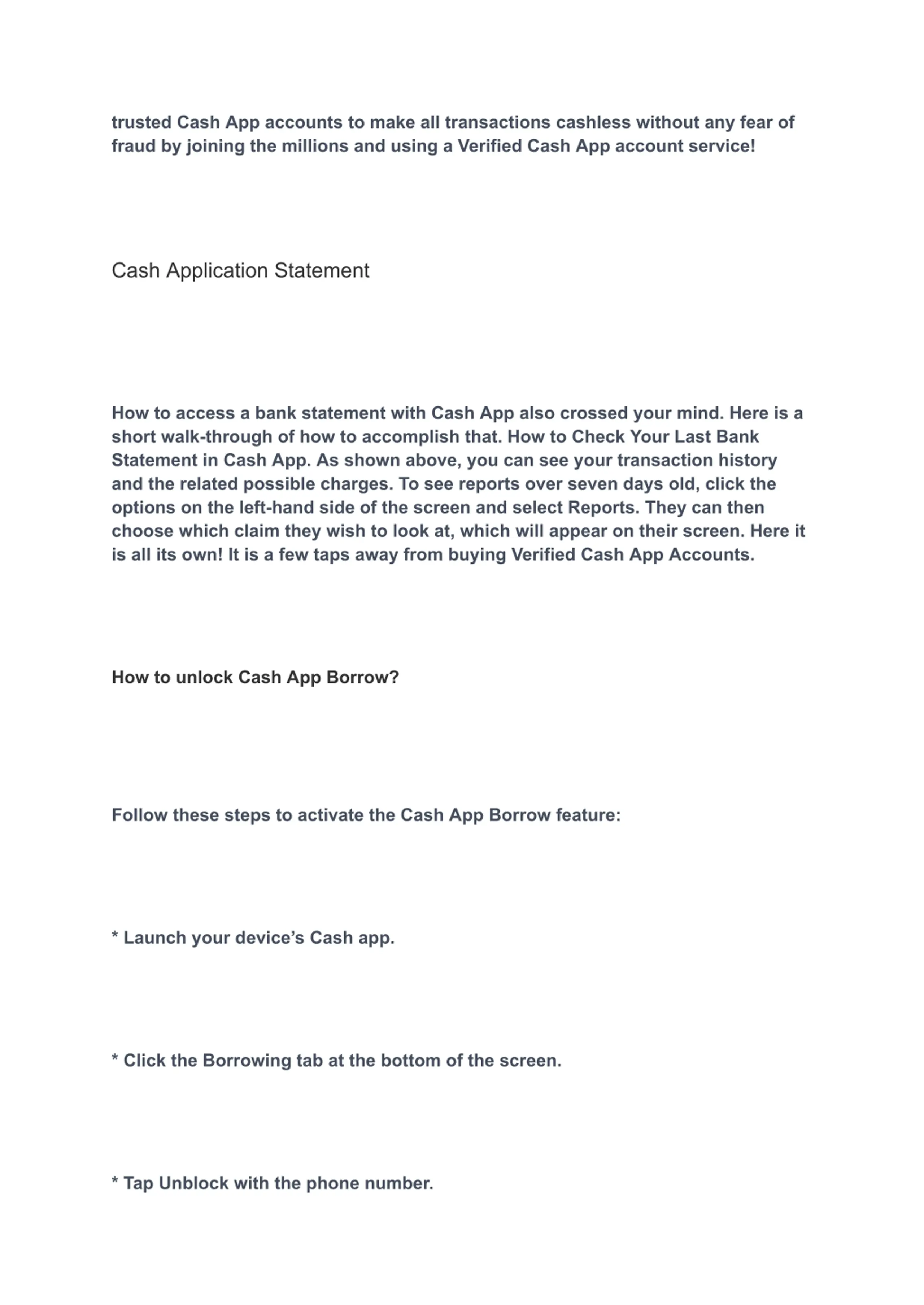 trusted Cash App accounts to make all transactions cashless without any fear of fraud by joining the millions and using a Verified Cash App account service! Cash Application Statement How to access a bank statement with Cash App also crossed your mind. Here is a short walk-through of how to accomplish that. How to Check Your Last Bank Statement in Cash App. As shown above, you can see your transaction history and the related possible charges. To see reports over seven days old, click the options on the left-hand side of the screen and select Reports. They can then choose which claim they wish to look at, which will appear on their screen. Here it is all its own! It is a few taps away from buying Verified Cash App Accounts. How to unlock Cash App Borrow? Follow these steps to activate the Cash App Borrow feature: * Launch your device s Cash app. * Click the Borrowing tab at the bottom of the screen. * Tap Unblock with the phone number.