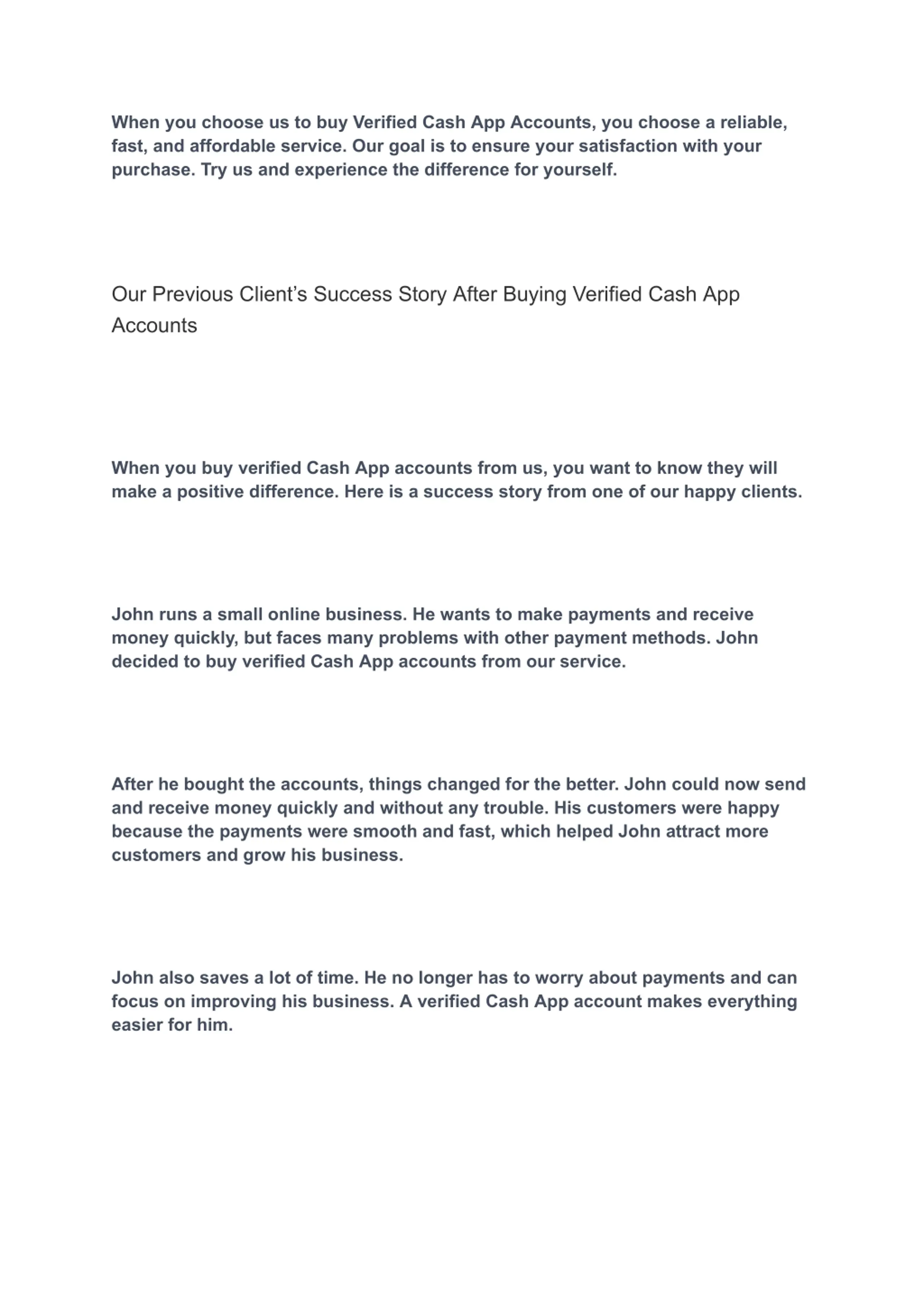 When you choose us to buy Verified Cash App Accounts, you choose a reliable, fast, and affordable service. Our goal is to ensure your satisfaction with your purchase. Try us and experience the difference for yourself. Our Previous Client s Success Story After Buying Verified Cash App Accounts When you buy verified Cash App accounts from us, you want to know they will make a positive difference. Here is a success story from one of our happy clients. John runs a small online business. He wants to make payments and receive money quickly, but faces many problems with other payment methods. John decided to buy verified Cash App accounts from our service. After he bought the accounts, things changed for the better. John could now send and receive money quickly and without any trouble. His customers were happy because the payments were smooth and fast, which helped John attract more customers and grow his business. John also saves a lot of time. He no longer has to worry about payments and can focus on improving his business. A verified Cash App account makes everything easier for him.