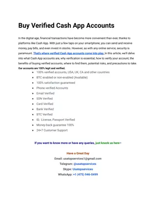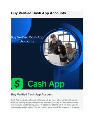 * Authentic unblocked Cash App from the United States with IP address reveal. * Fully enabled and 100% USA registered phone number for Cash App account. * Furthermore, every Cash App user comes with a lifetime stability guarantee. * Suitable for every country. * Short order processing time after order placement. * Fast and efficient customer response service all day and night. * A lifetime guarantee for replacing the covers. * 100% money-back guarantee. For more information, please get in touch with me Email: usamarketingit@gmail.com Telegram: @usamarketingit WhatsApp: +1 (501) 494-6400 https://usamarketingit.com/product/buy-verified-cash-app-accounts/ Buy Verified Cash App Accounts: A Complete Guide for Secure Transactions When you decide to buy verified Cash App account, it is essential to make sure that you are making a safe decision. Verified accounts are critical because they make business transactions easy, secure, and smooth. Cash App is a popular platform that helps users send and receive money. Moreover, you can unlock more benefits by buy verified Cash App account. These guides will discuss everything you need to know about buy verified account and how you can enjoy safe and reliable transactions. Acquiring a Cash App account with confirmation is one of the essential aspects individuals seek because of the elevated account restrictions. For instance, there is a fixed limit whereby one cannot transfer, or Cash App receives a certain amount of money without going through the verification process. However, if the verification is authenticated, this limit is developed to offer more acceptable sizes for large