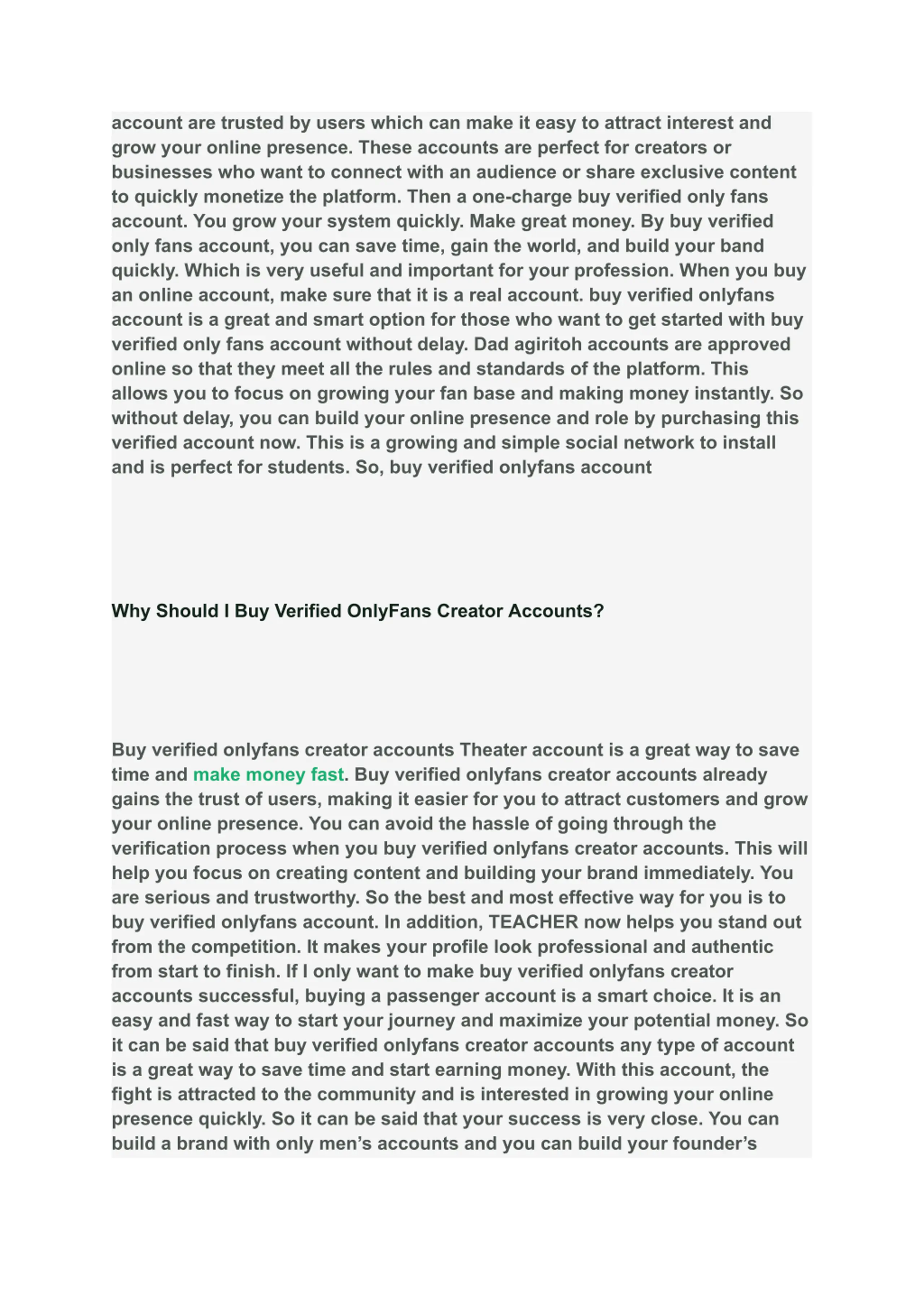 to check their feedback and ask for proof of account authenticity. 3. Social Media Communities: Join groups or forums where people sell verified accounts. Always deal with sellers who have a good reputation in the community. 4. Professional Service Providers: Some companies offer verified OnlyFans accounts as part of their services. These providers often include customer support and guarantees. Before buying, verify the account details and ensure the seller follows a secure process. Choosing the right place to buy will save you time and give you peace of mind. Start your journey with a verified OnlyFans creator account today! Are Buy Verified OnlyFans Creator Accounts Worth the Investment? If you want to save time and sell your online presence quickly, check out if a buy verifiedonly fans creator account is worth the investment. You can use it on the account without a doubt. You will never get into accounting. You can manage your business better through the account. With buy verified onlyfans creator account comes the trust and credibility needed to quickly attract followers and customers. A guy doesn t have to go through the hassle of buy verified onlyfans creator account. This allows you to focus on creating engaging content and connecting instantly with your audience whose accounts want your profile to look professional, giving you an edge over the competition. Investing pays off by helping you build trust, heal, and make money fast. Buy verified onlyfans creator account national account is a smart and practical choice for anyone serious about buy verified onlyfans creator account success. So without delay buy verified onlyfans creator account today and grow your business fast. This account will help you progress faster. And earn more money in your business.