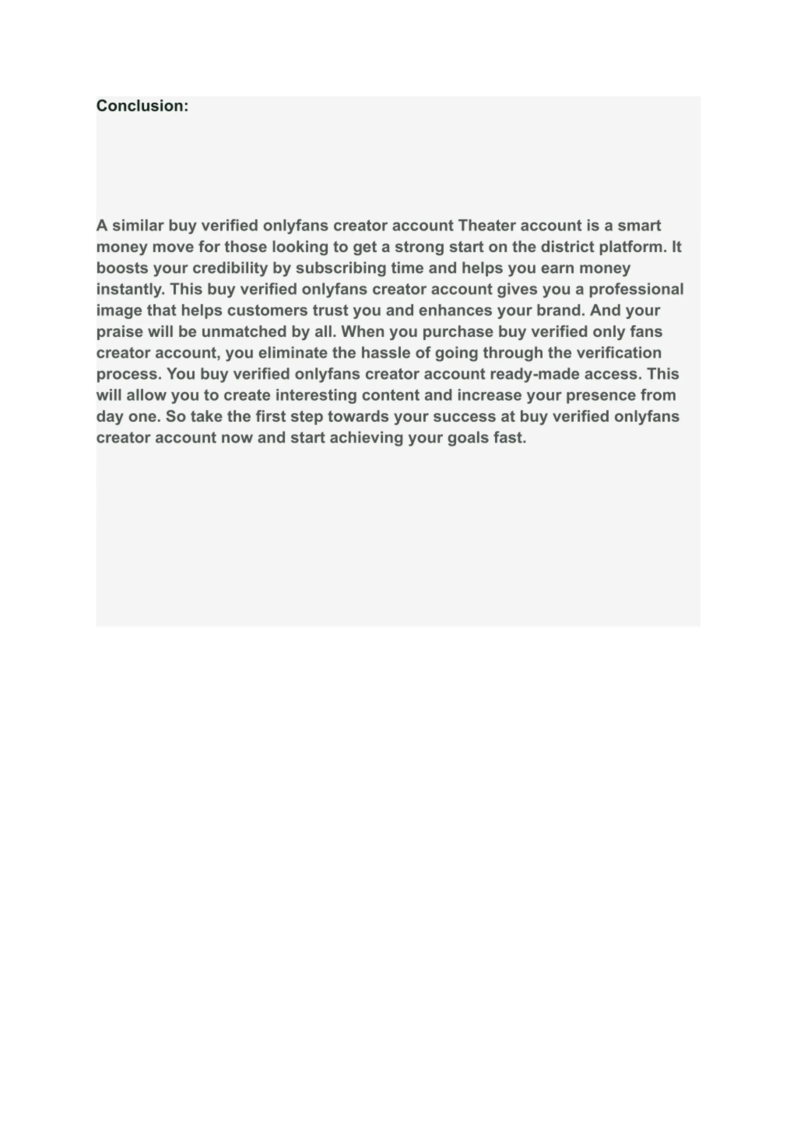 Conclusion: A similar buy verified onlyfans creator account Theater account is a smart money move for those looking to get a strong start on the district platform. It boosts your credibility by subscribing time and helps you earn money instantly. This buy verified onlyfans creator account gives you a professional image that helps customers trust you and enhances your brand. And your praise will be unmatched by all. When you purchase buy verified only fans creator account, you eliminate the hassle of going through the verification process. You buy verified onlyfans creator account ready-made access. This will allow you to create interesting content and increase your presence from day one. So take the first step towards your success at buy verified onlyfans creator account now and start achieving your goals fast.