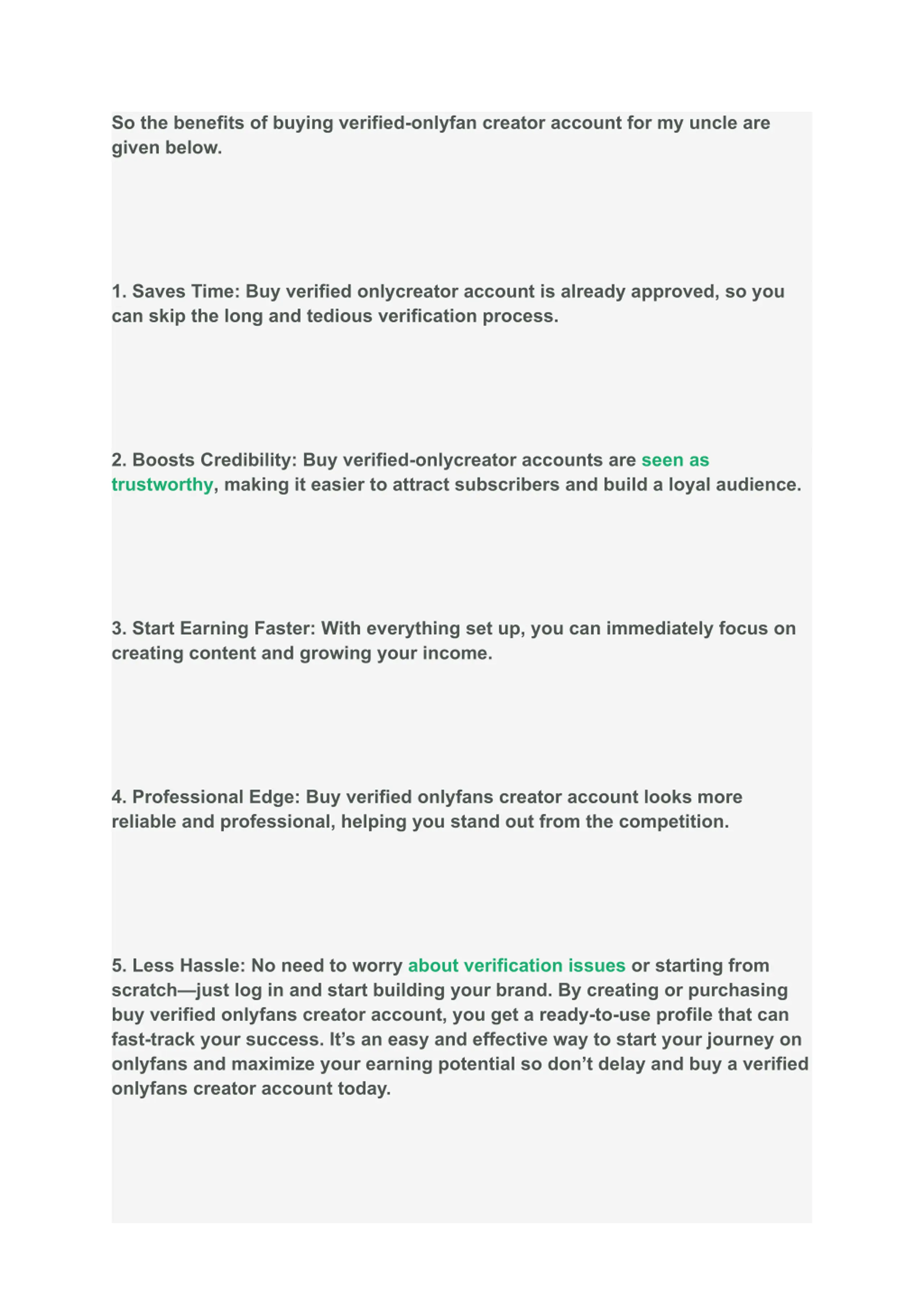 So the benefits of buying verified-onlyfan creator account for my uncle are given below. 1. Saves Time: Buy verified onlycreator account is already approved, so you can skip the long and tedious verification process. 2. Boosts Credibility: Buy verified-onlycreator accounts are seen as trustworthy, making it easier to attract subscribers and build a loyal audience. 3. Start Earning Faster: With everything set up, you can immediately focus on creating content and growing your income. 4. Professional Edge: Buy verified onlyfans creator account looks more reliable and professional, helping you stand out from the competition. 5. Less Hassle: No need to worry about verification issues or starting from scratch just log in and start building your brand. By creating or purchasing buy verified onlyfans creator account, you get a ready-to-use profile that can fast-track your success. It s an easy and effective way to start your journey on onlyfans and maximize your earning potential so don t delay and buy a verified onlyfans creator account today.