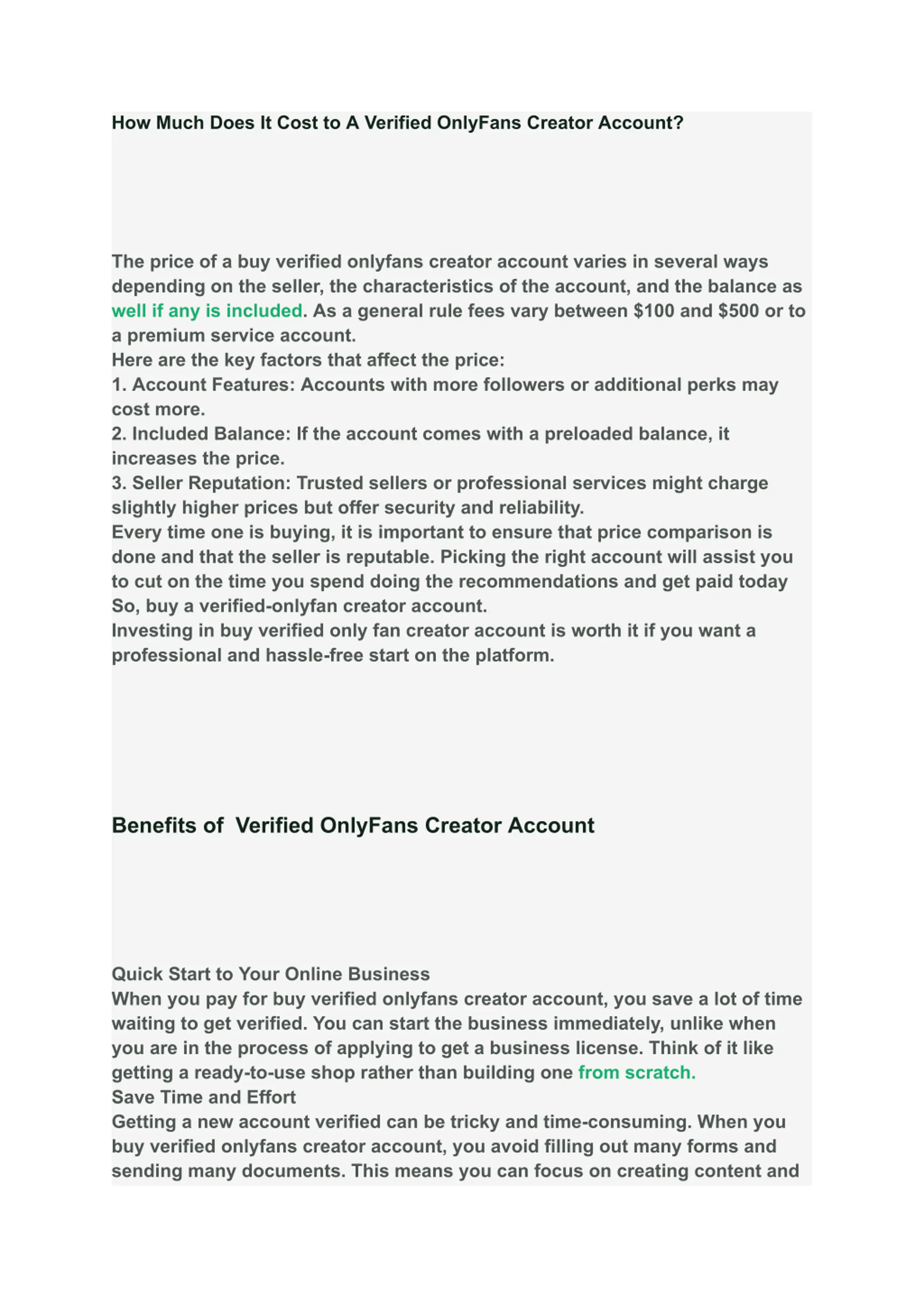 How Much Does It Cost to A Verified OnlyFans Creator Account? The price of a buy verified onlyfans creator account varies in several ways depending on the seller, the characteristics of the account, and the balance as well if any is included. As a general rule fees vary between $100 and $500 or to a premium service account. Here are the key factors that affect the price: 1. Account Features: Accounts with more followers or additional perks may cost more. 2. Included Balance: If the account comes with a preloaded balance, it increases the price. 3. Seller Reputation: Trusted sellers or professional services might charge slightly higher prices but offer security and reliability. Every time one is buying, it is important to ensure that price comparison is done and that the seller is reputable. Picking the right account will assist you to cut on the time you spend doing the recommendations and get paid today So, buy a verified-onlyfan creator account. Investing in buy verified only fan creator account is worth it if you want a professional and hassle-free start on the platform. Benefits of Verified OnlyFans Creator Account Quick Start to Your Online Business When you pay for buy verified onlyfans creator account, you save a lot of time waiting to get verified. You can start the business immediately, unlike when you are in the process of applying to get a business license. Think of it like getting a ready-to-use shop rather than building one from scratch. Save Time and Effort Getting a new account verified can be tricky and time-consuming. When you buy verified onlyfans creator account, you avoid filling out many forms and sending many documents. This means you can focus on creating content and